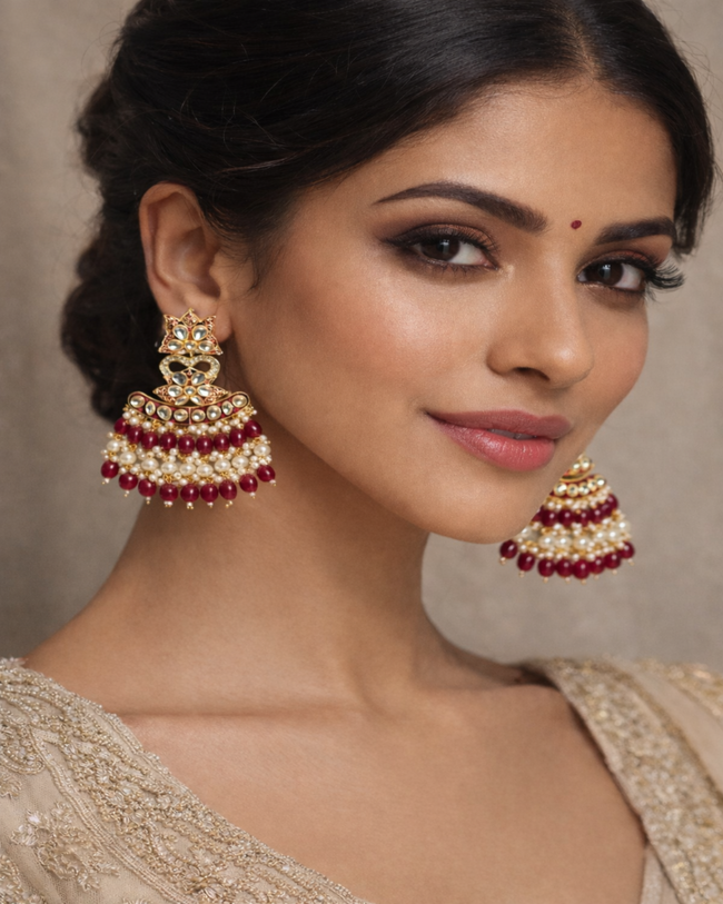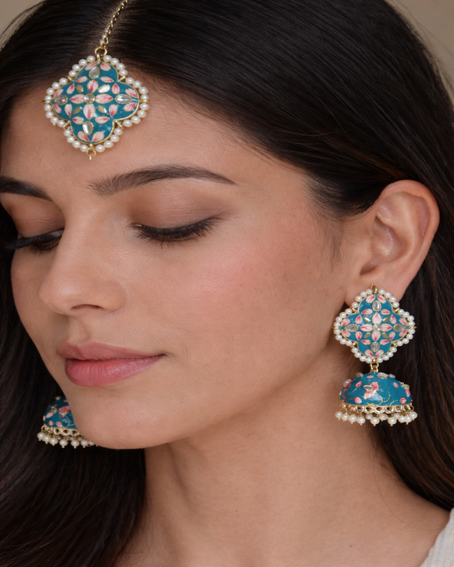Gold Tone set Studded With Unique Hand Crafted Meena kundan, good quality Beads and Pearls. Earrings length 6cm (Lightweight) with post back findings for pierced ears. Weight:Light Base : High grade alloy metal ALL THE...
