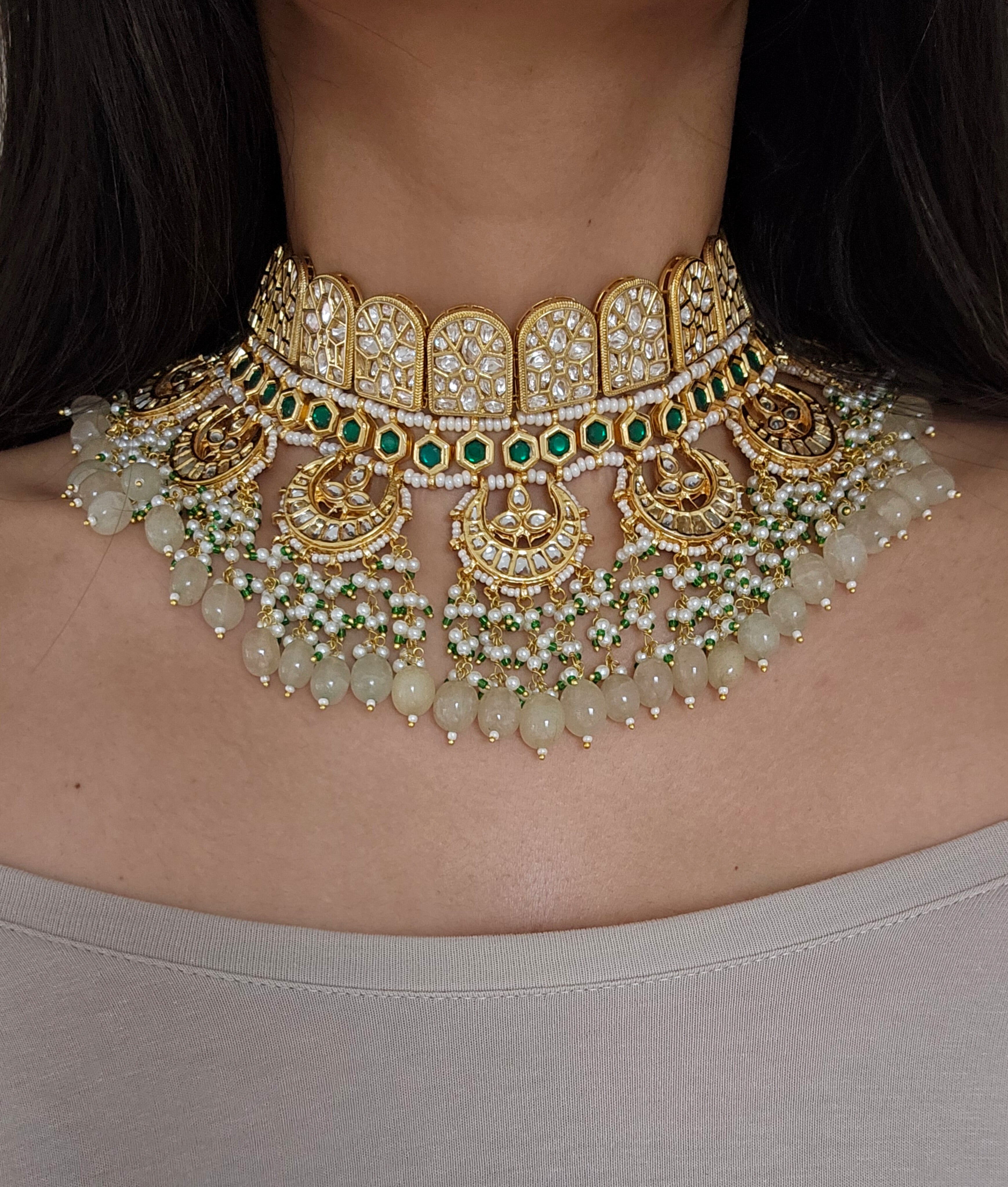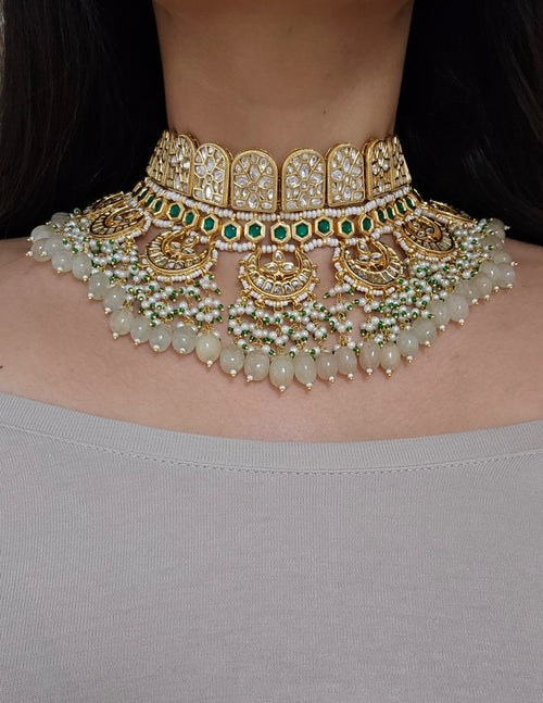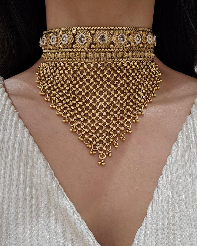 Gold tone Sheesha kundan choker set studded with kundan stones, faux pearls and beads.Weight:LightEarrings Length- 6cm dropThis set includes a pair of matching earrings, tikka to complete the look.