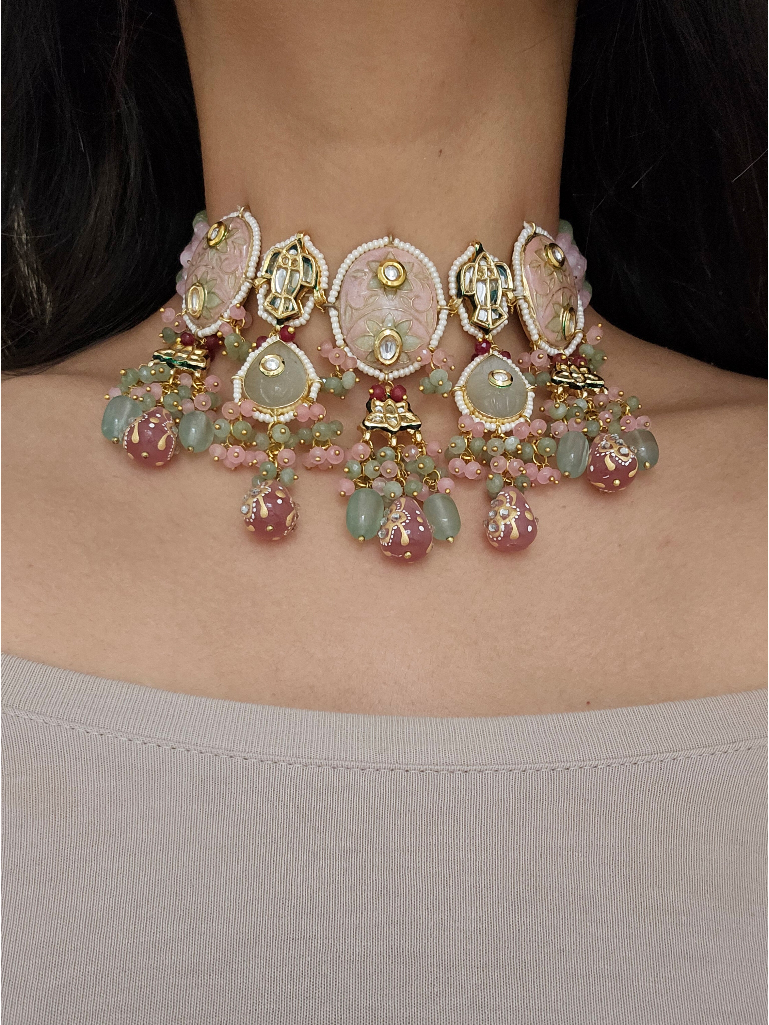 Gold Tone Choker set Studded With Unique Hand Crafted Meena kundan, premium quality Beads and Pearls. Earrings length 9cm (Lightweight) with post back findings for pierced ears. Weight:Light Base : High grade alloy metal ALL...