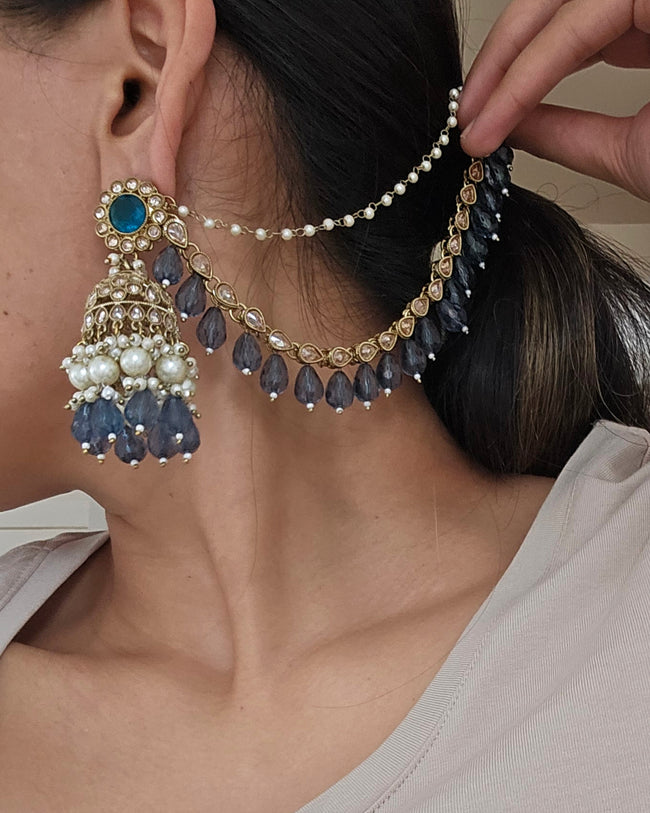 Gold Tone Earrings Studded With Polkis and Faux Pearls. Measures approx : 4cm (L) with long ear chains and post back findings for pierced ears.Chains are removable.Base : High grade alloy metal