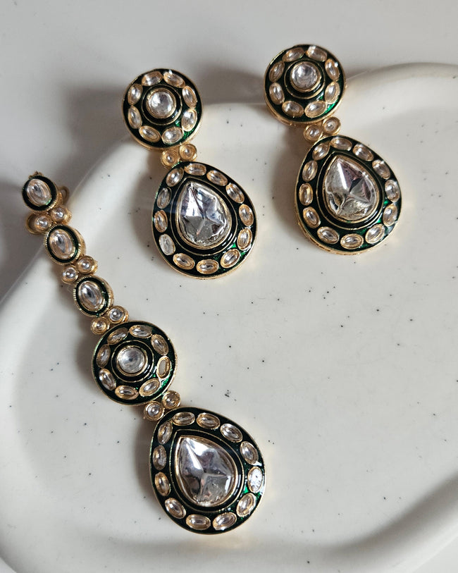 -Gold metal plated kundan mirror set -lightweight-Earrings Length; 6cm-This set also includes a pair of matching earrings and tikka to complete the look