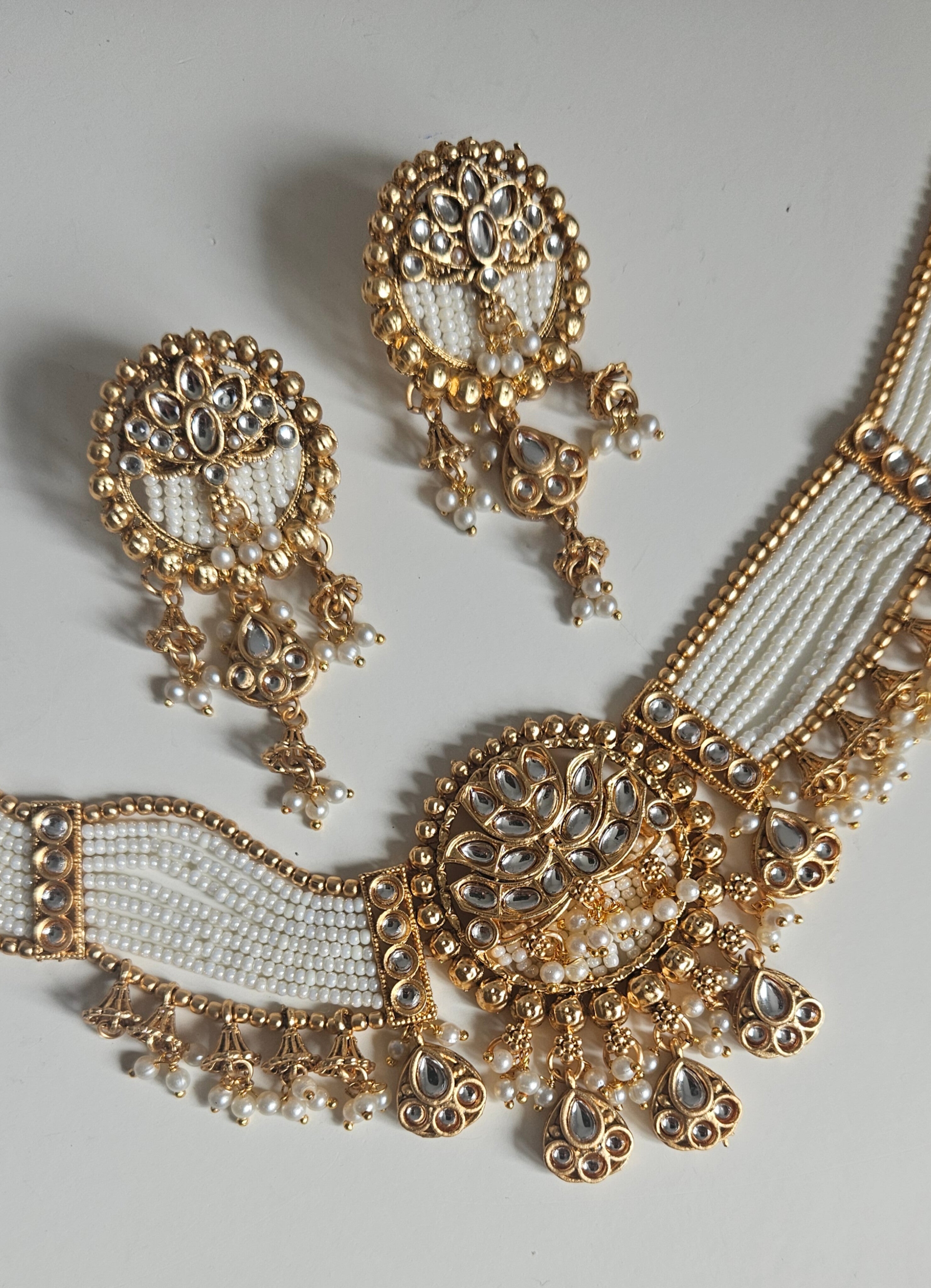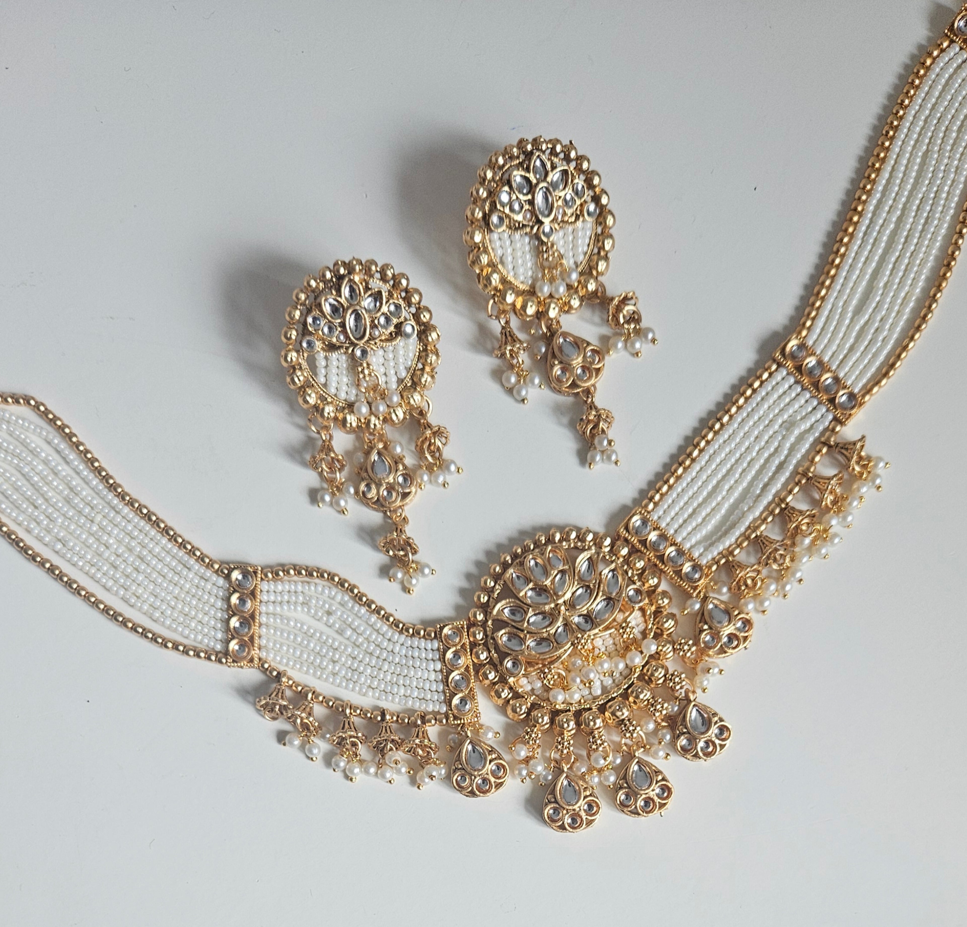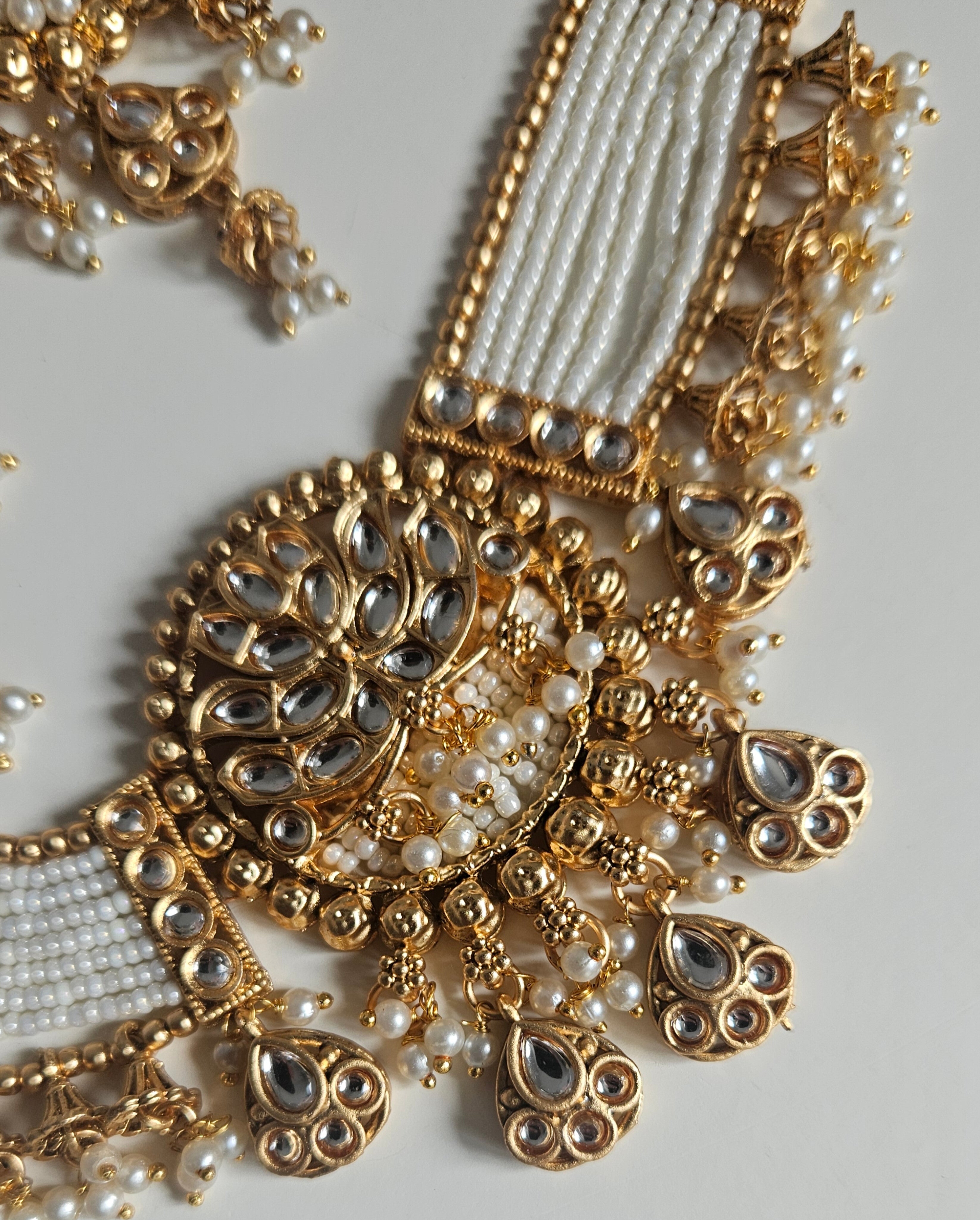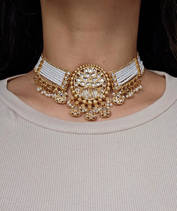 The necklace is crafted with multiple layers of finely beaded gold balls, creating a rich, textured look that sits gracefully around the neckline. Its subtle curve and symmetrical finish add a touch of sophistication, making it perfect for both traditional and contemporary outfits.