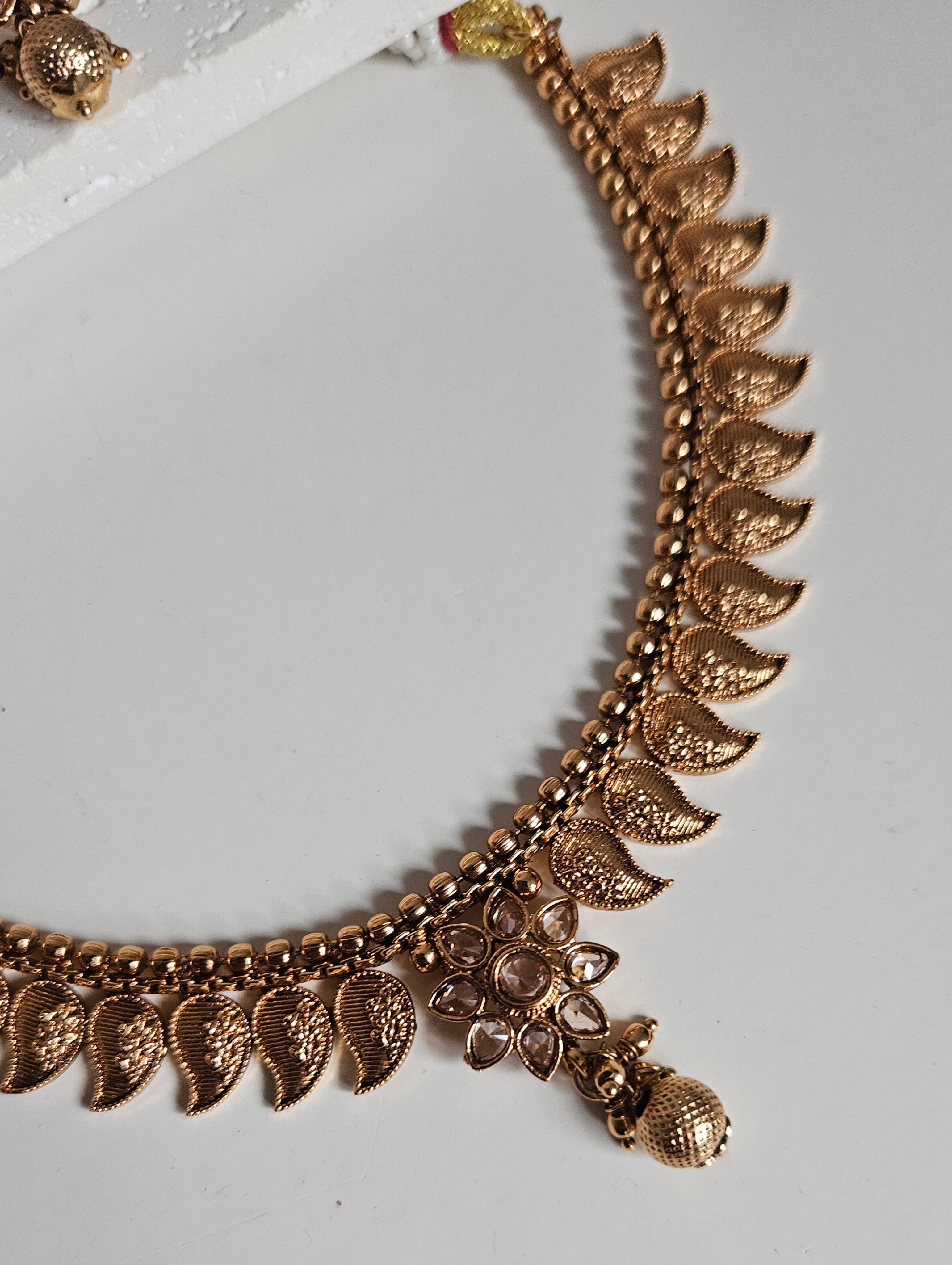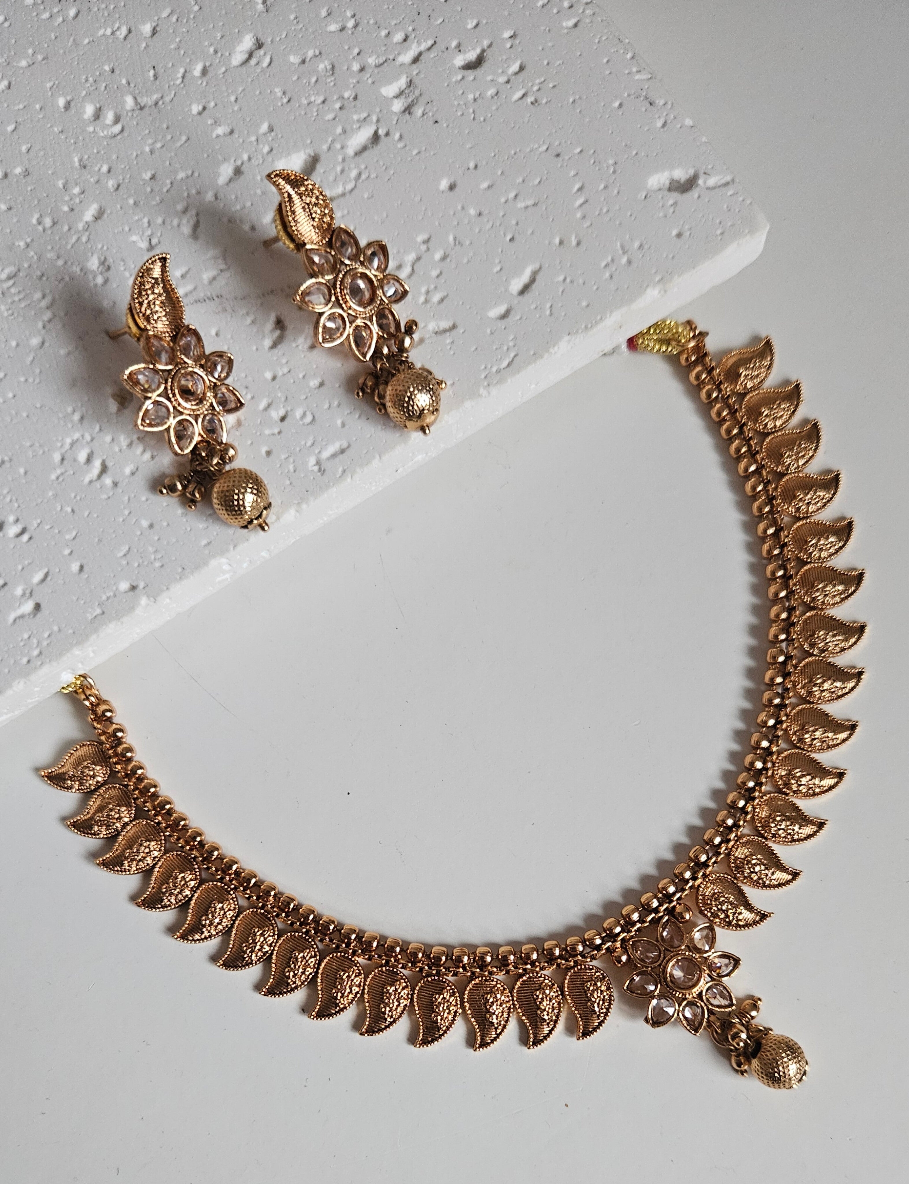 This is a traditional Polki-inspired gold necklace set featuring intricate detailing. The necklace has a beautiful row of textured paisley-shaped motifs arranged closely along the front, giving it a classic ethnic look. At the center, it includes a small floral Polki cluster with uncut-style stones and a dangling gold bead for a delicate finish.