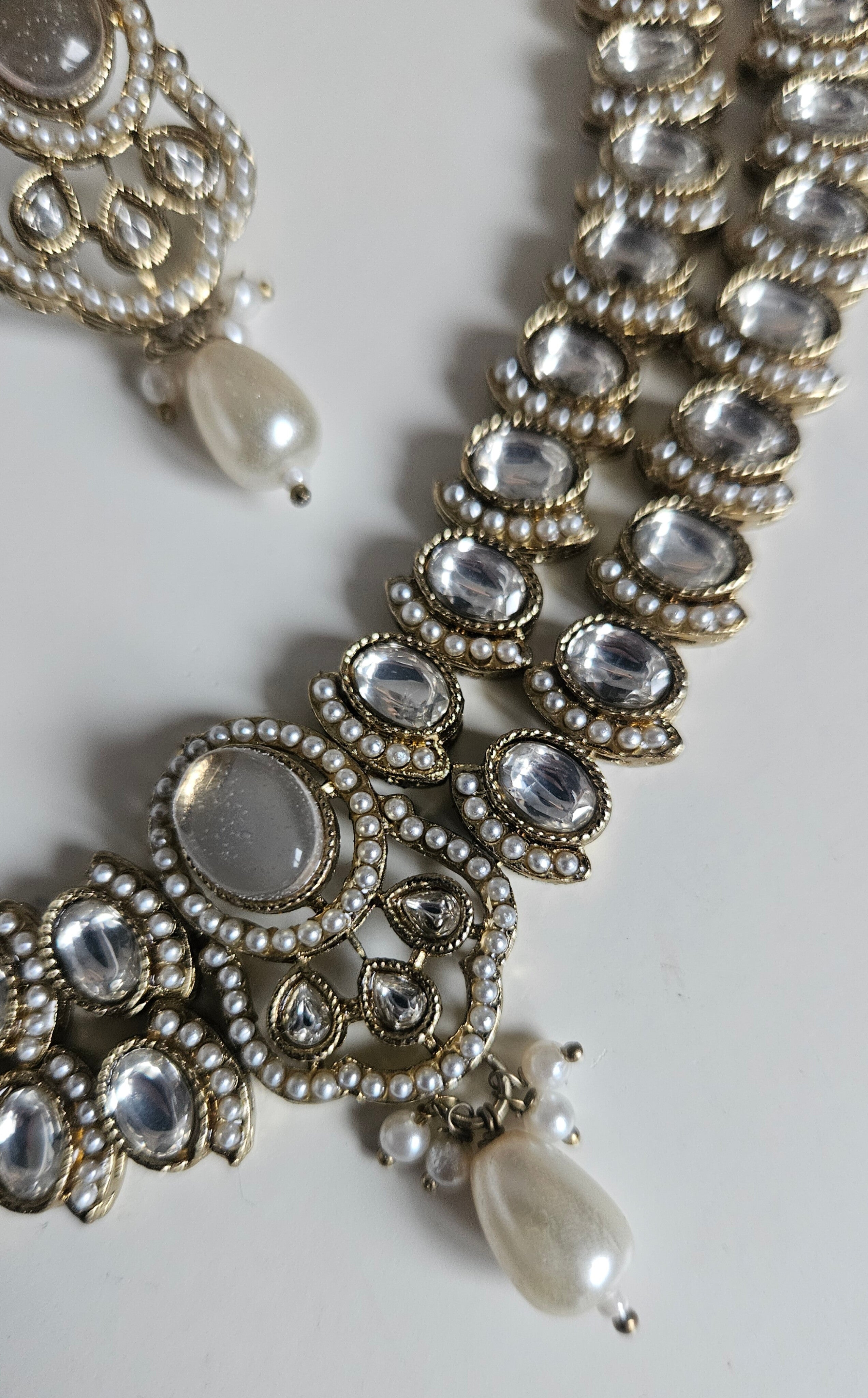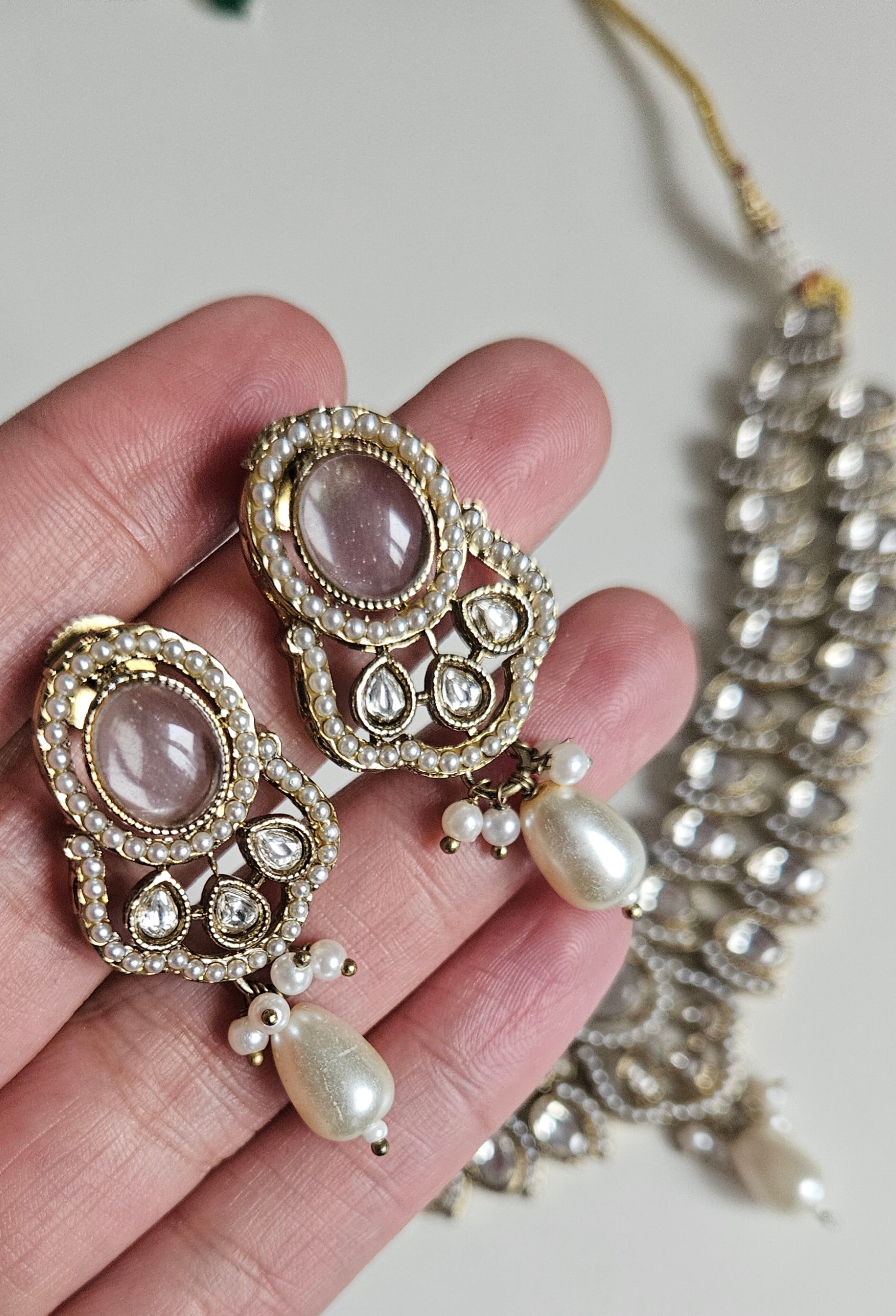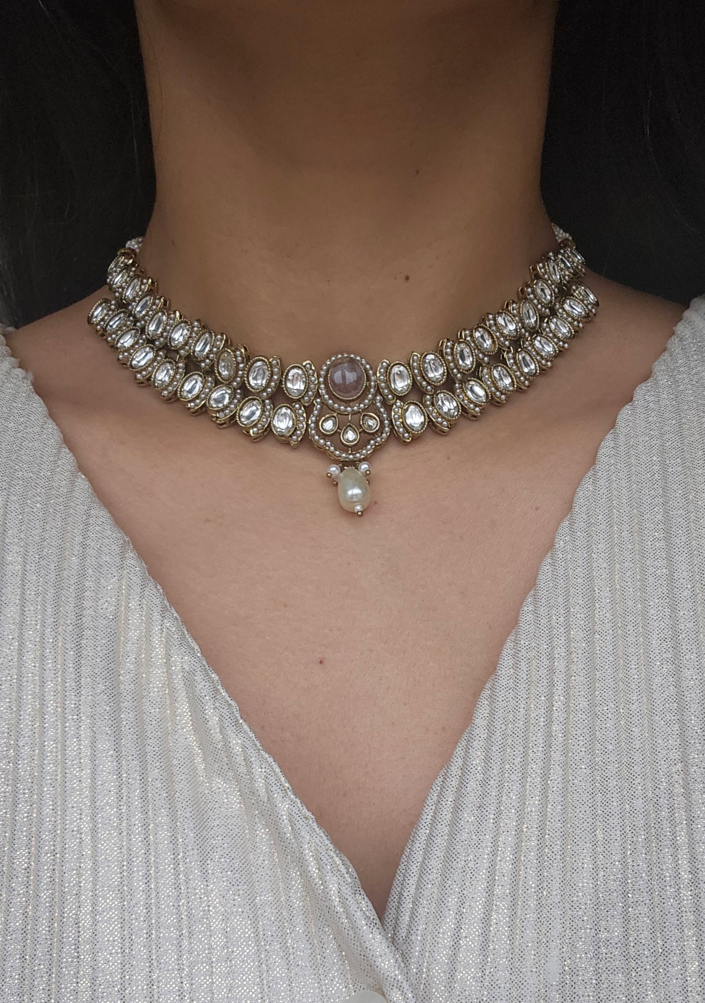 The subtle pearl detailing gives a royal yet minimal look, pairing beautifully with sarees, suits, lehengas, or even fusion outfits.