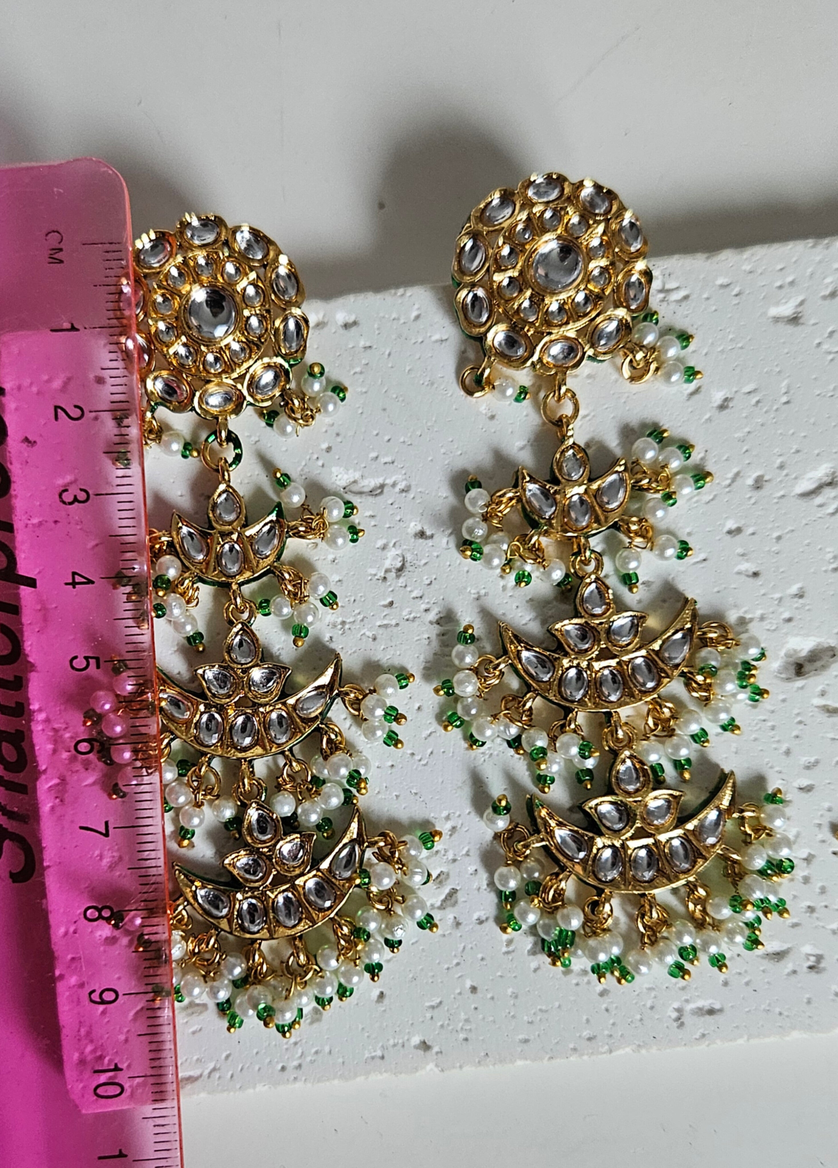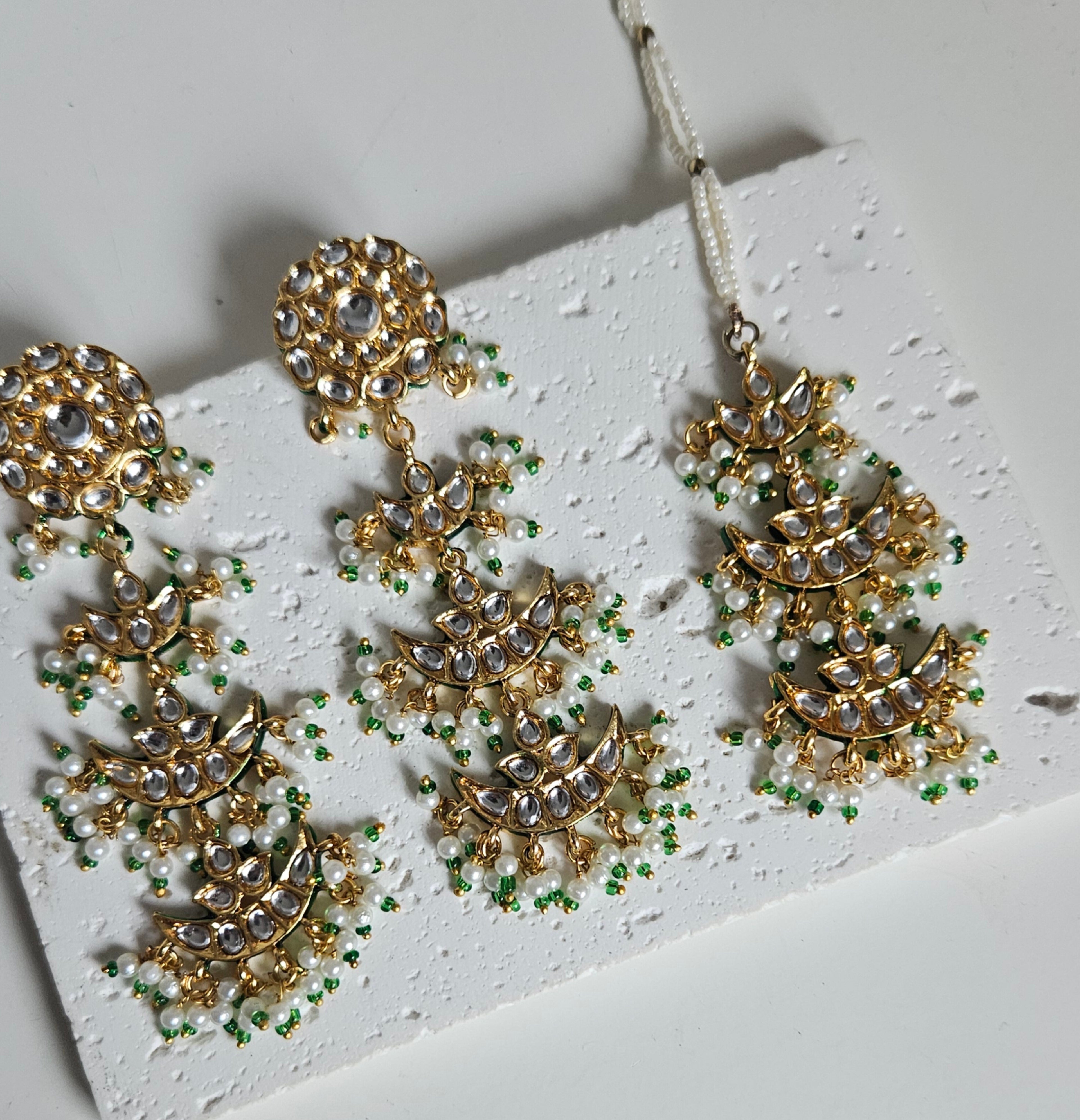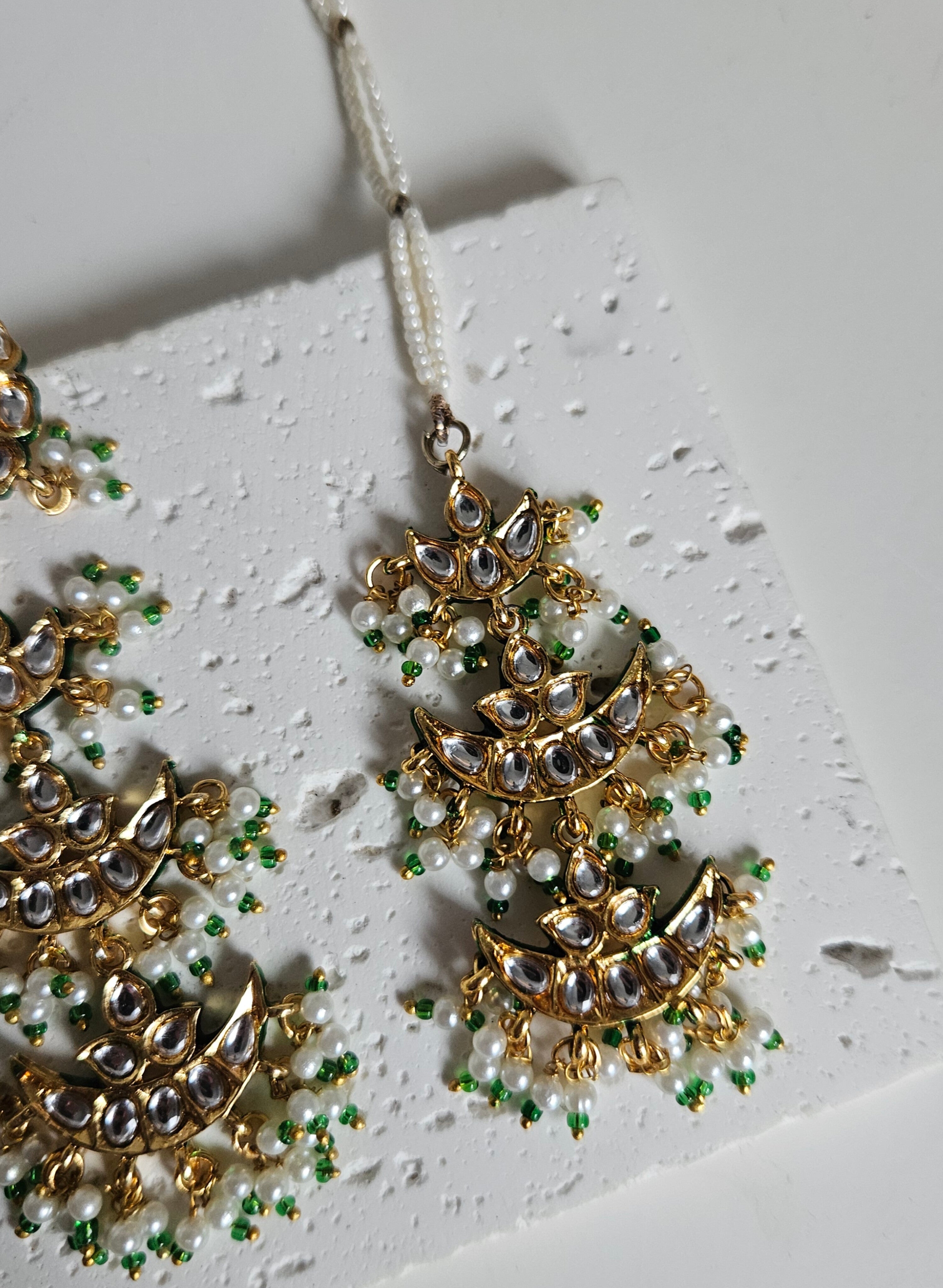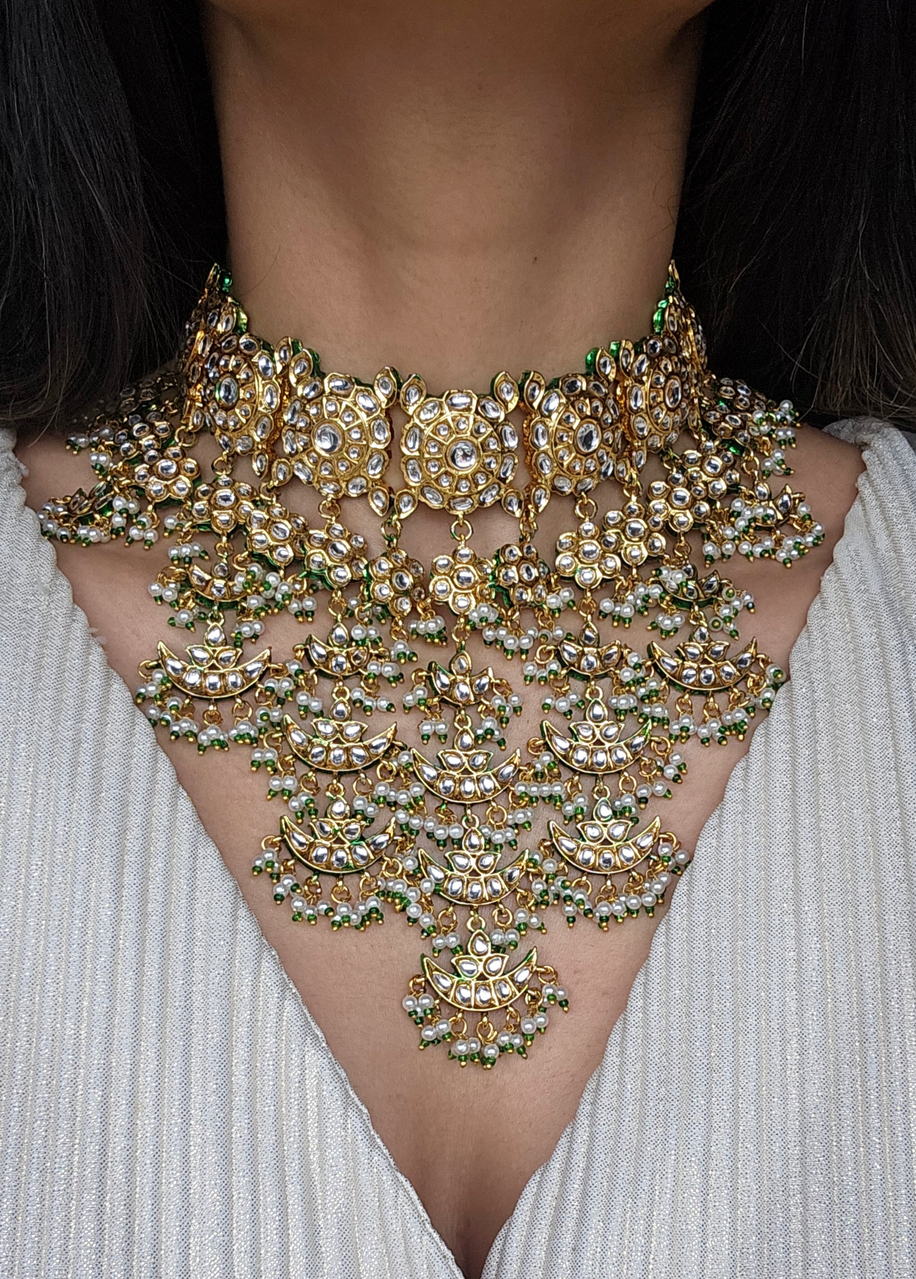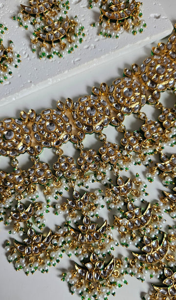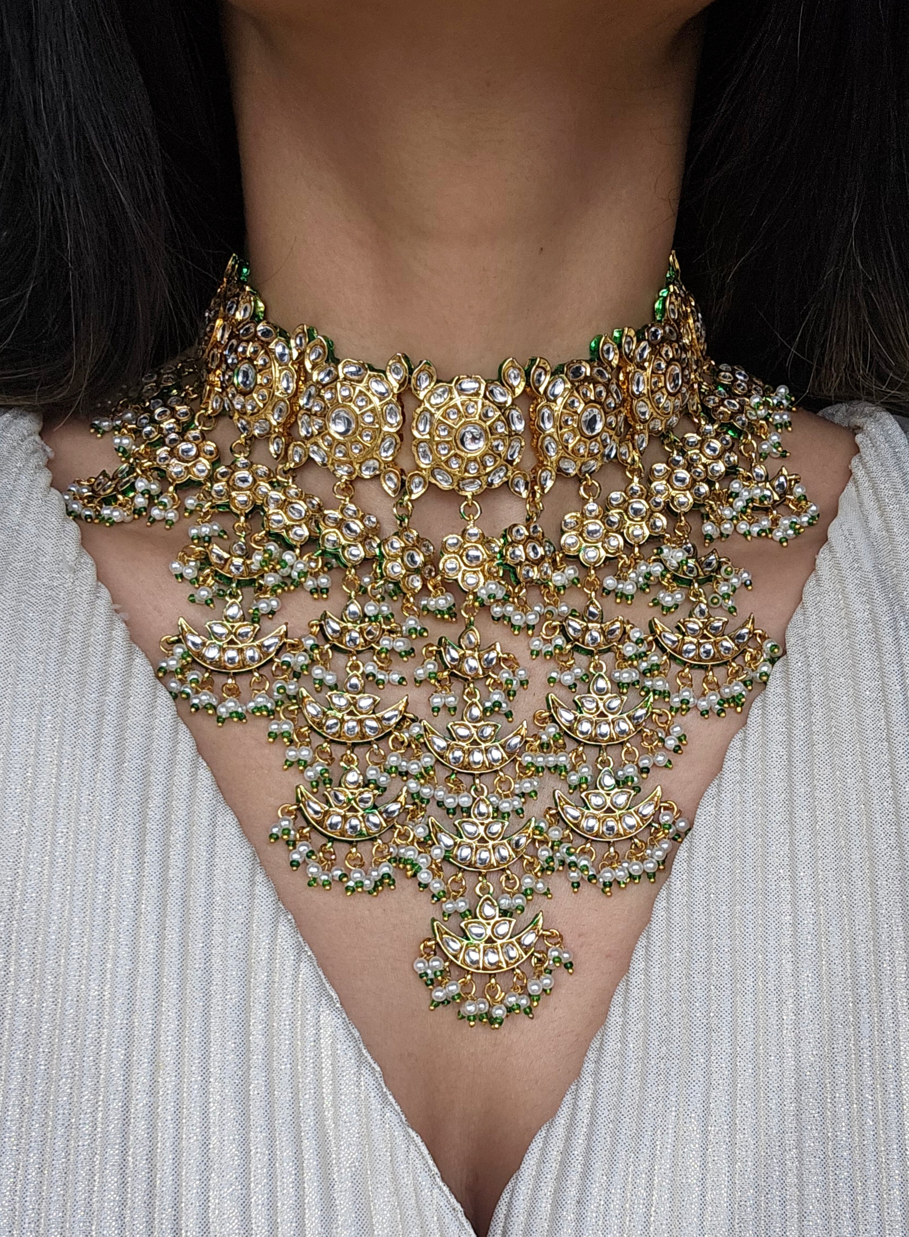 This exquisite kundan bridal or non bridal set features a finely crafted gold-tone choker adorned with high-shine kundan stones arranged in layered crescent patterns. The design flows beautifully with multiple dangling panels, finished with delicate pearl clusters and emerald-green bead drops that add softness and movement.
