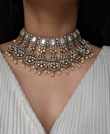 The necklace is crafted with a flexible structure, allowing it to be styled as a regal choker or worn slightly lower as a statement necklace — giving you versatile styling options to suit your outfit and neckline.