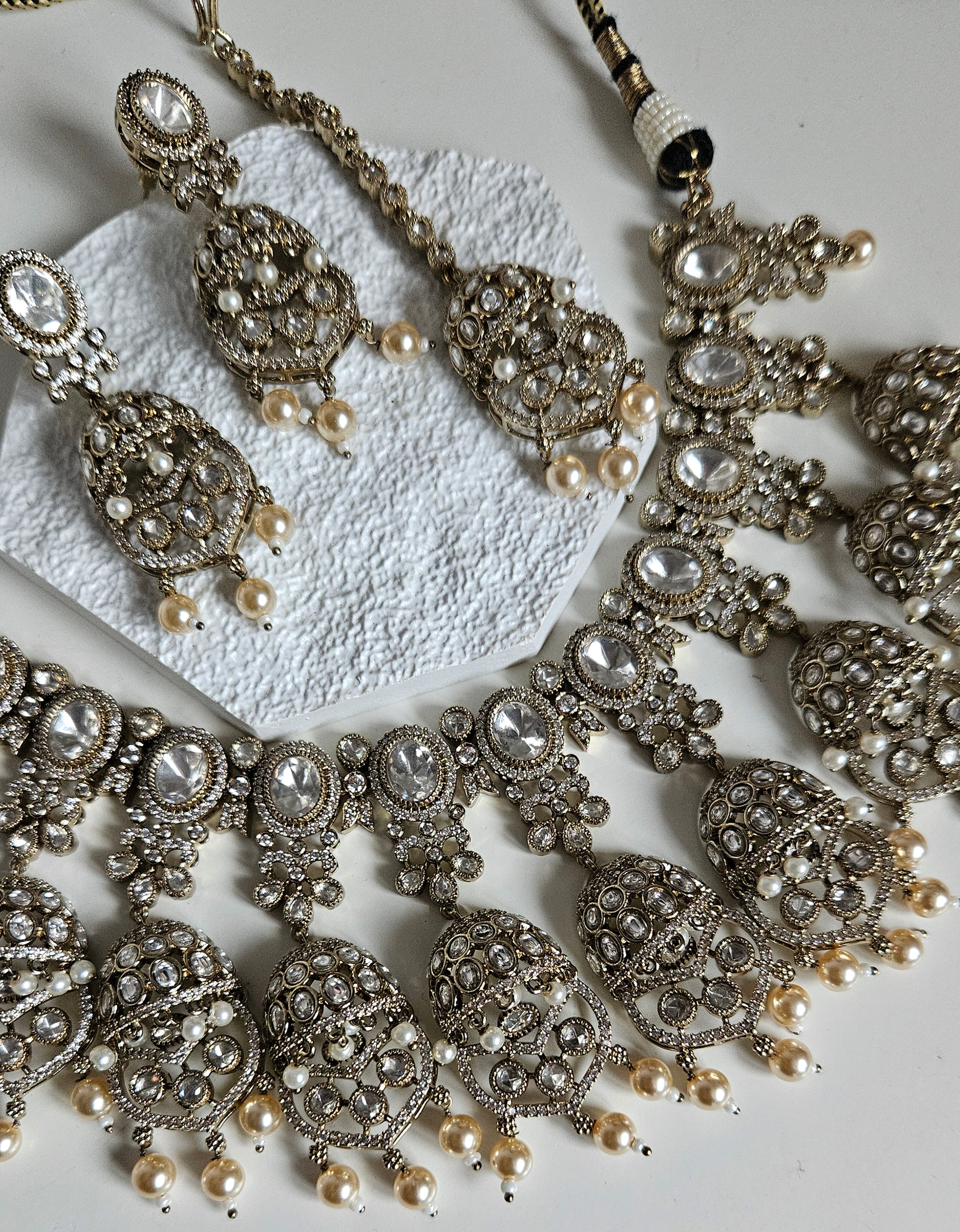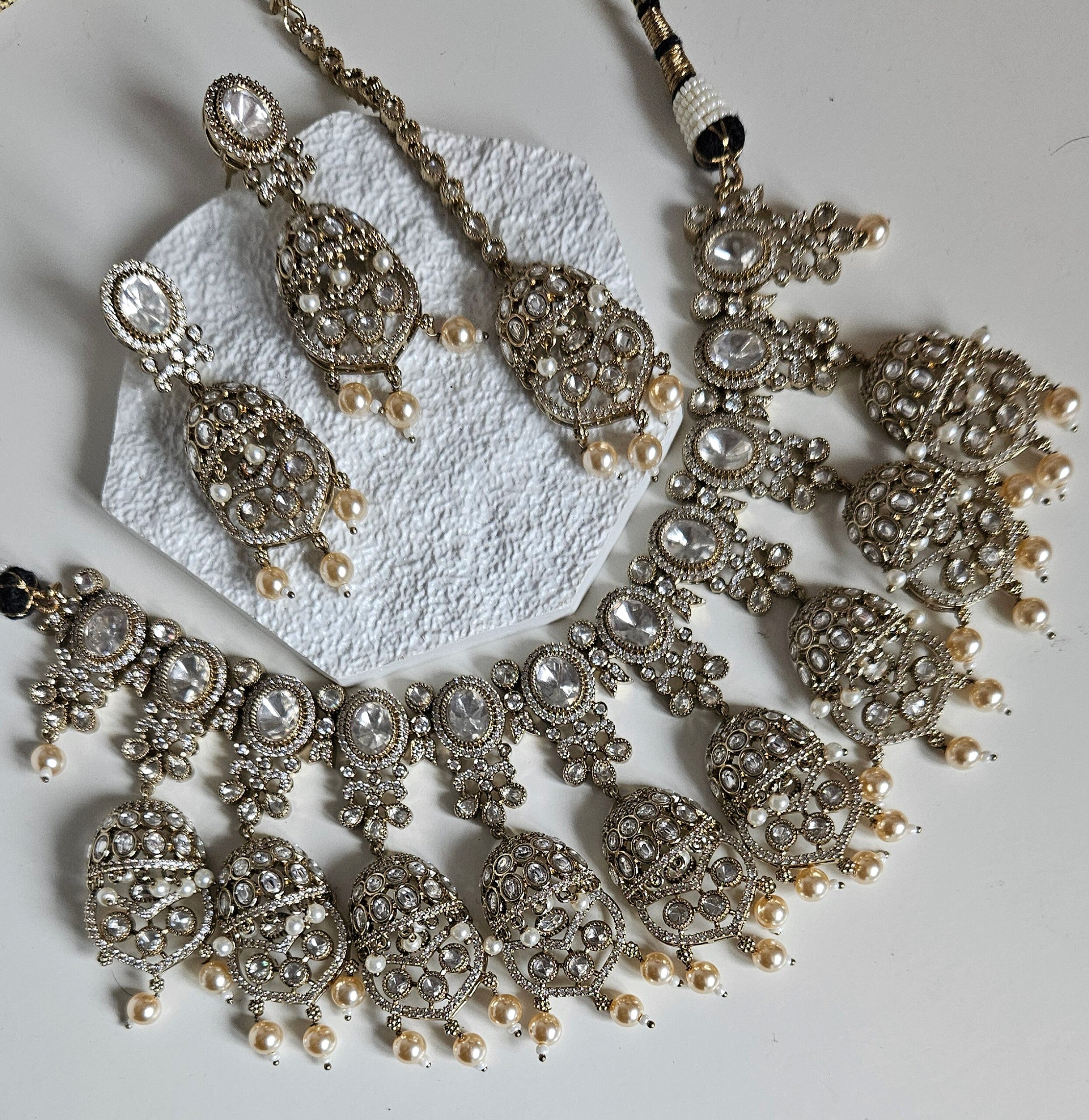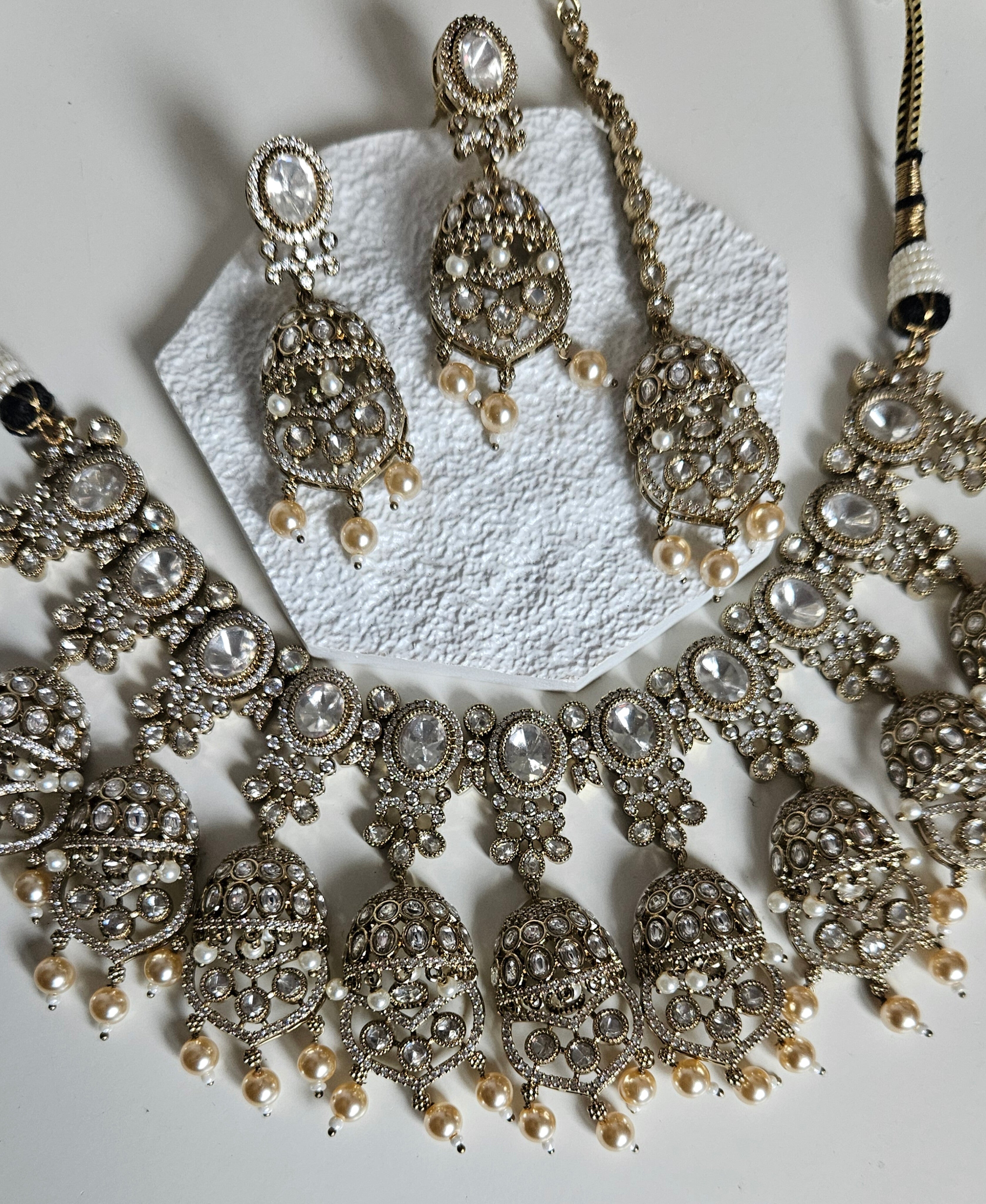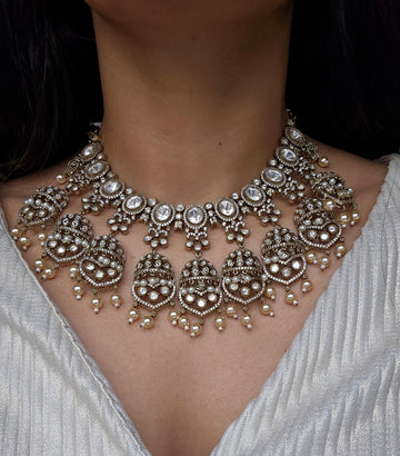 An elegant and timeless Moissanite Kundan set designed to make a statement for bridal, semi-bridal, and special occasion looks. Featuring brilliant oval moissanite stones set in intricate antique gold detailing, this set is beautifully finished with soft pearl drops for a graceful, traditional touch.