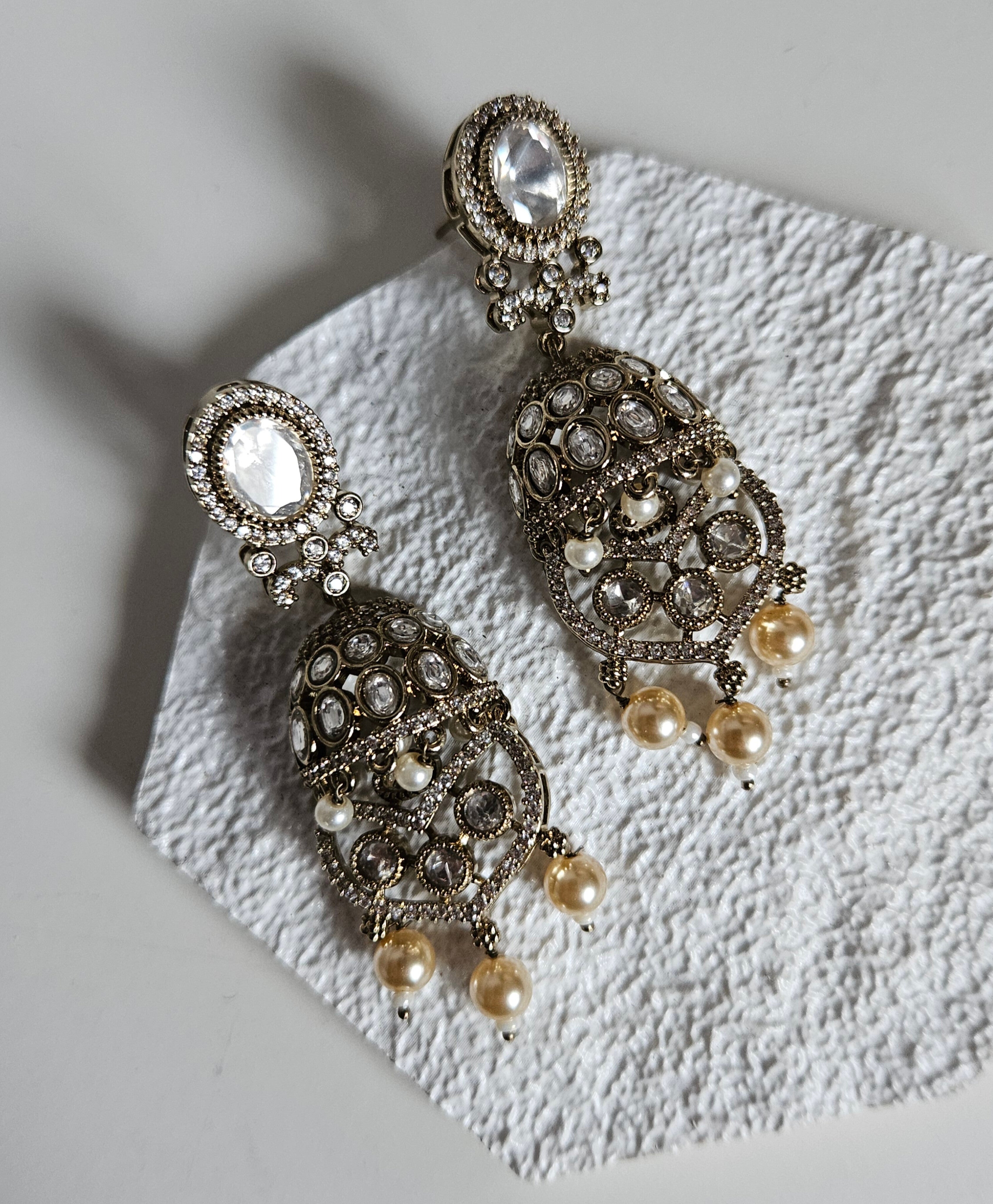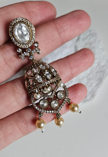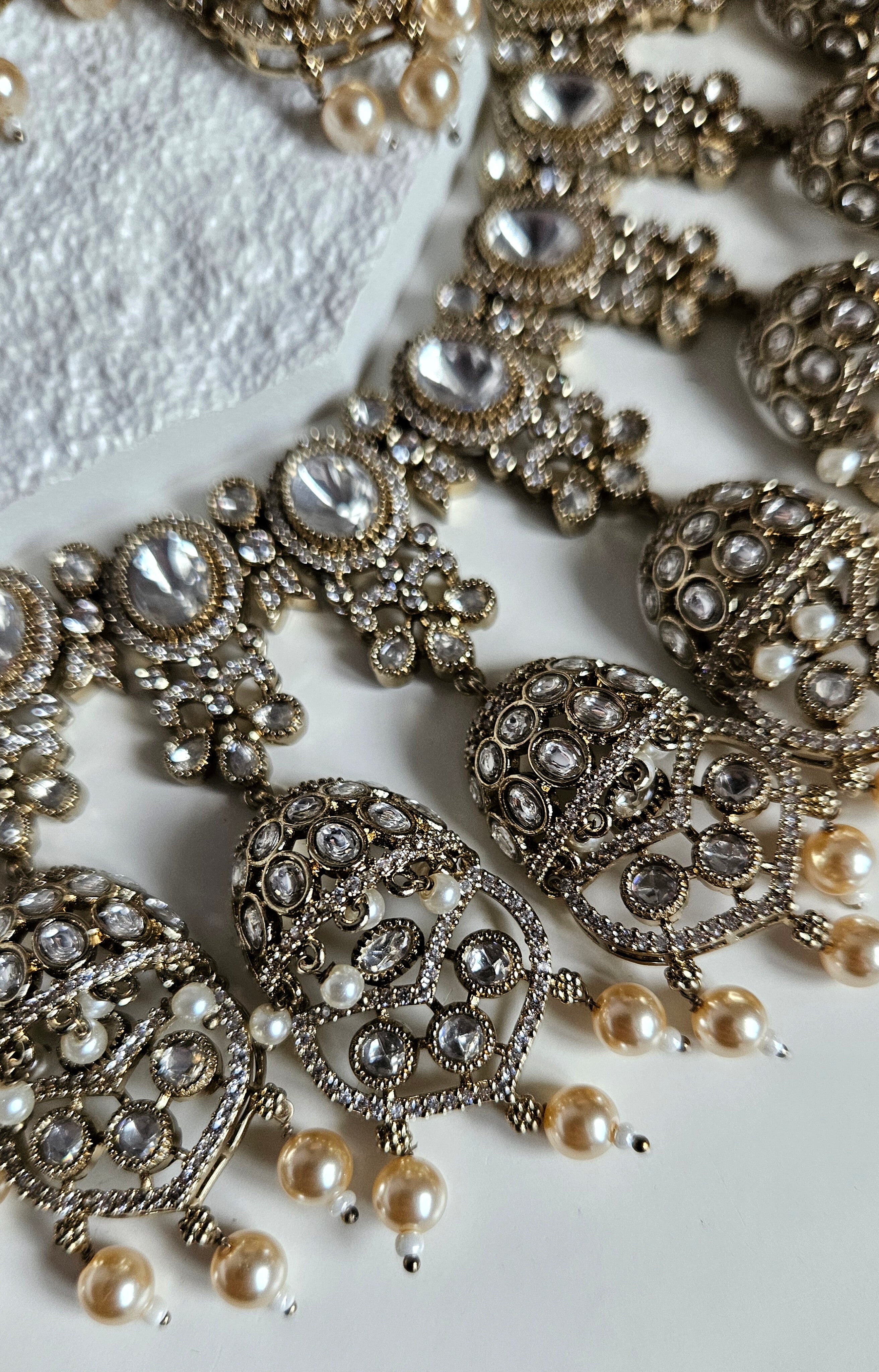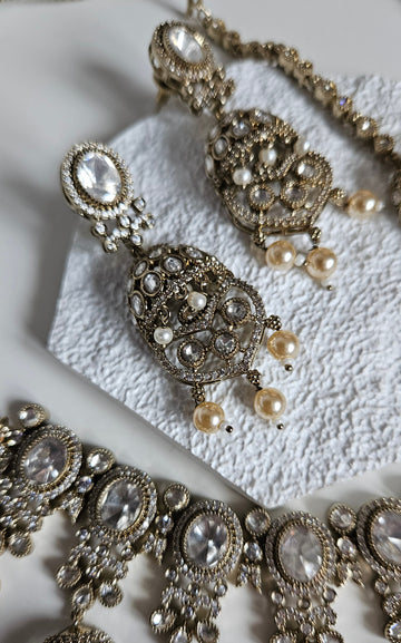 An elegant and timeless Moissanite Kundan set designed to make a statement for bridal, semi-bridal, and special occasion looks. Featuring brilliant oval moissanite stones set in intricate antique gold detailing, this set is beautifully finished with soft pearl drops for a graceful, traditional touch.