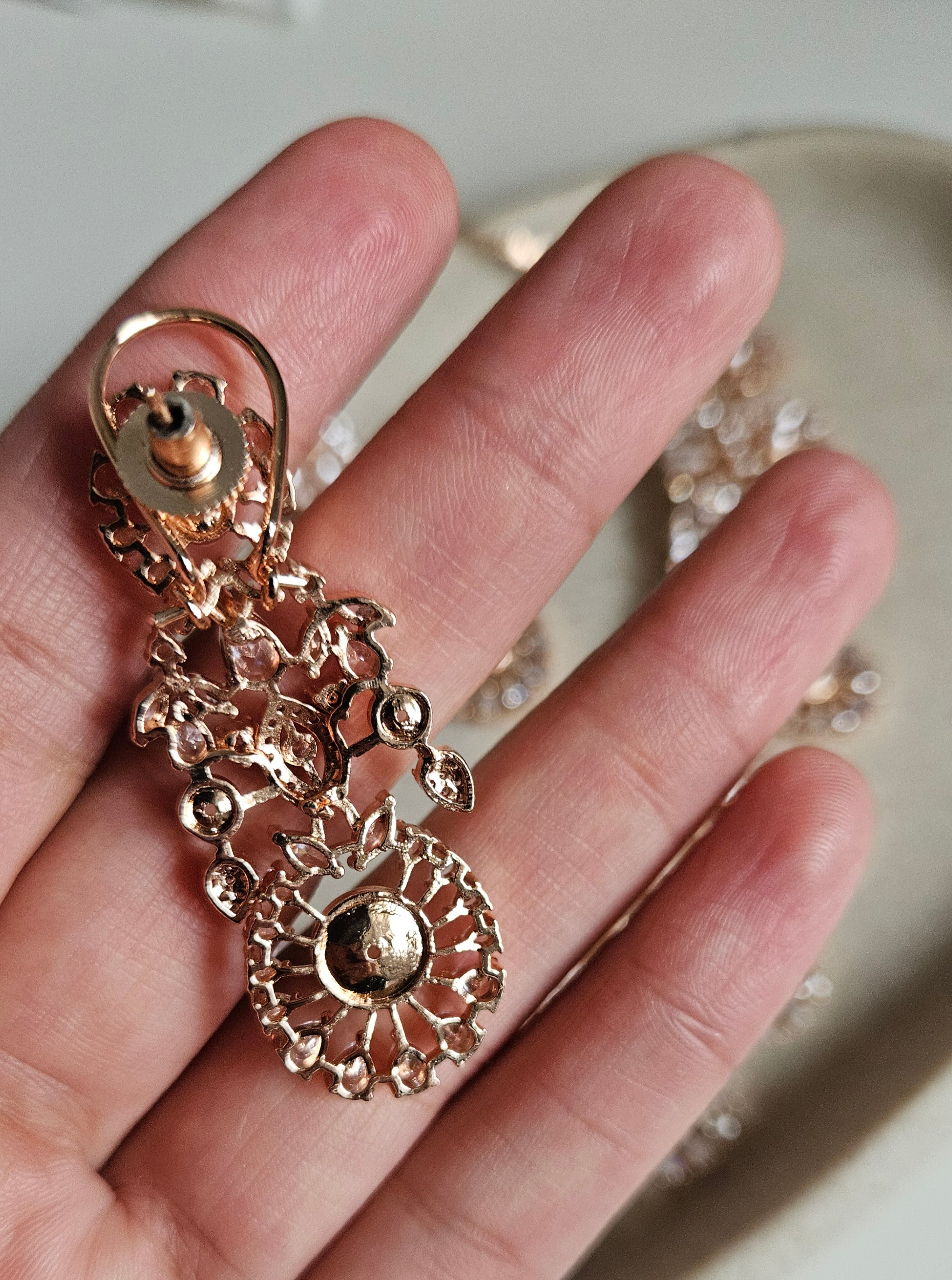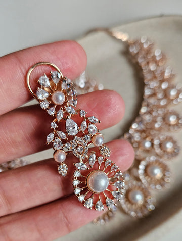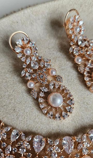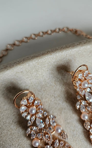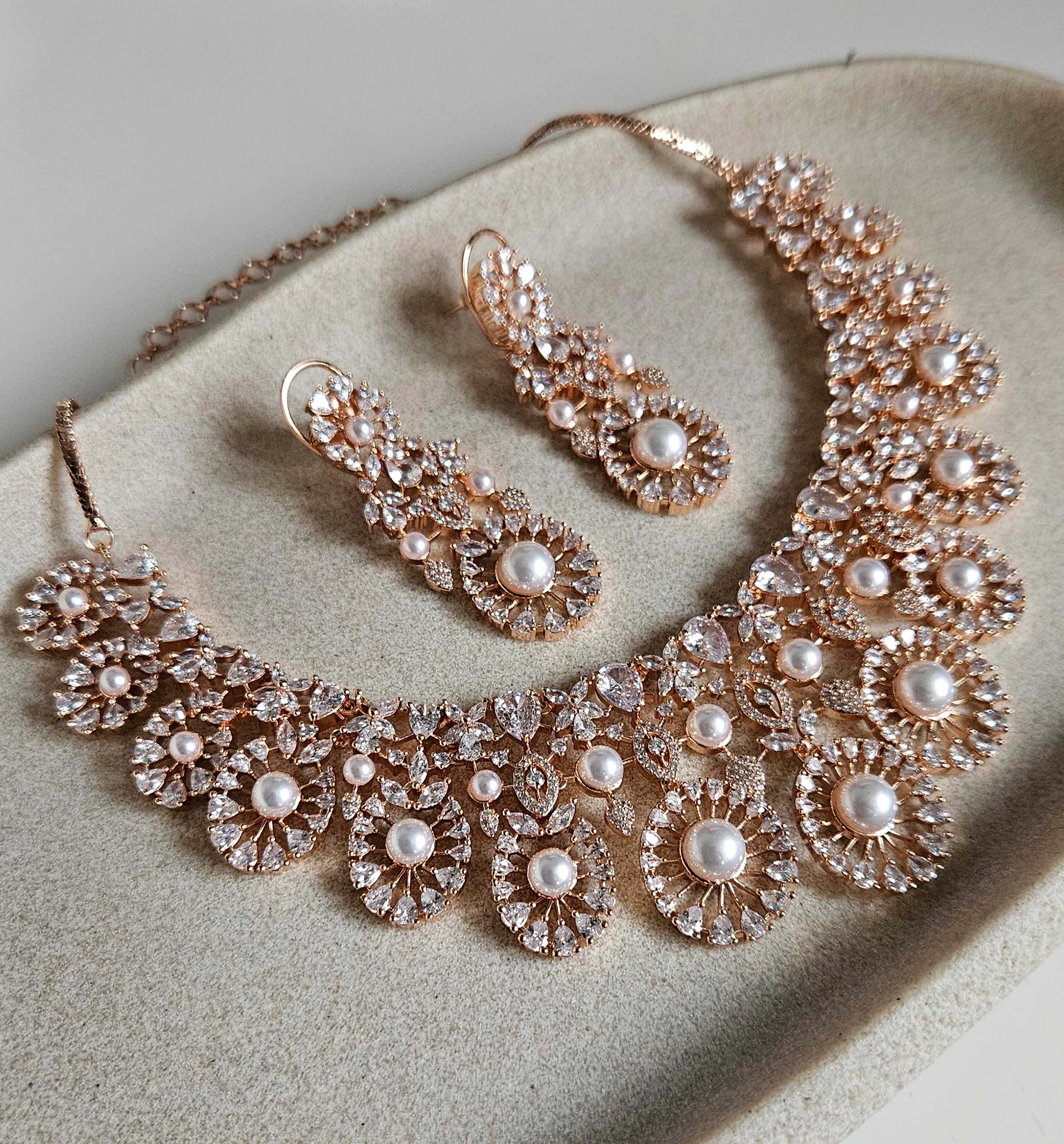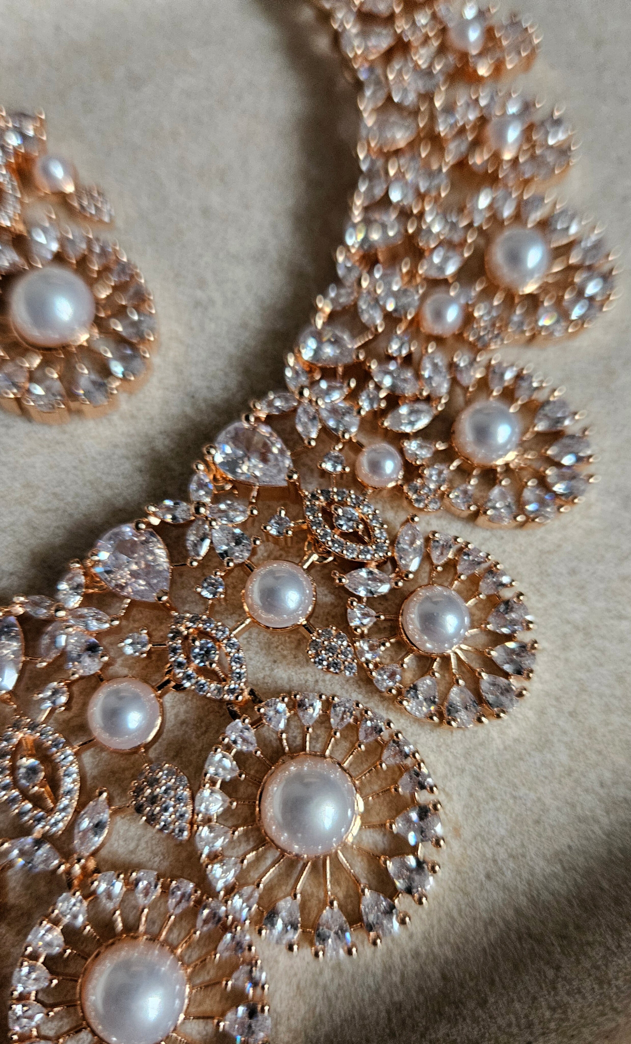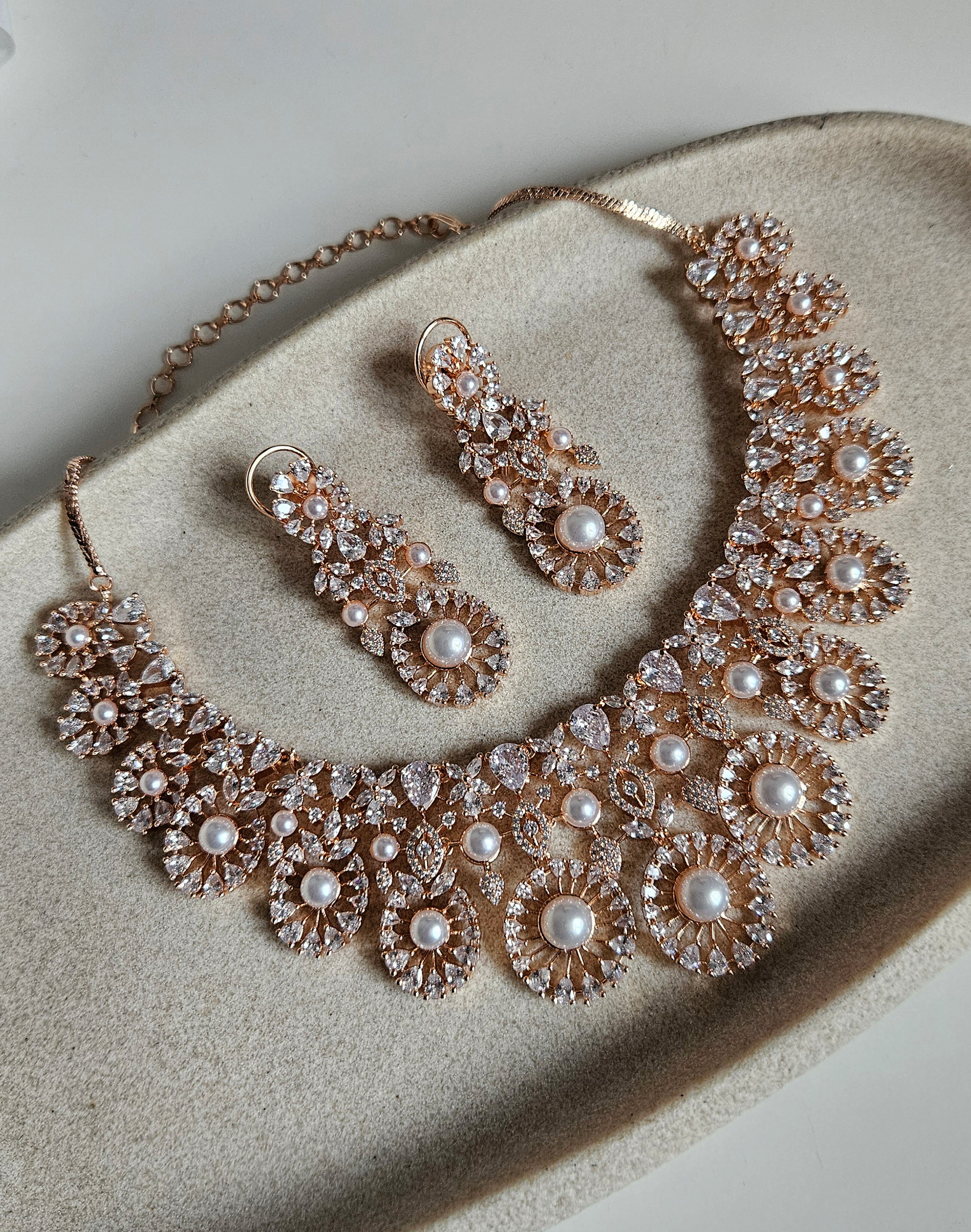 The rose gold plated necklace features a row of brilliant PEARL work with crystals that reflect light beautifully for a diamond-like shine, framed with intricate gold filigree detailing. Each motif is finished with soft movement and an elegant royal touch.