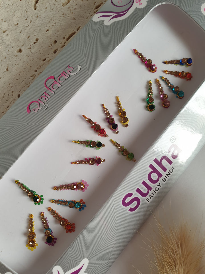 £4.50Multi Color Stone Work Bindi Card different shape bindi with multi color stones (CZs) Bindi Size : 1mm. Material : stone