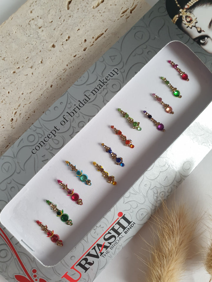 £3.60Multi Color Stone Work Bindi Card Long shape bindi with gold color stones (CZs) Bindi Size : 6mm Quantity : 13 Bindis per Pack Material : Velvet