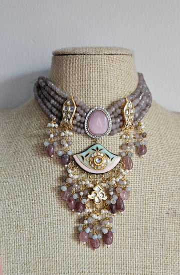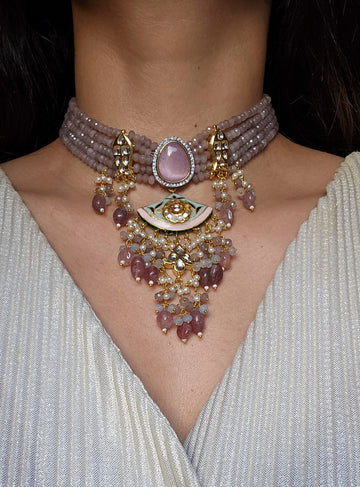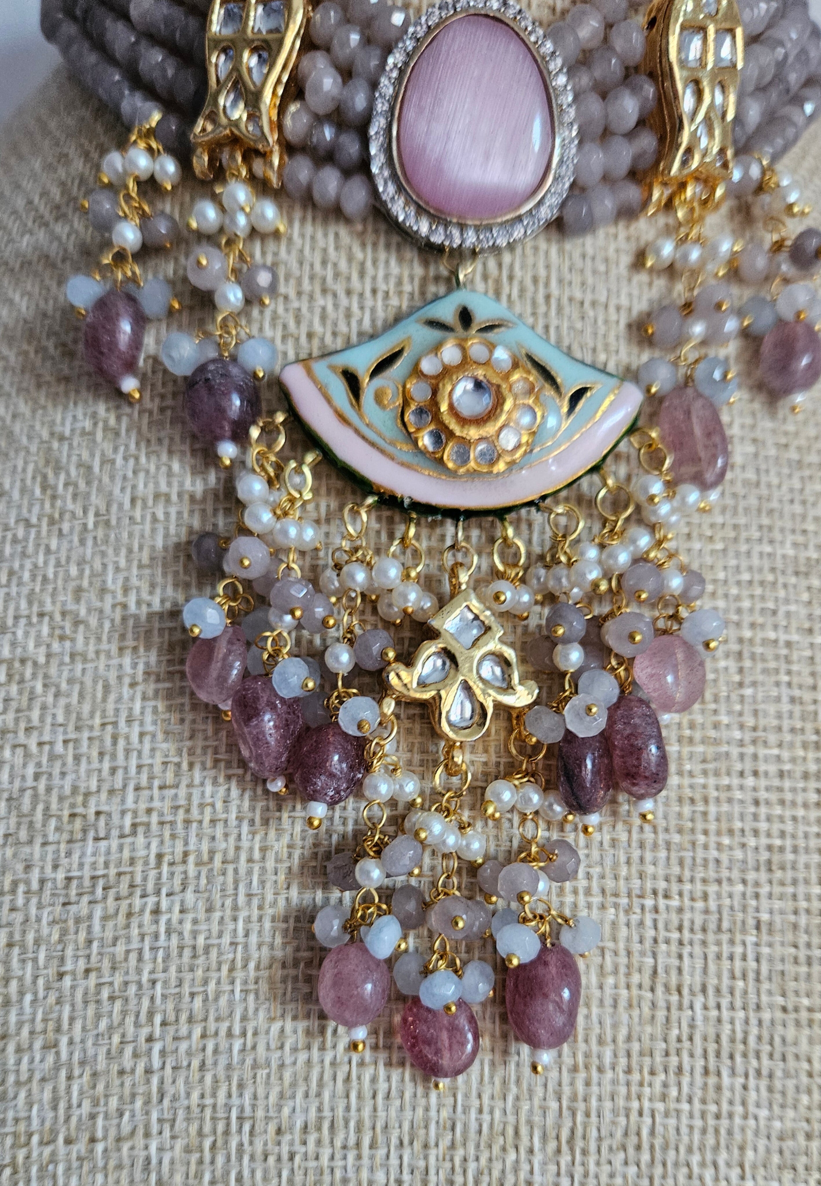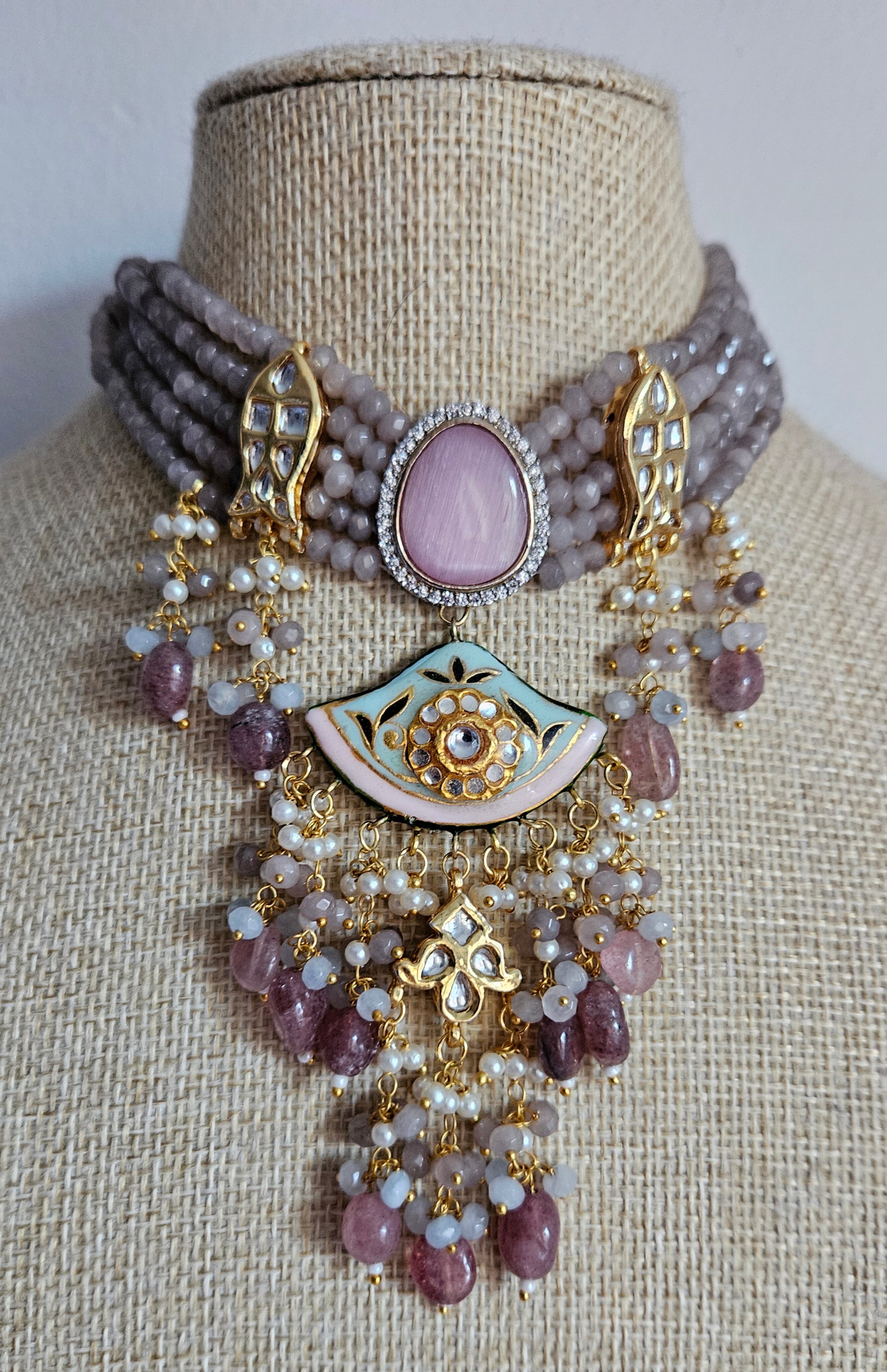 • Gold Tone Choker set Studded With Unique Hand Crafted Meena kundan, premium quality Beads and Pearls.