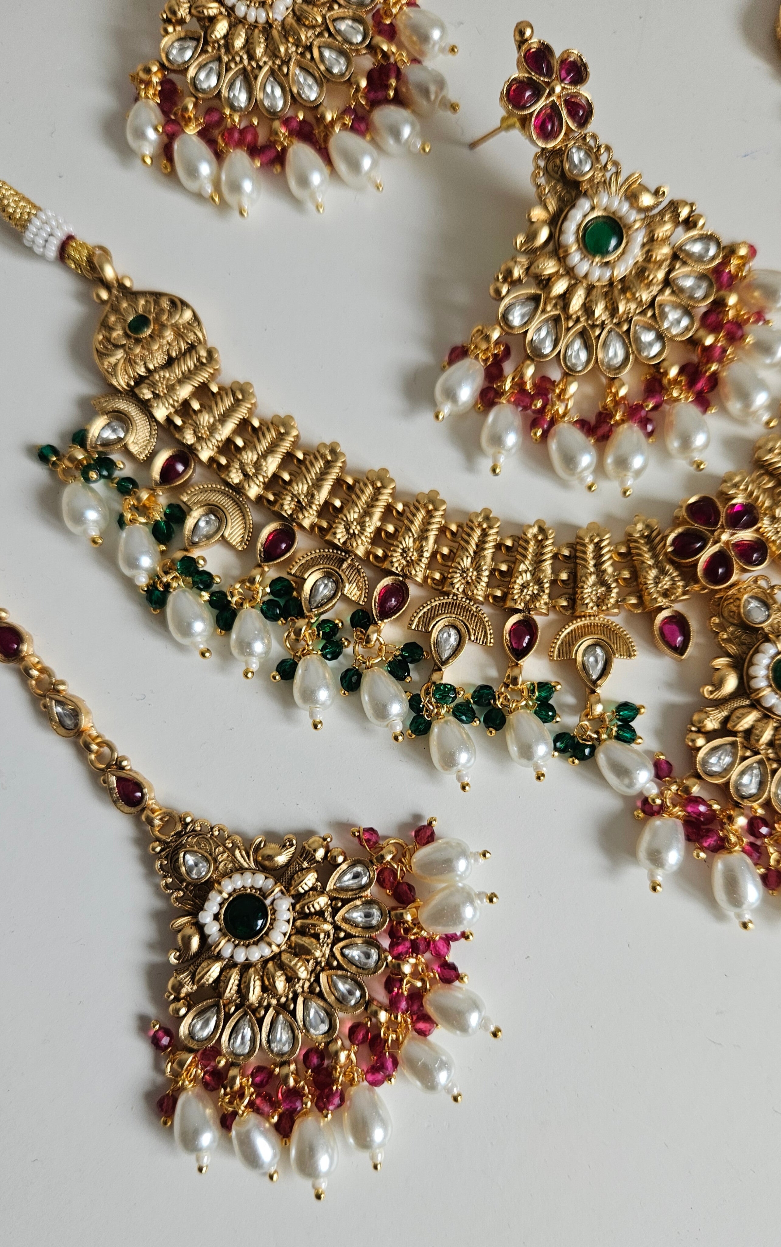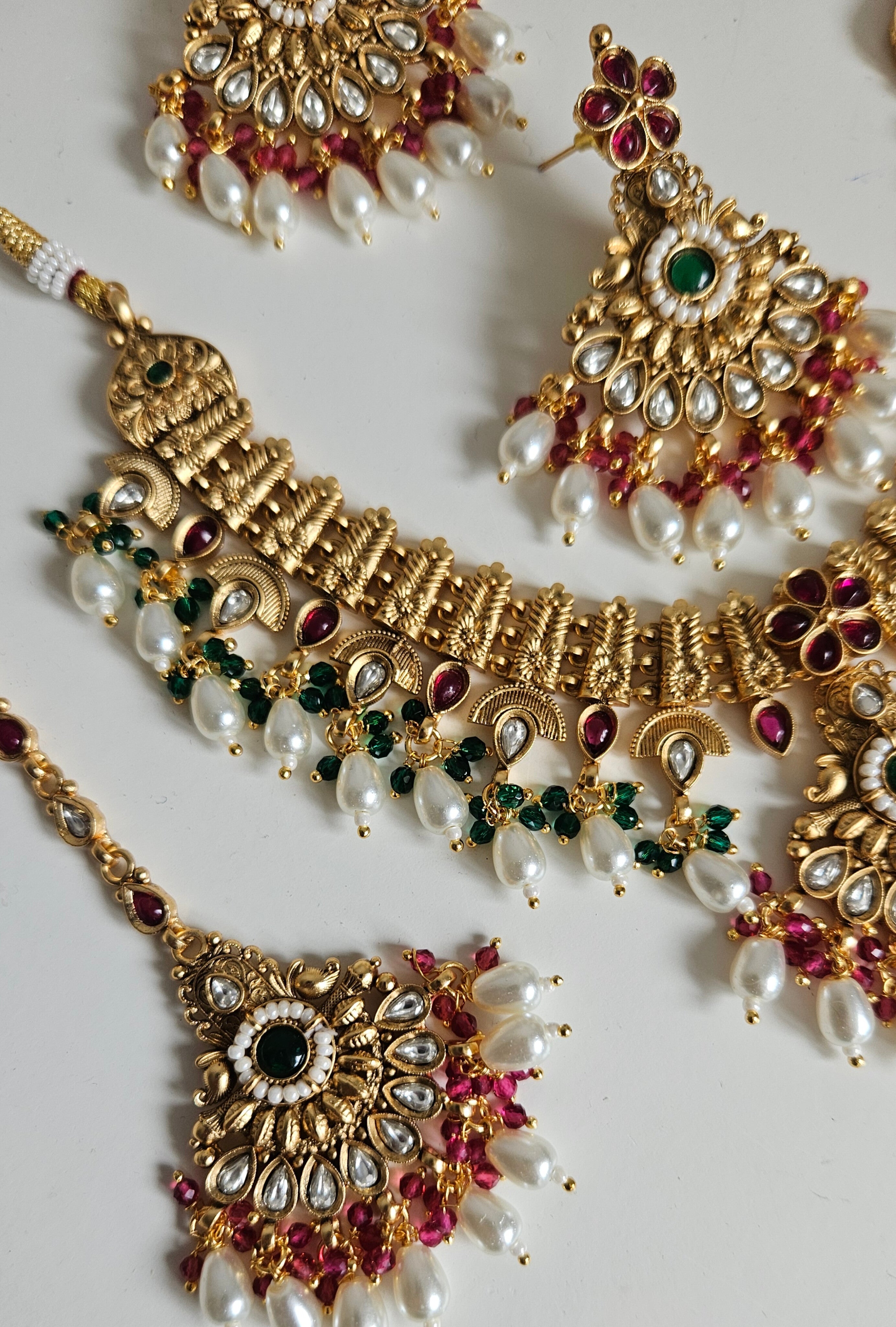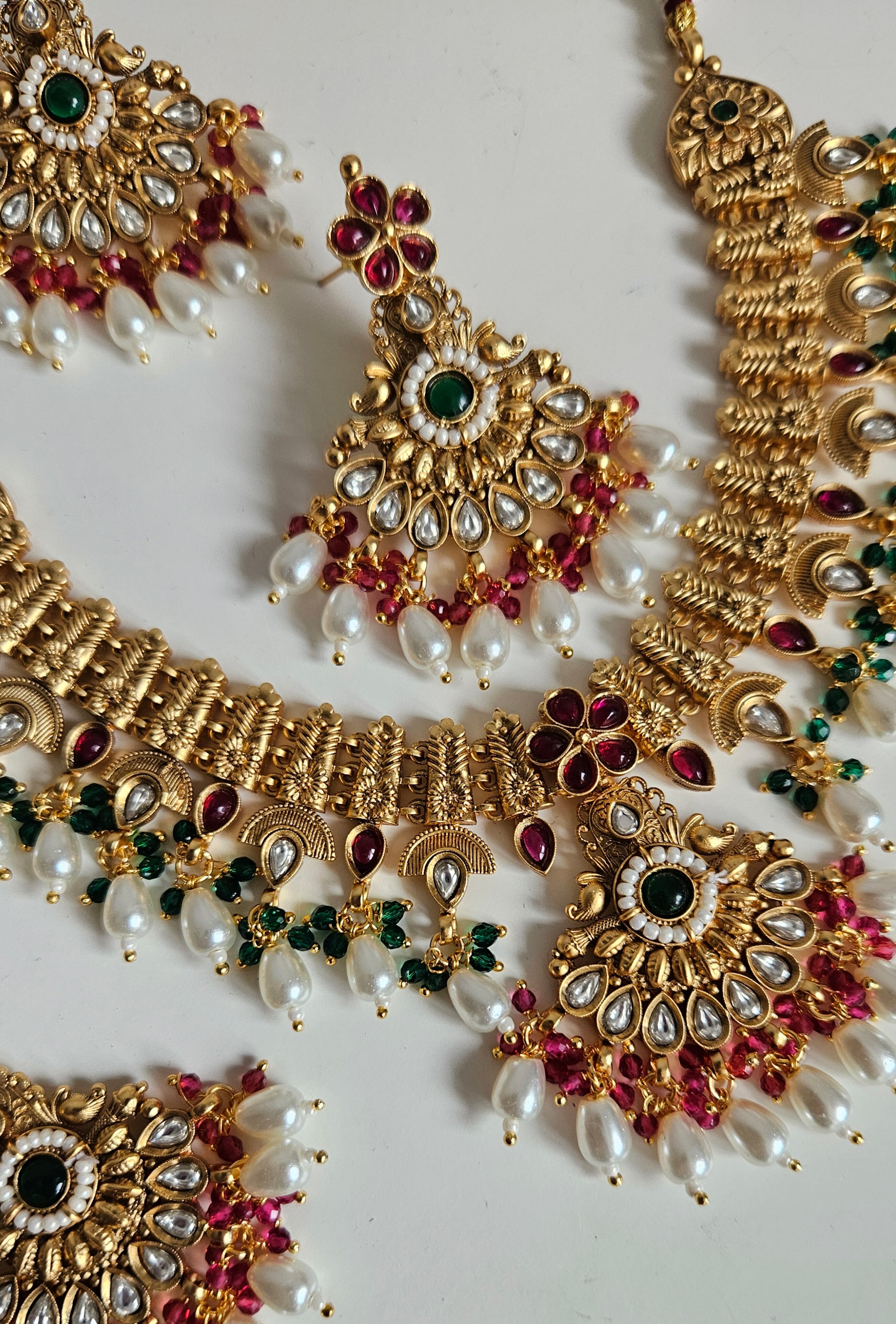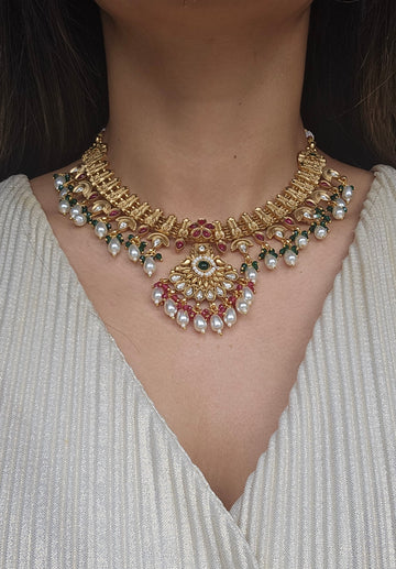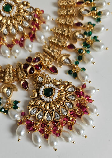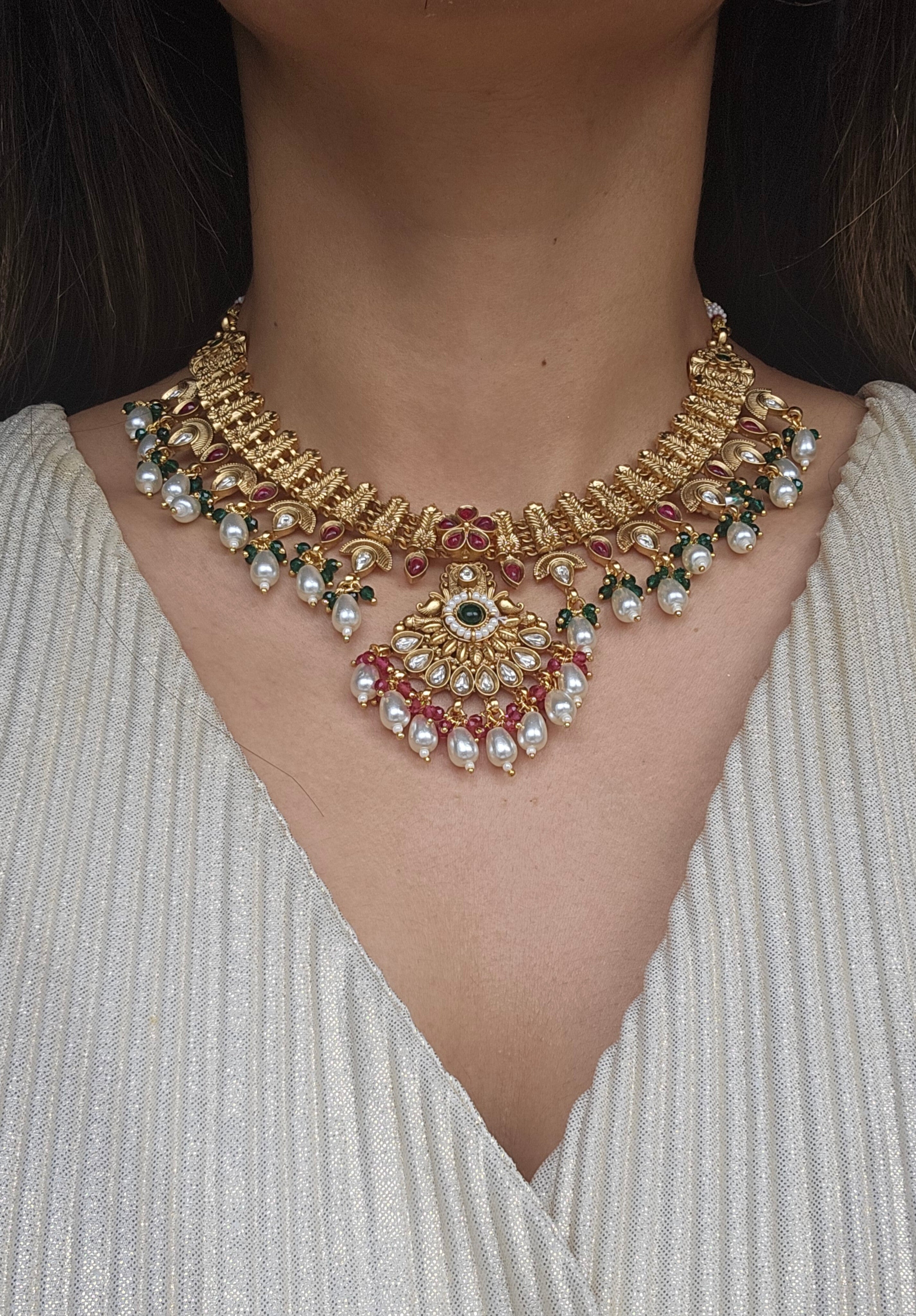 A beautiful traditional jewelry set consisting of a necklace and matching earrings. The design features intricate gold-toned elephant motifs with detailed carvings, symbolizing strength and good fortune. Both the necklace and earrings are embellished with rows of small white pearls arranged in layered patterns, giving the set a regal and elegant appearance. The craftsmanship and design suggest an Indian or temple-inspired style, perfect for festive or bridal occasions.