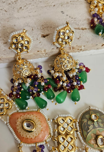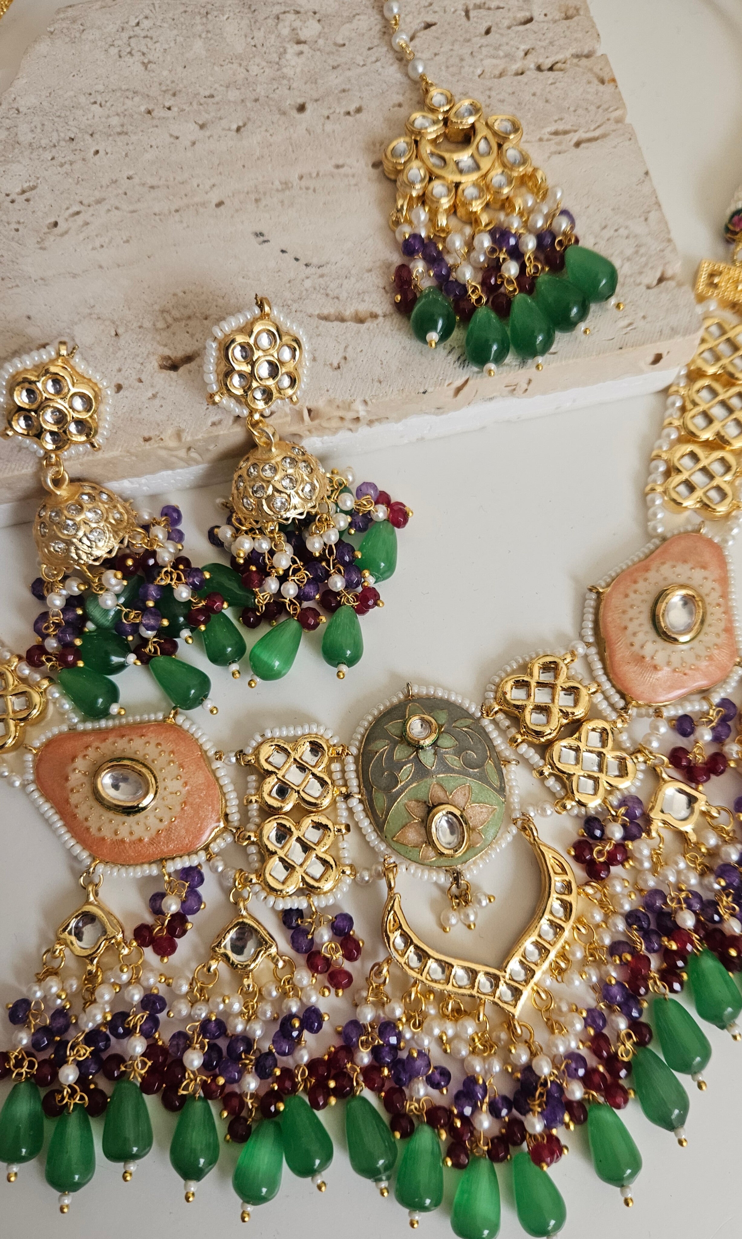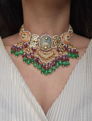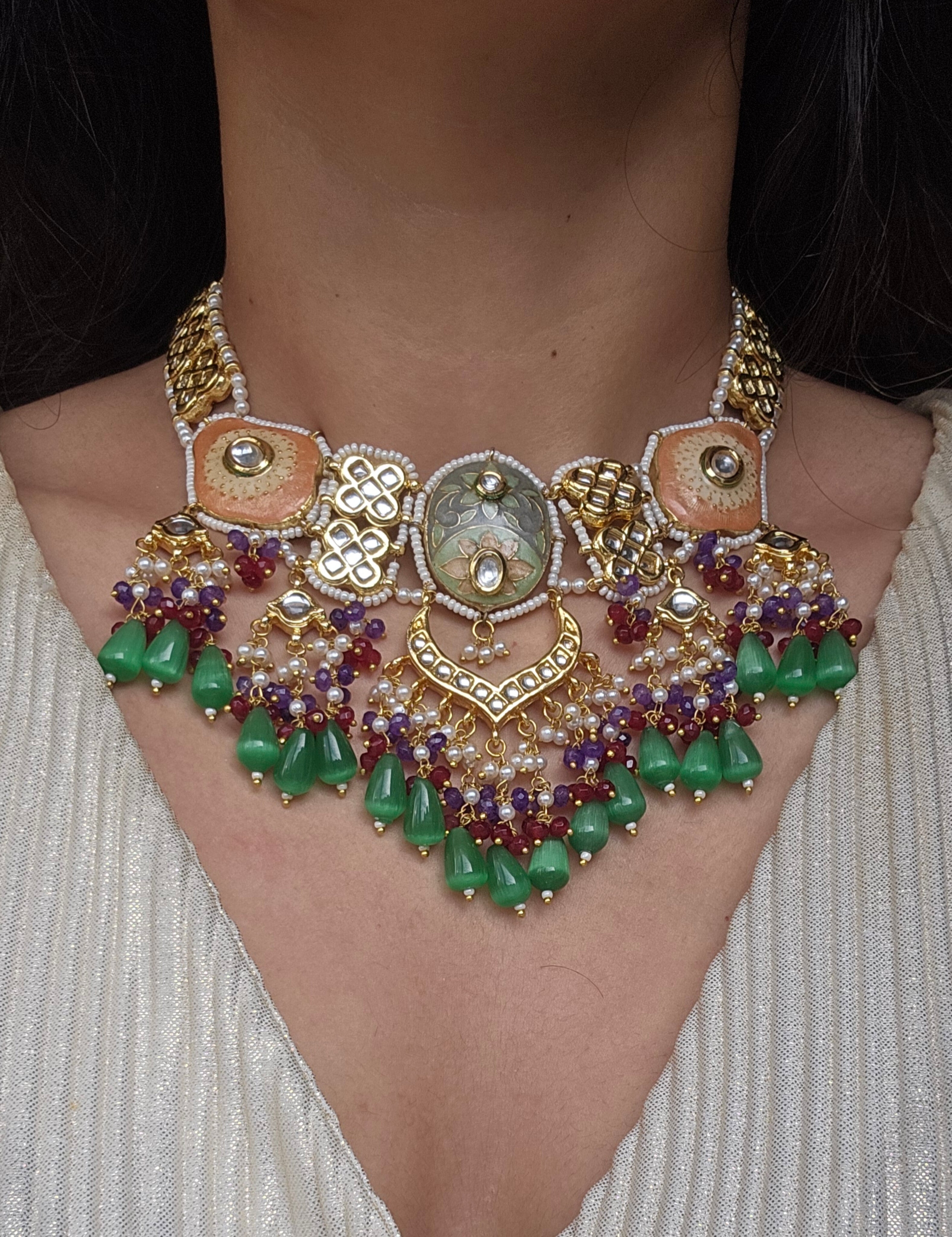 • Gold Tone Choker/Necklace set Studded With Unique Hand Crafted Meena kundan, premium quality Beads and Pearls.