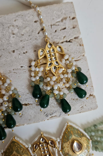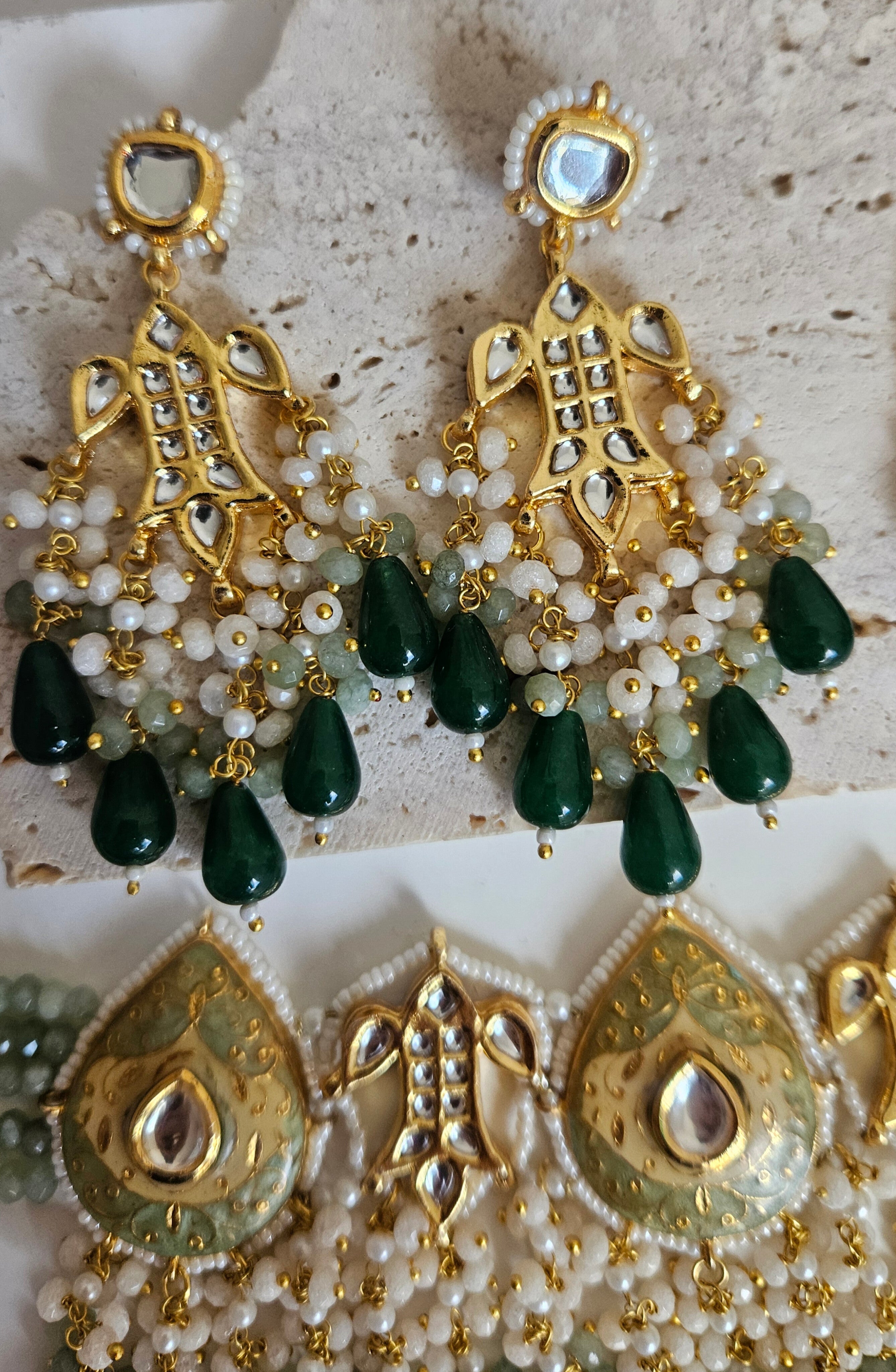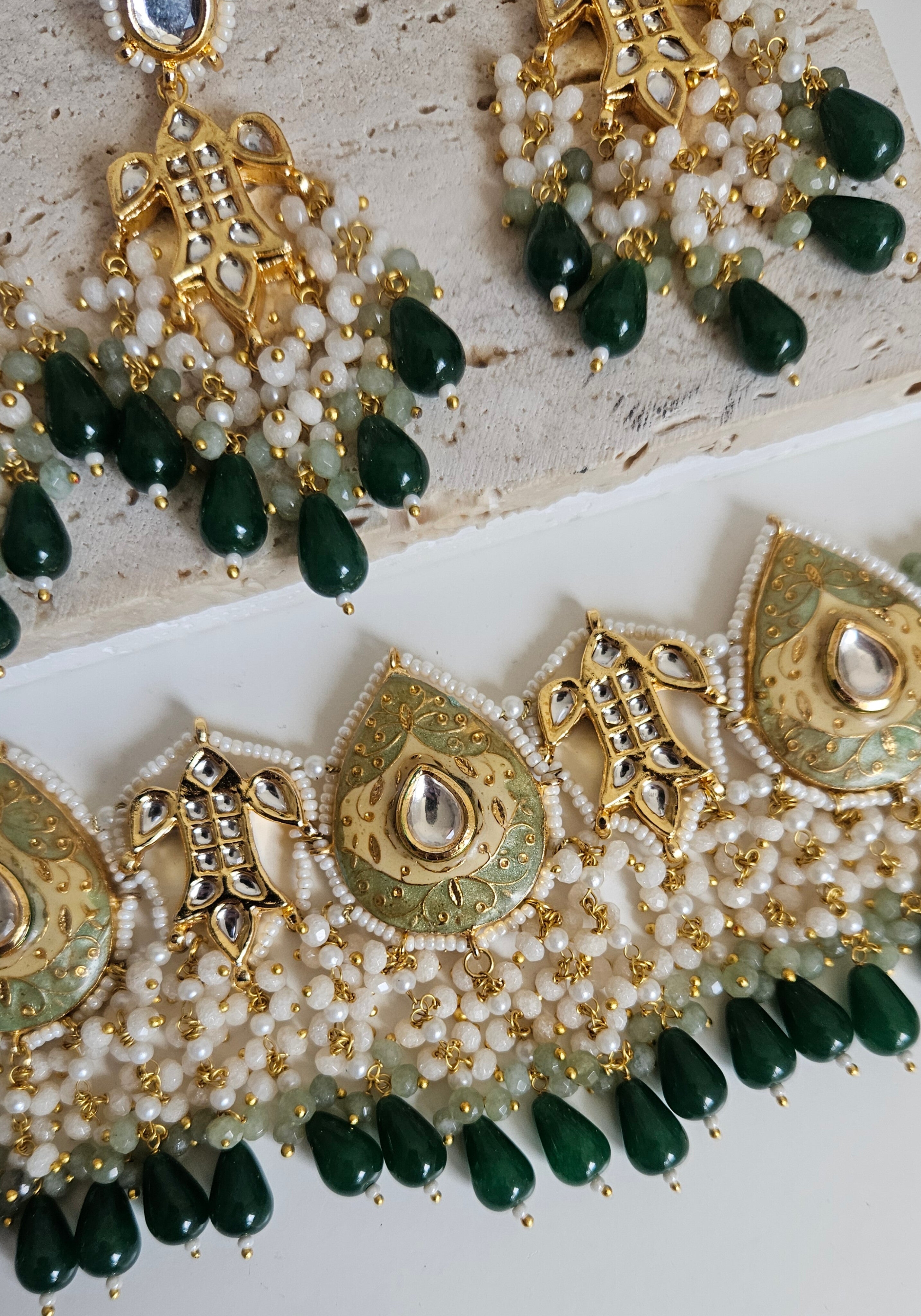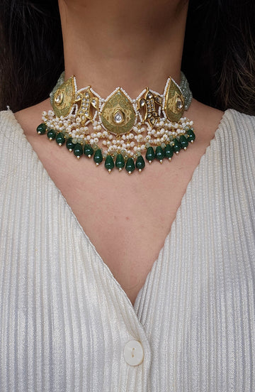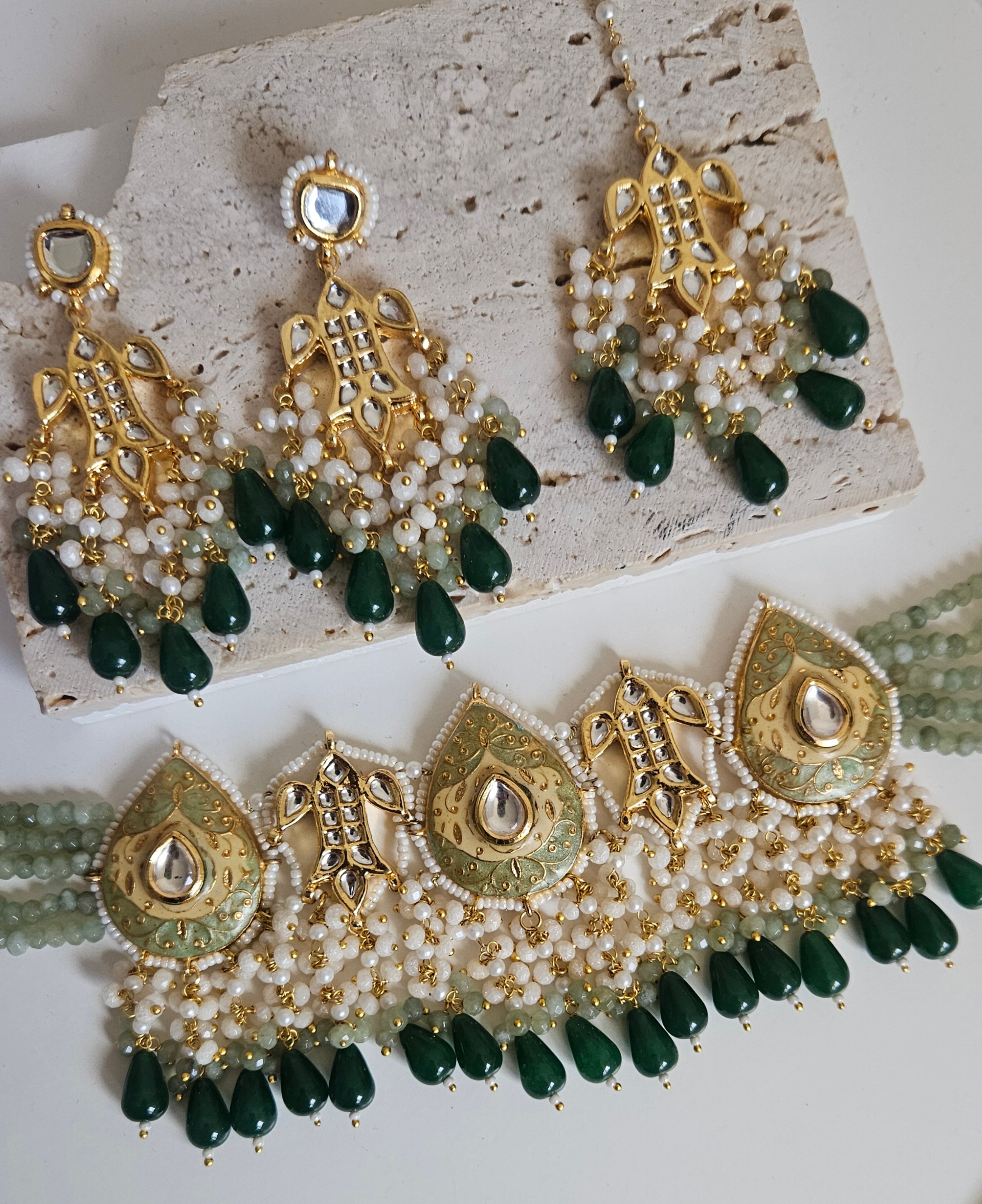 • Gold Tone Choker/Necklace set Studded With Unique Hand Crafted Meena kundan, premium quality Beads and Pearls.