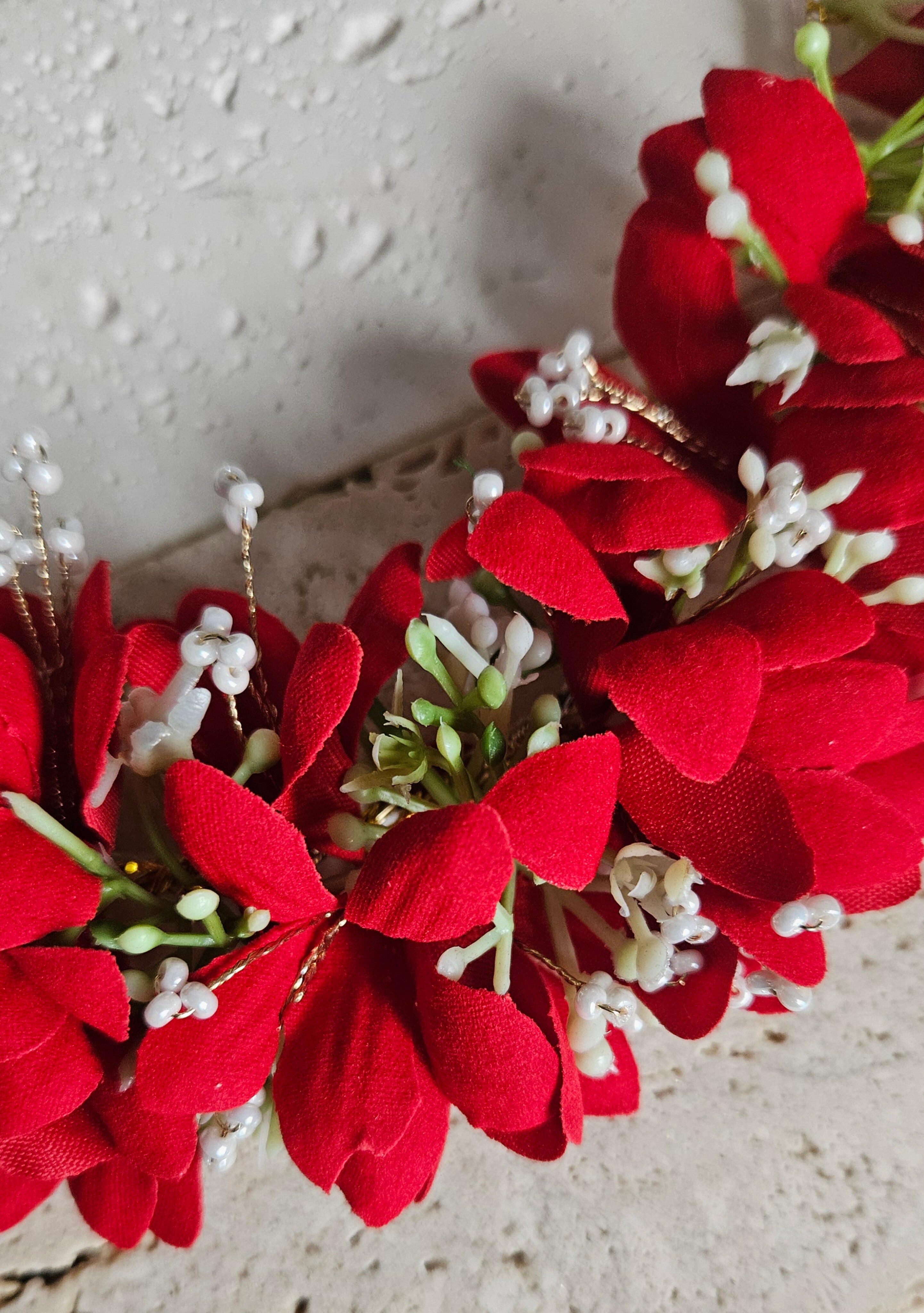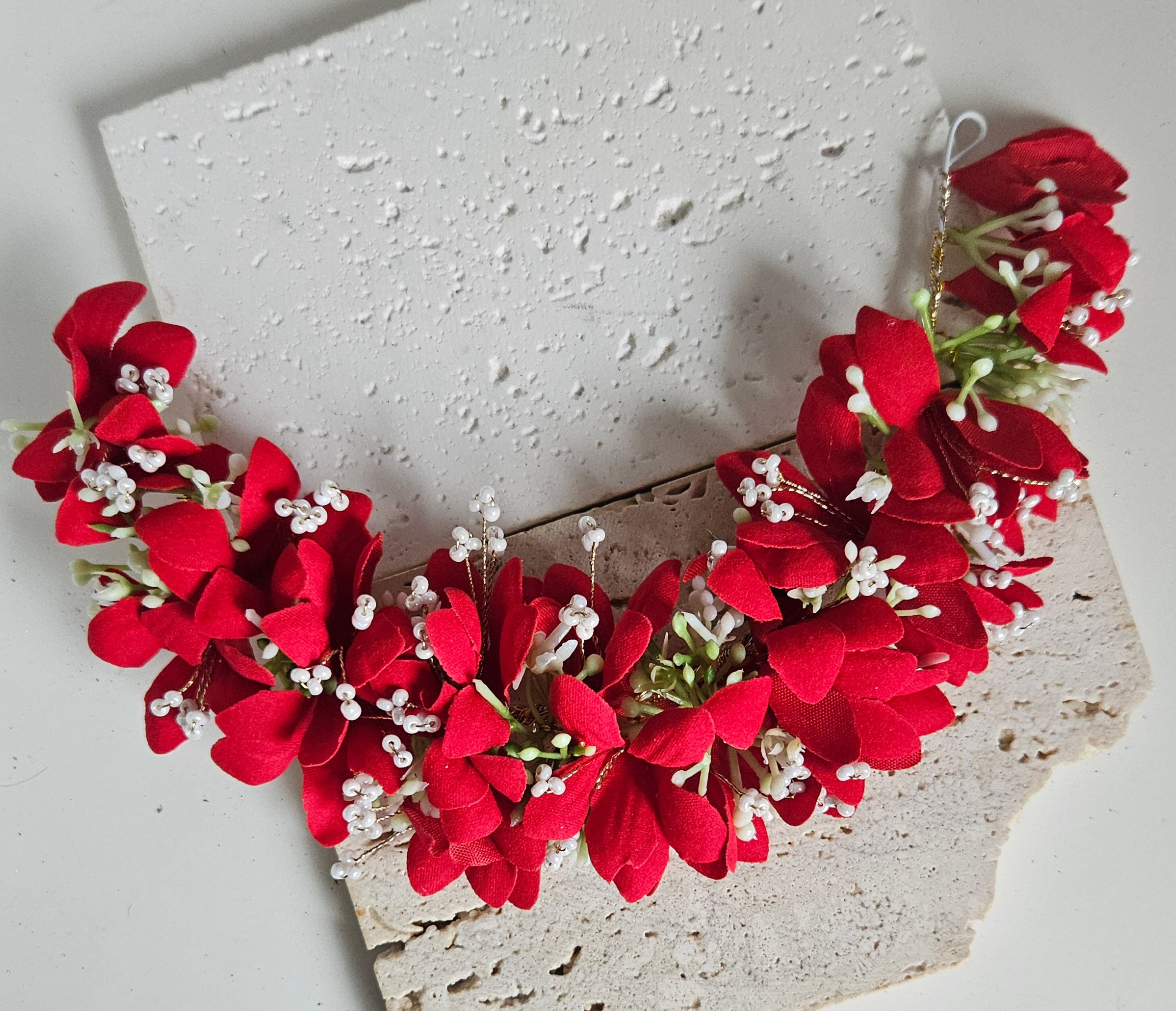 A flexible Red gajra that comfortably wraps around the bun for a secure, elegant finish.