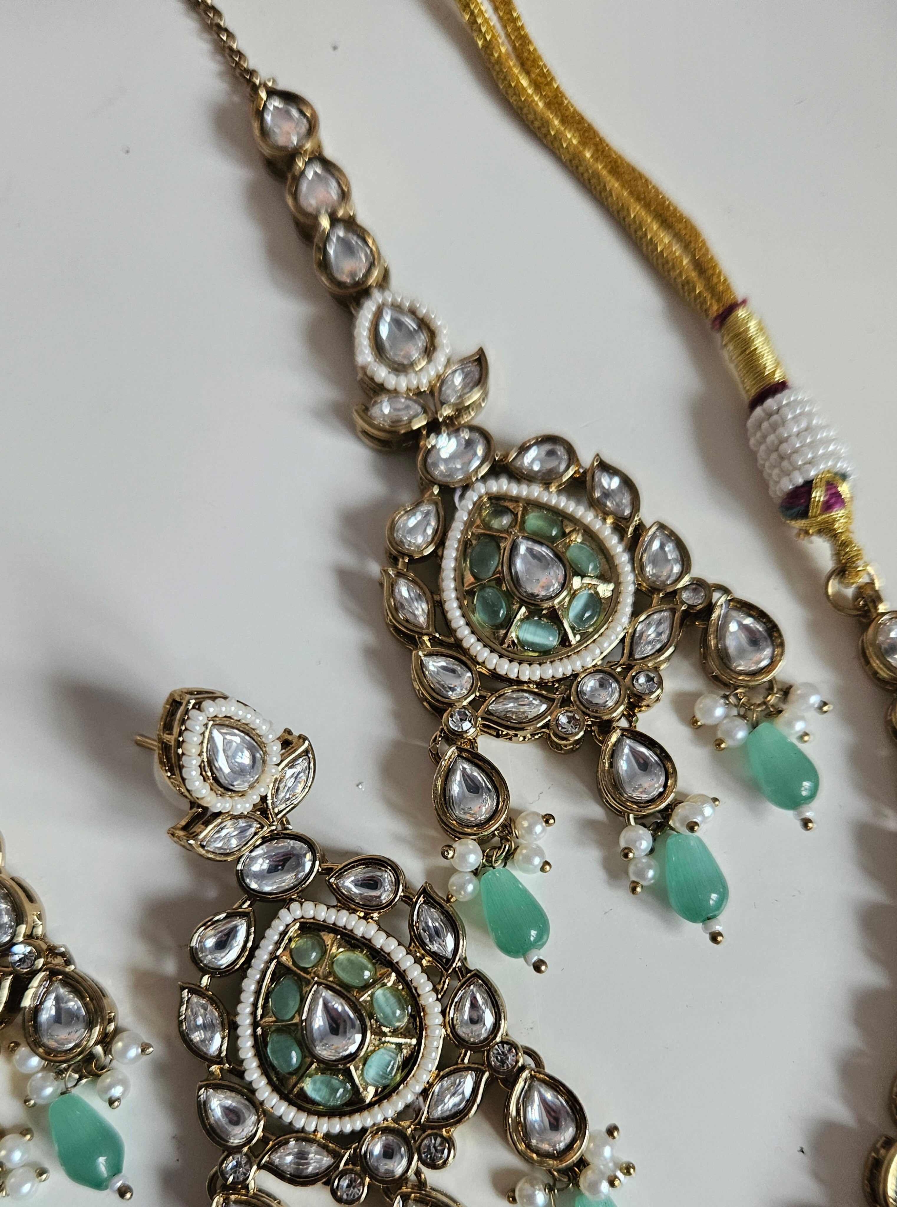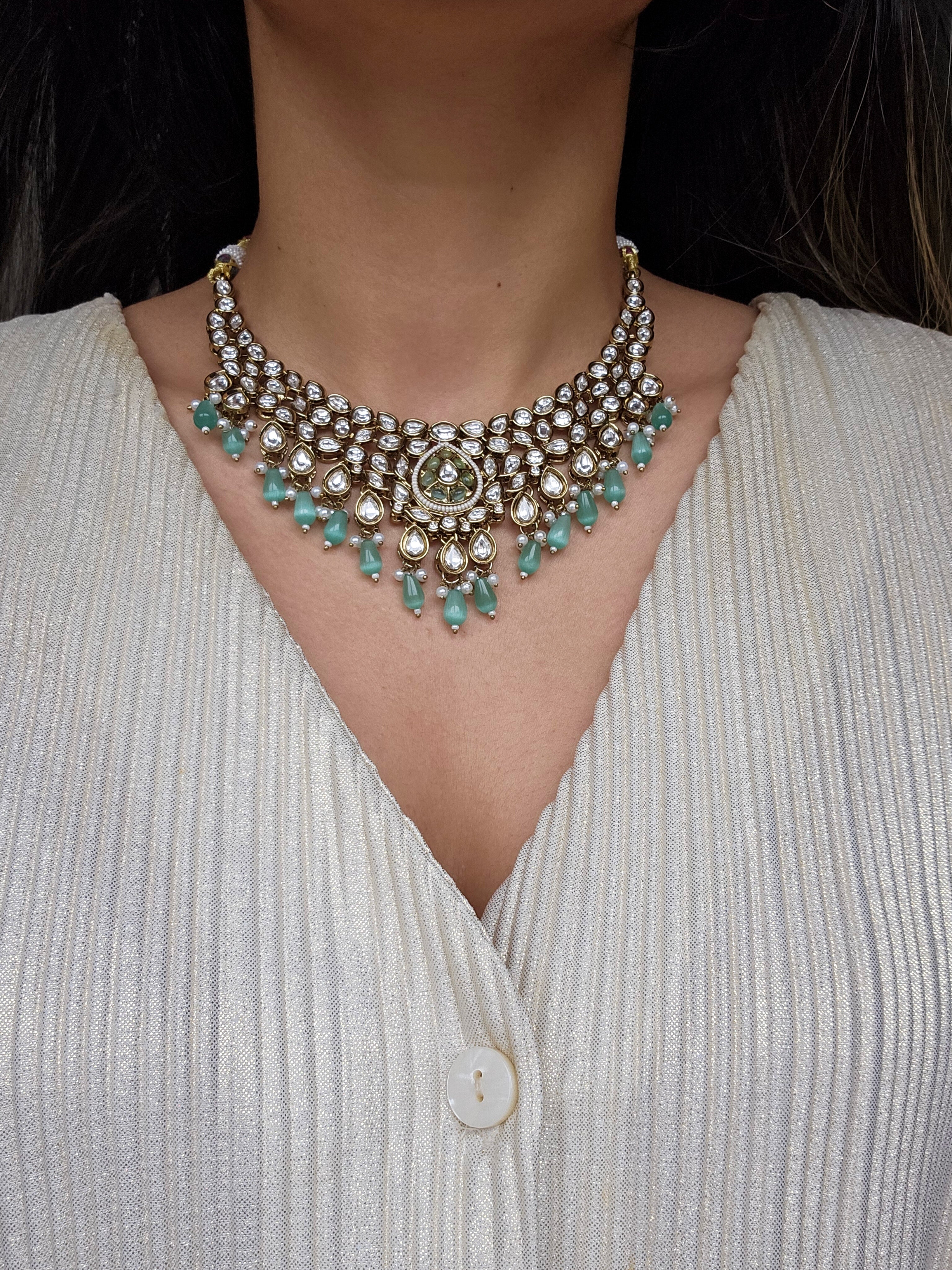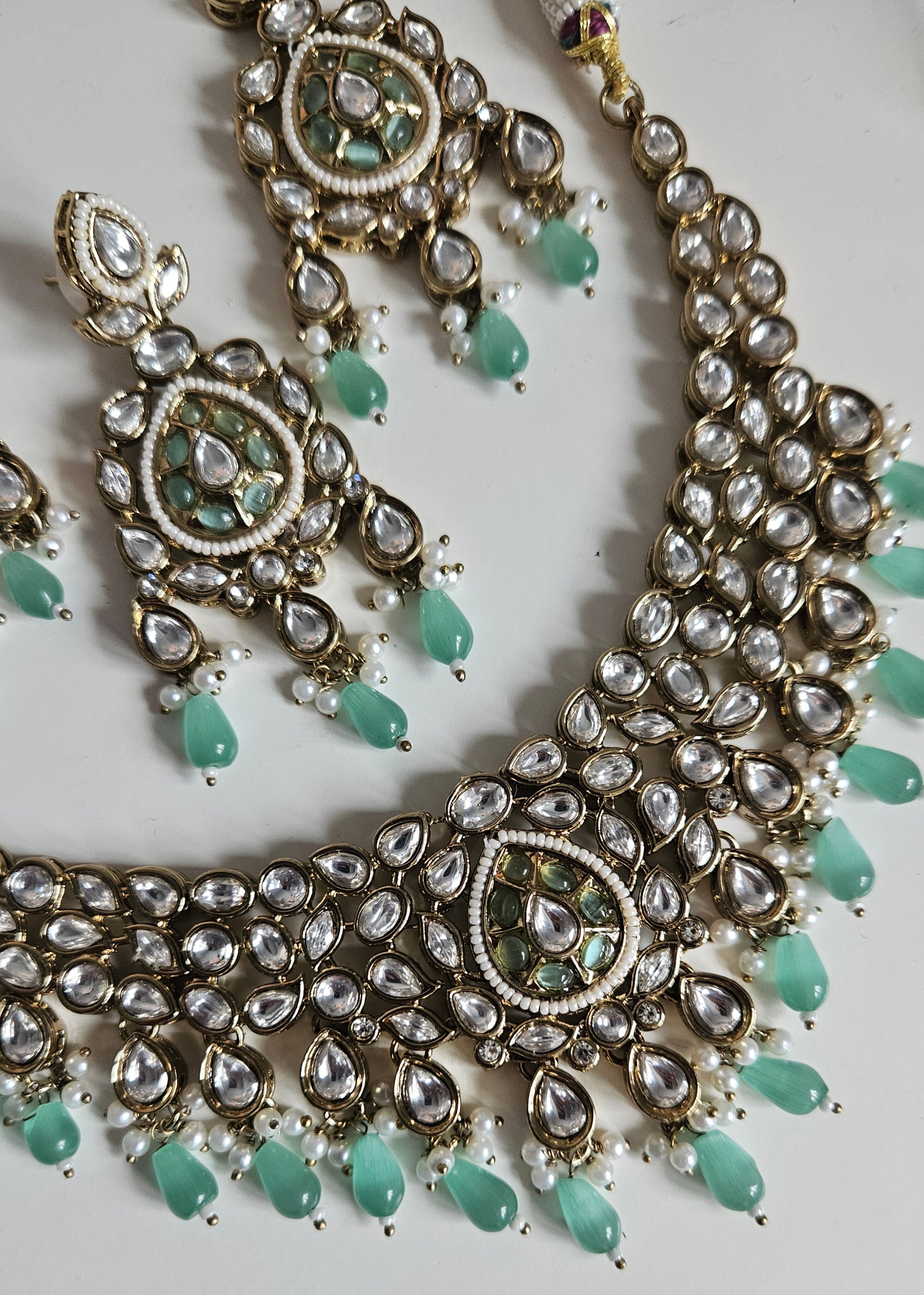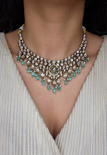 A stunning gold tone necklace set beautifully studded with Kundan stones, designed to elevate any traditional or modern look.
