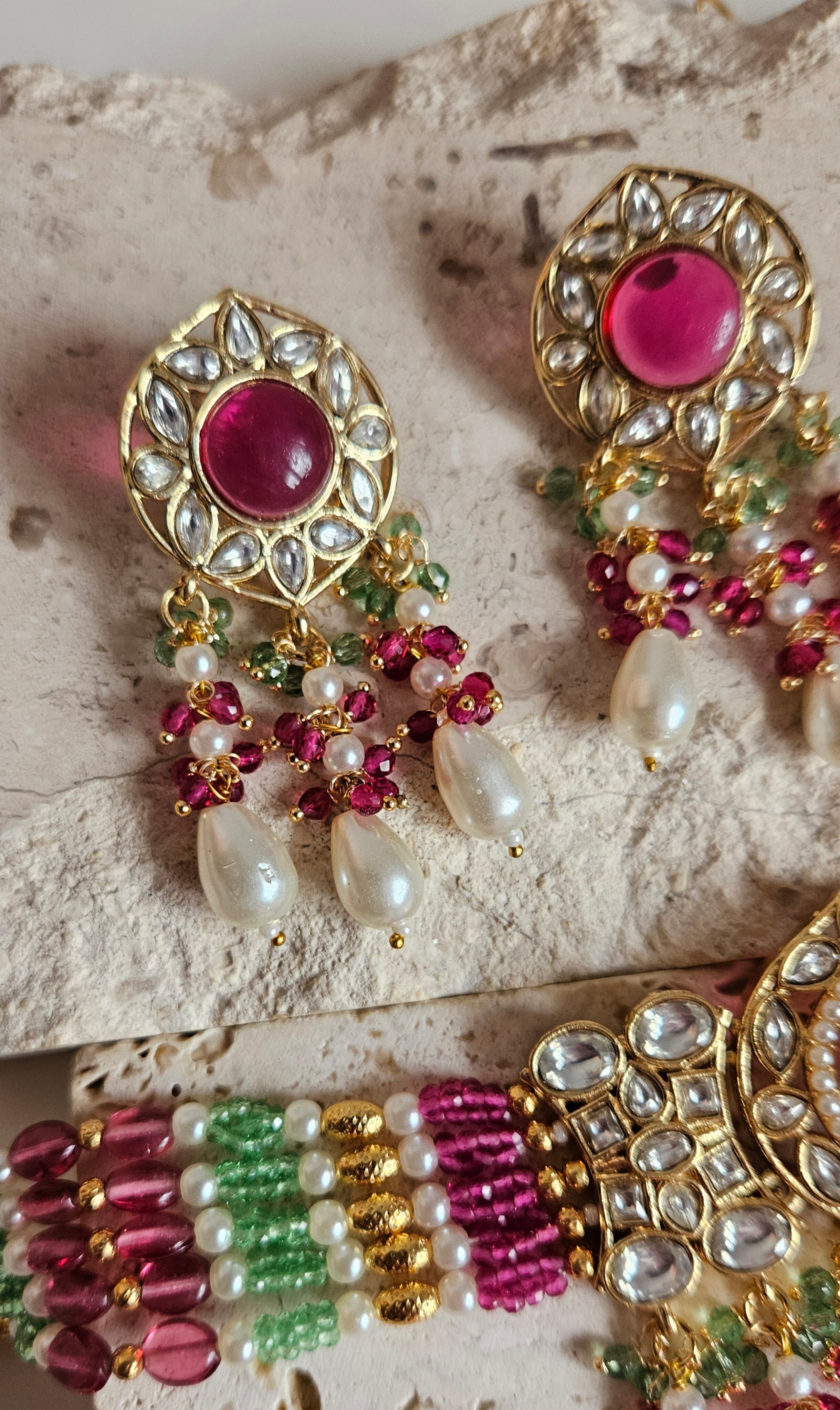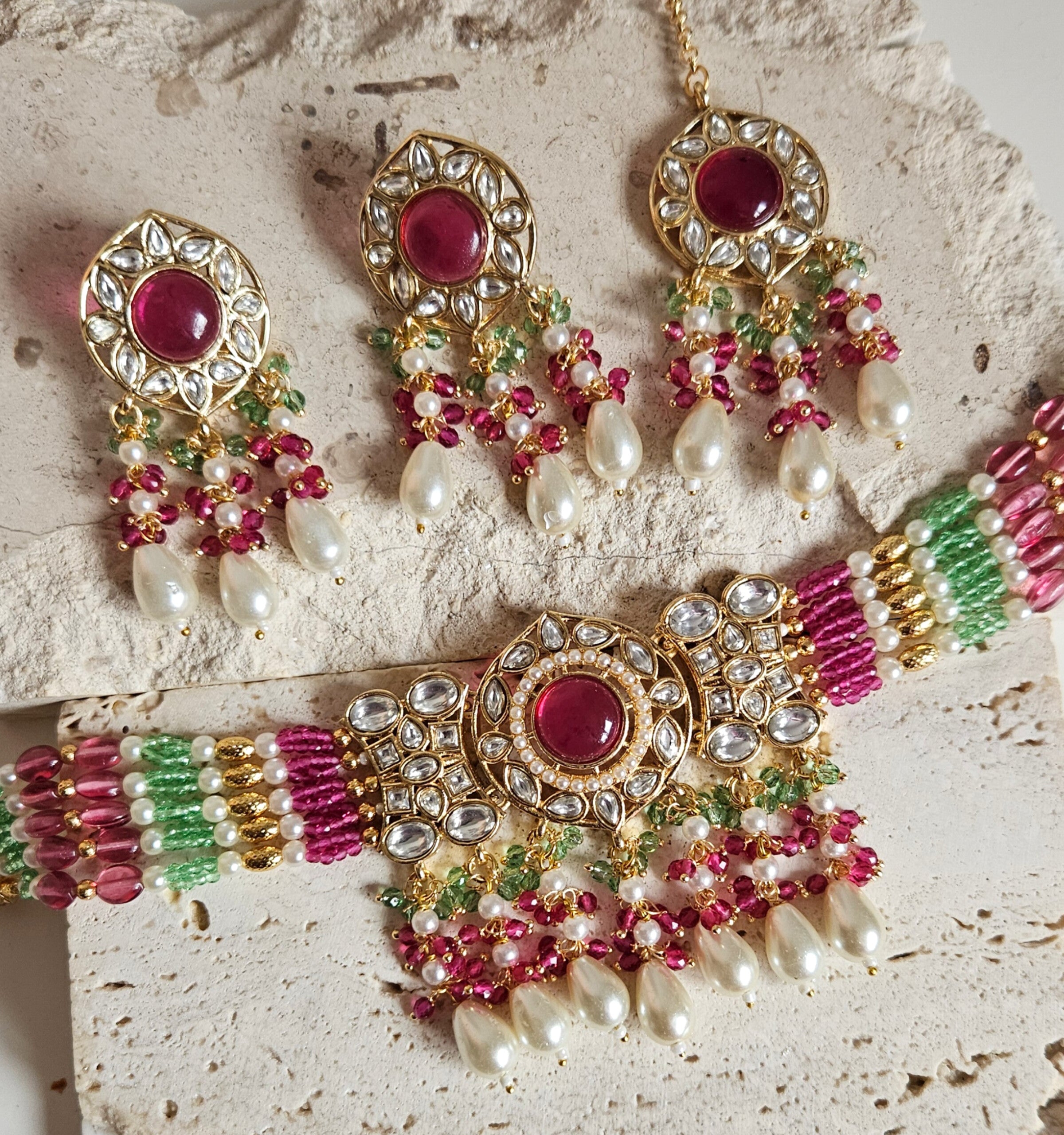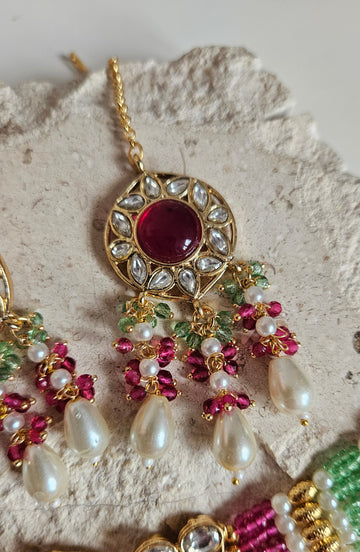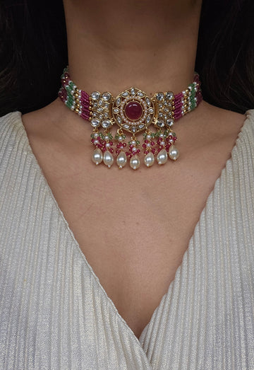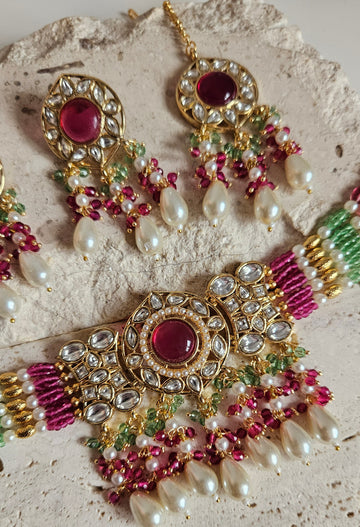 • Gold Tone Choker set Studded With kundan, and Coloured monalisa Stones