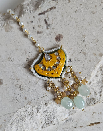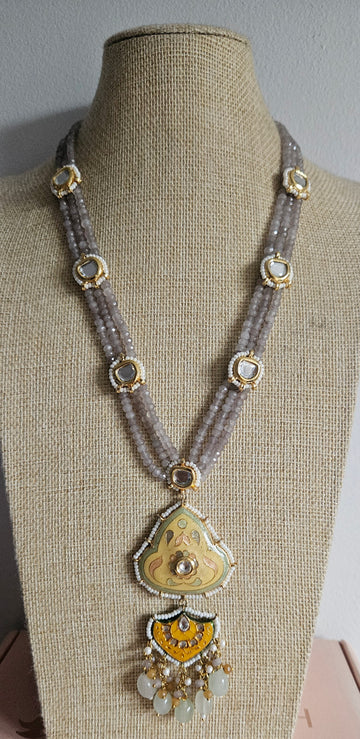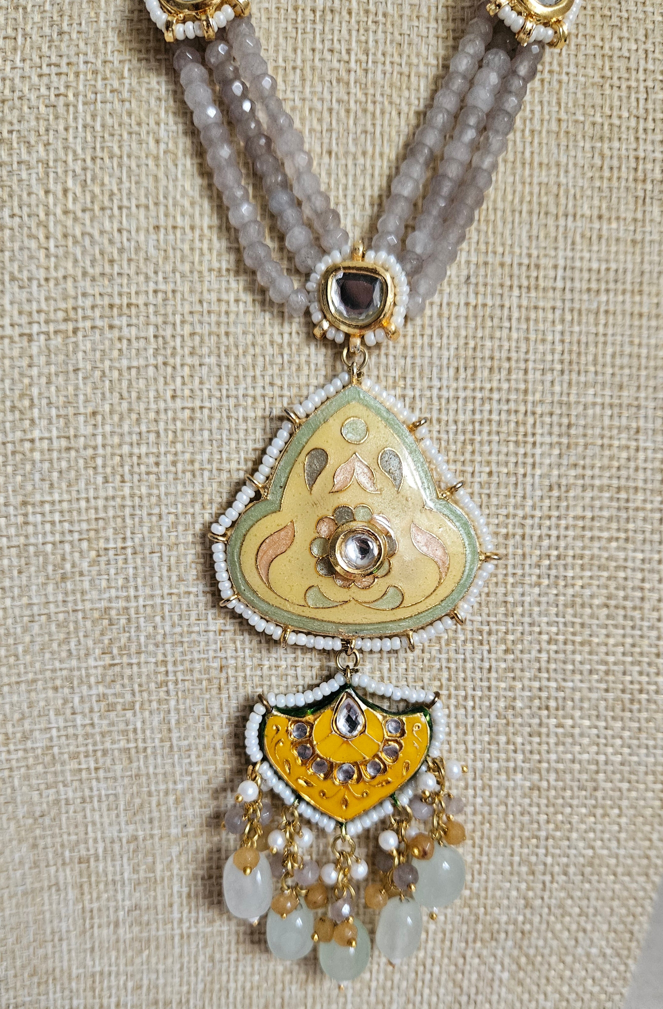 Gold plated long necklace set studded with simulated meena kundan and beads.