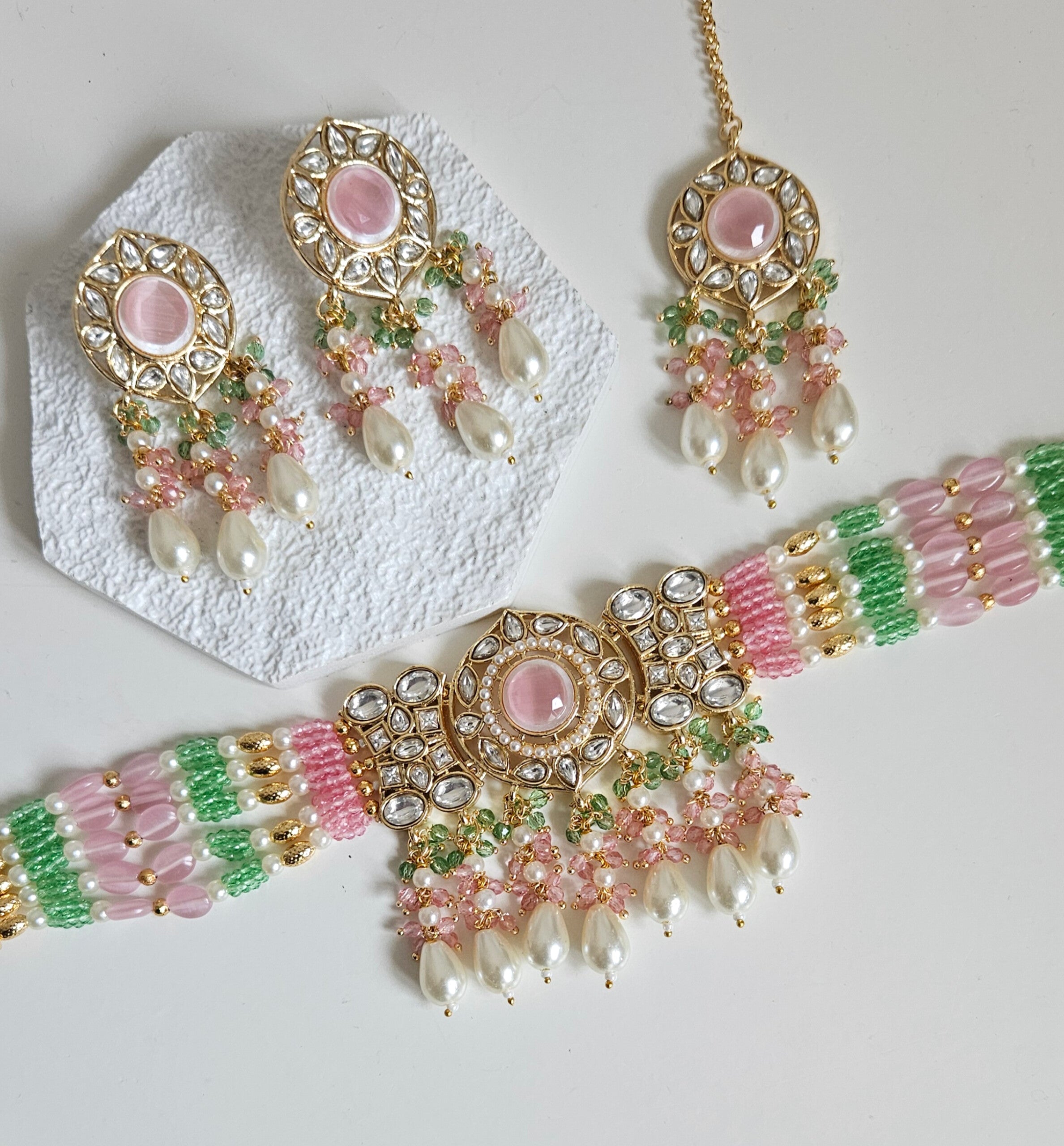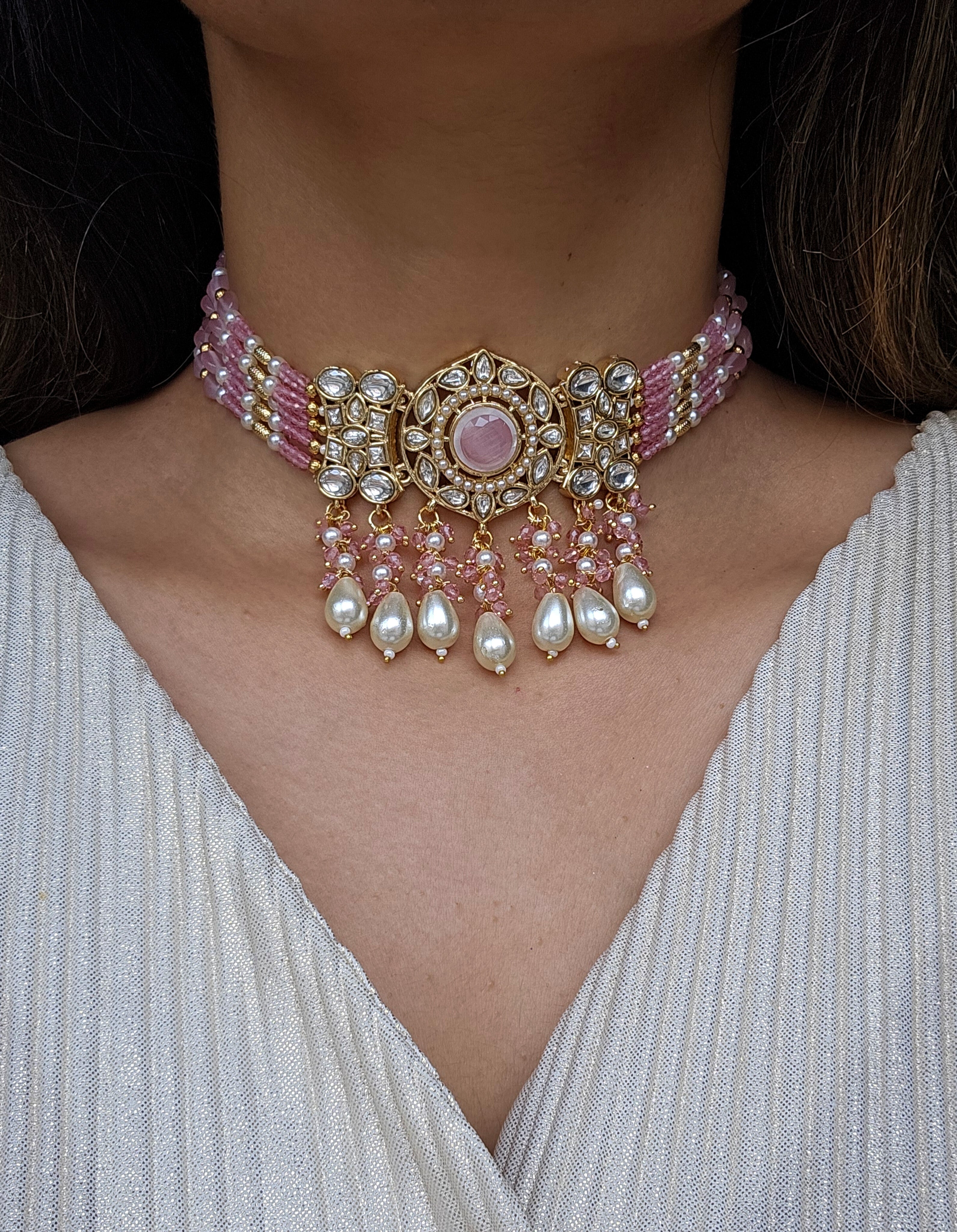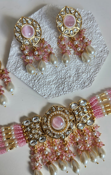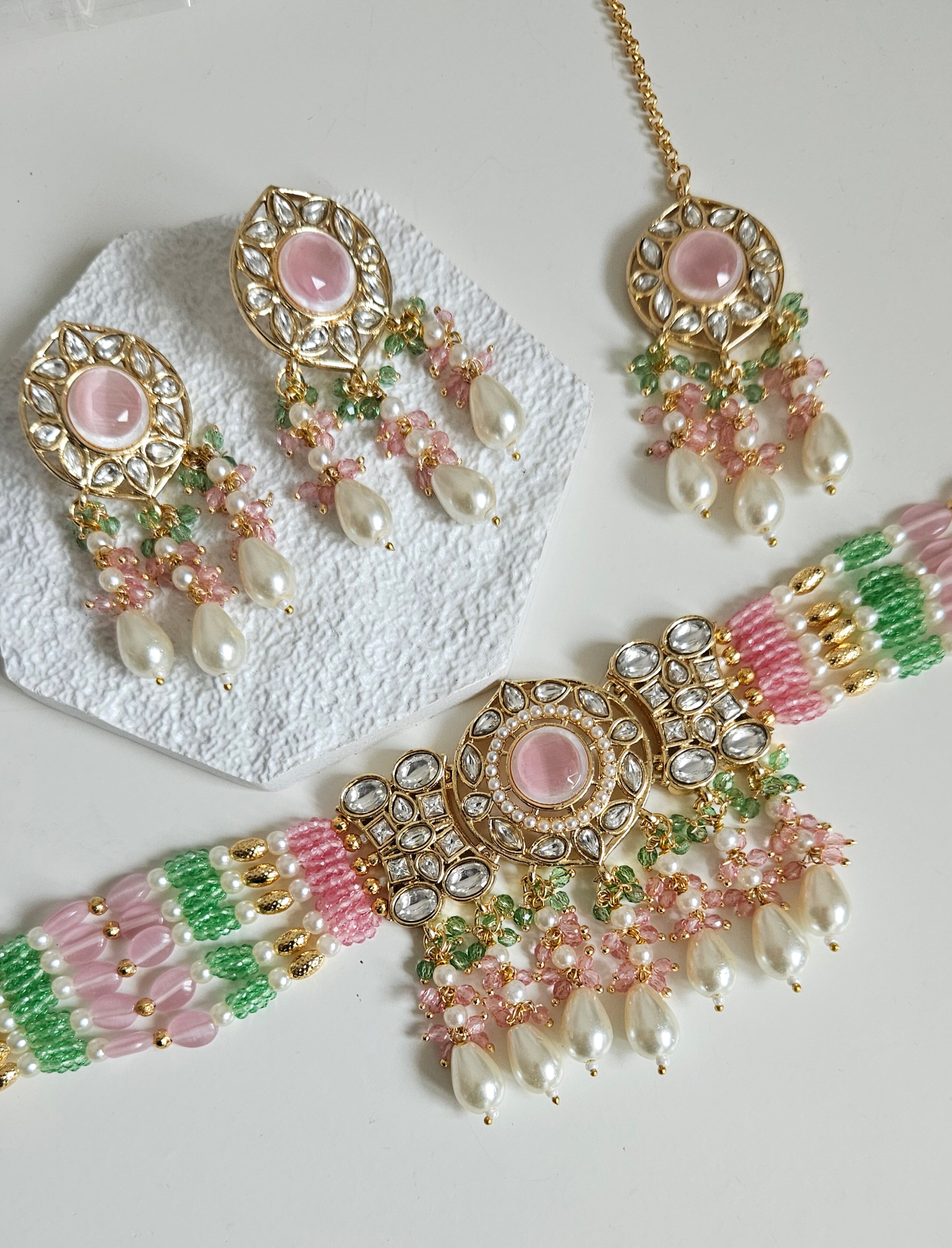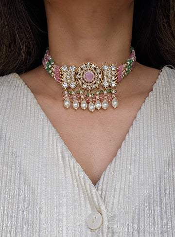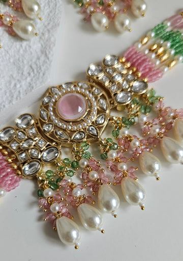 • Gold Tone Choker set Studded With kundan, and Coloured monalisa Stones