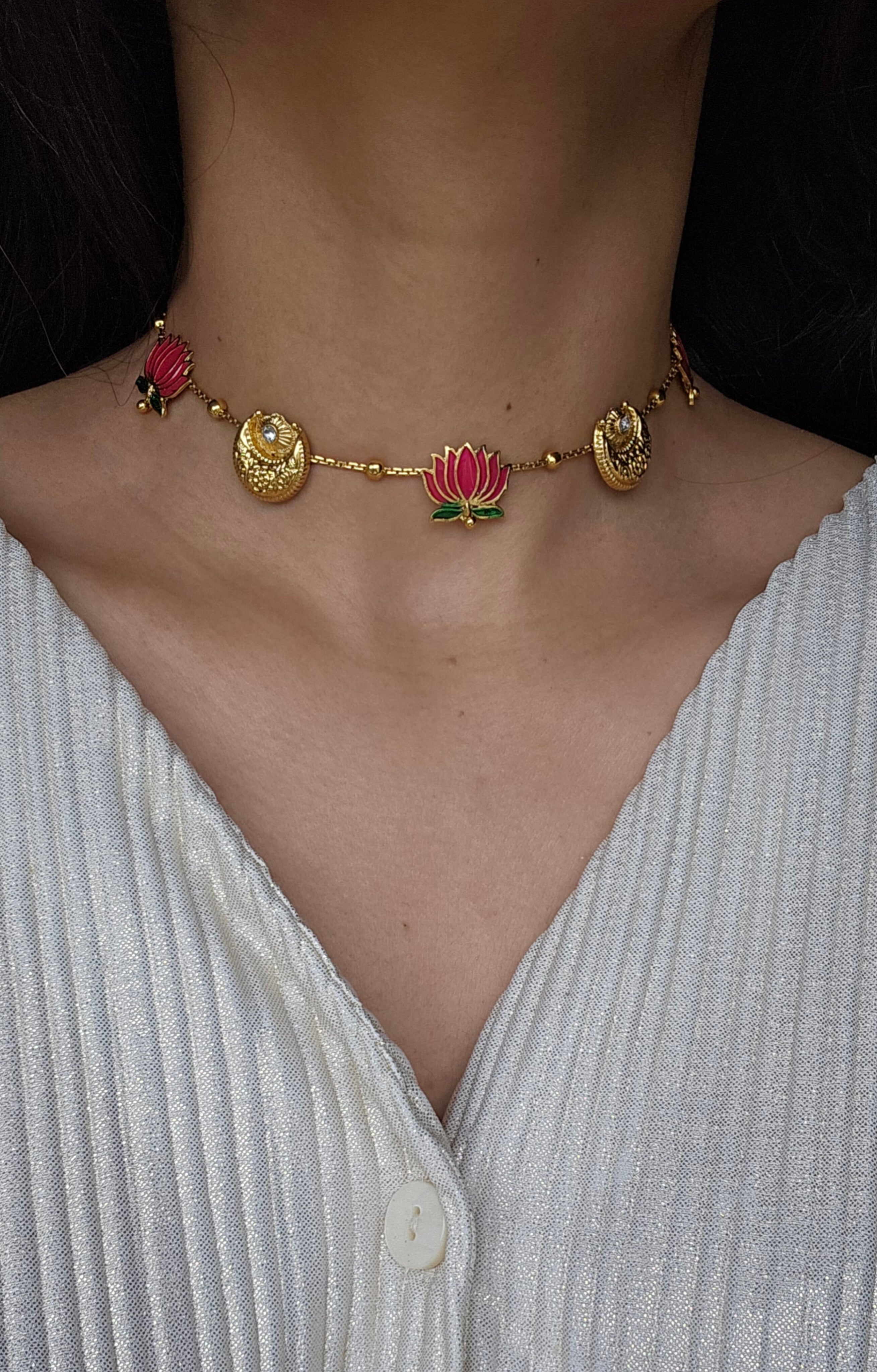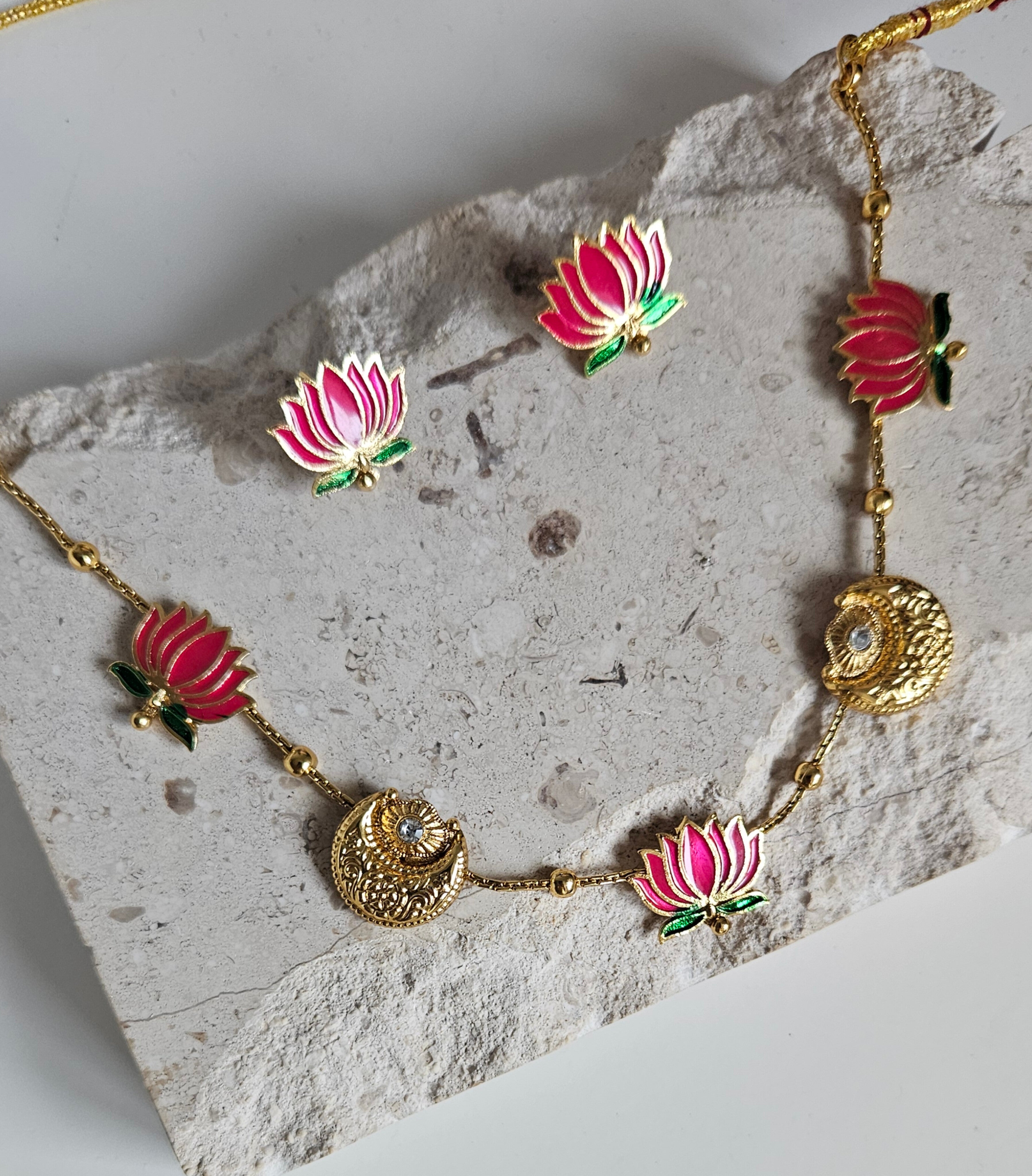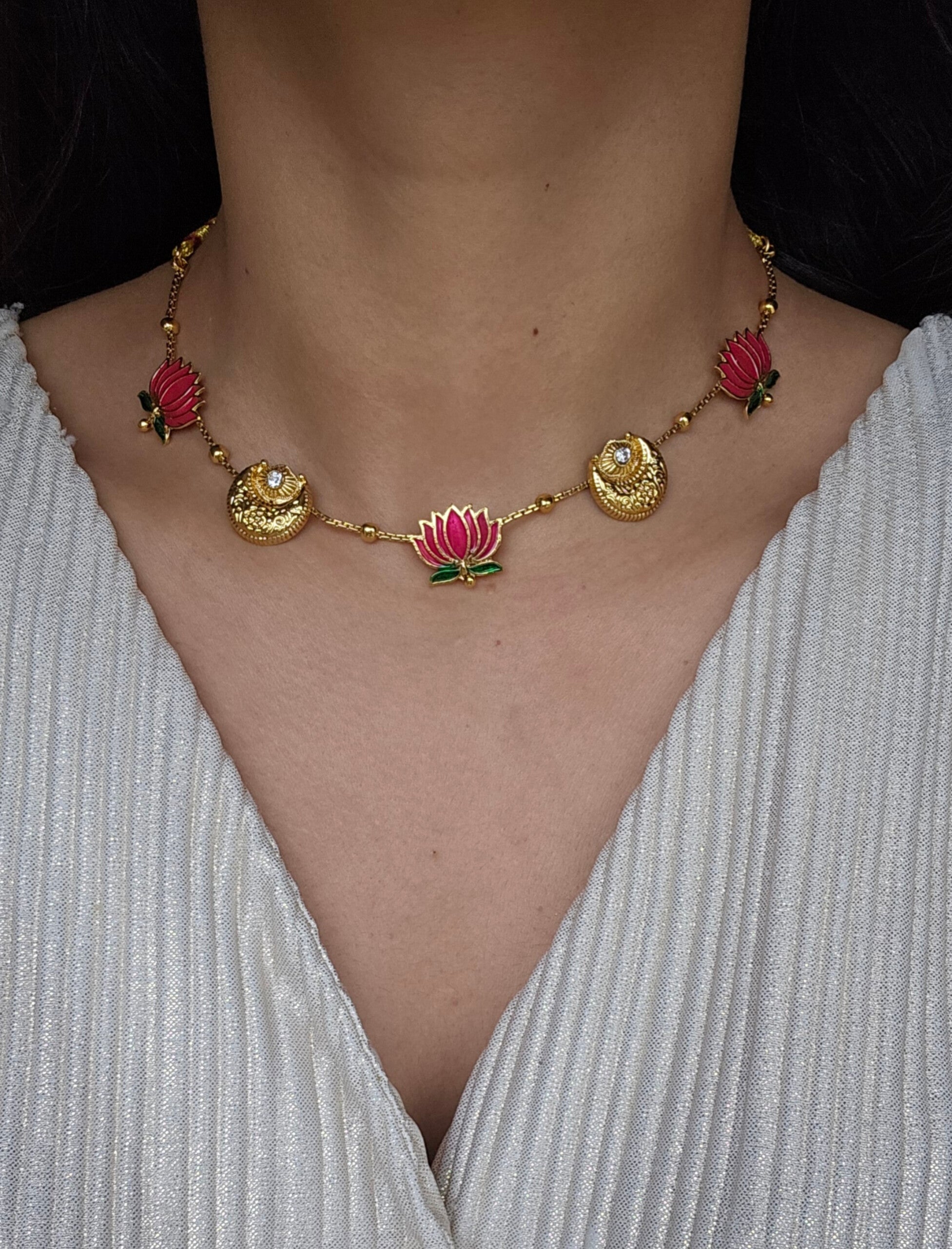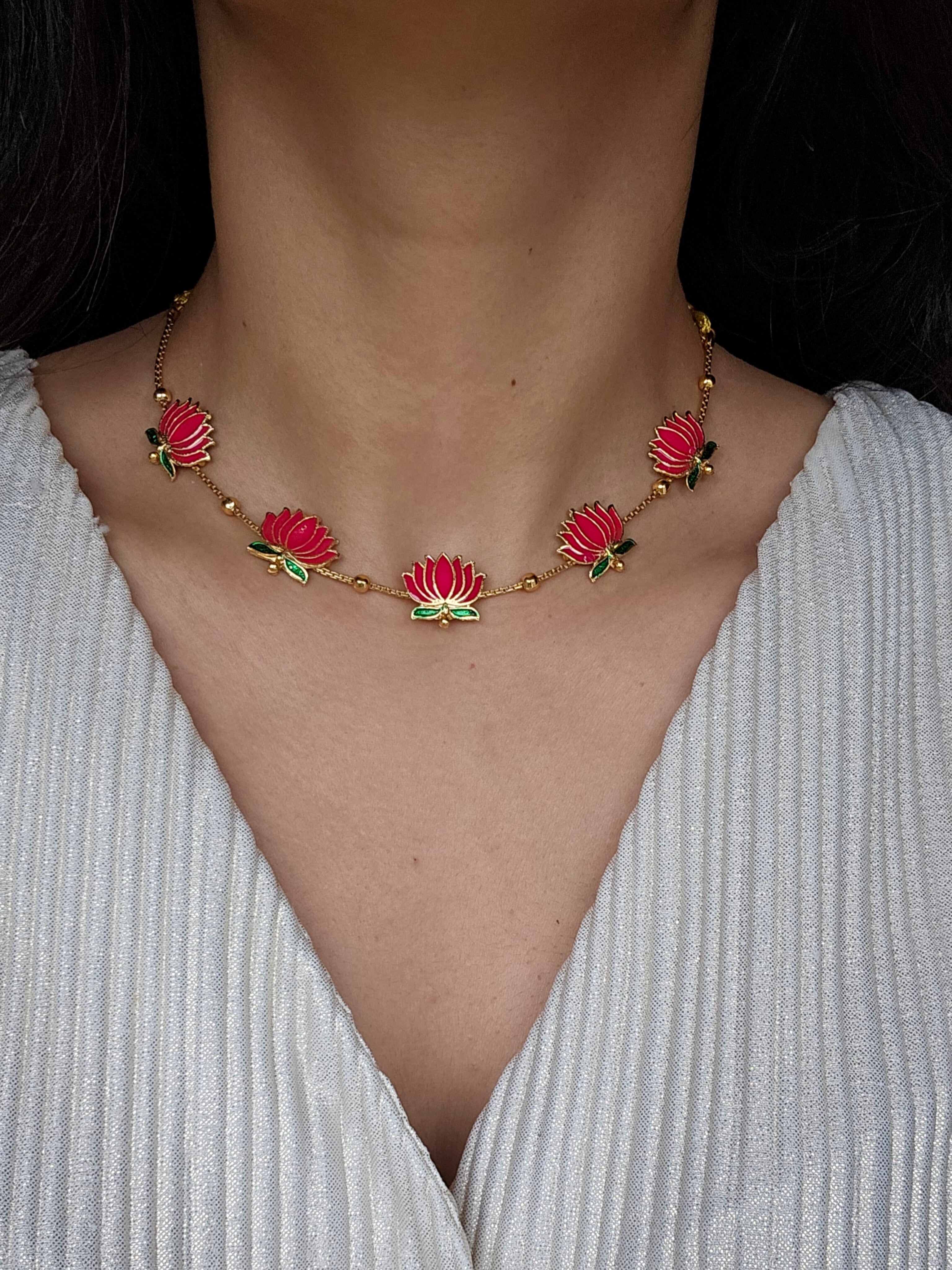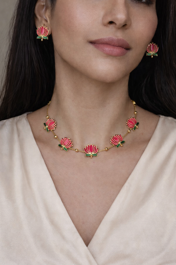 Elegant gold-tone choker featuring pink enamel lotus motifs. Lightweight and perfect for festive or wedding wear. Comes with matching 2 cm lotus stud earrings.