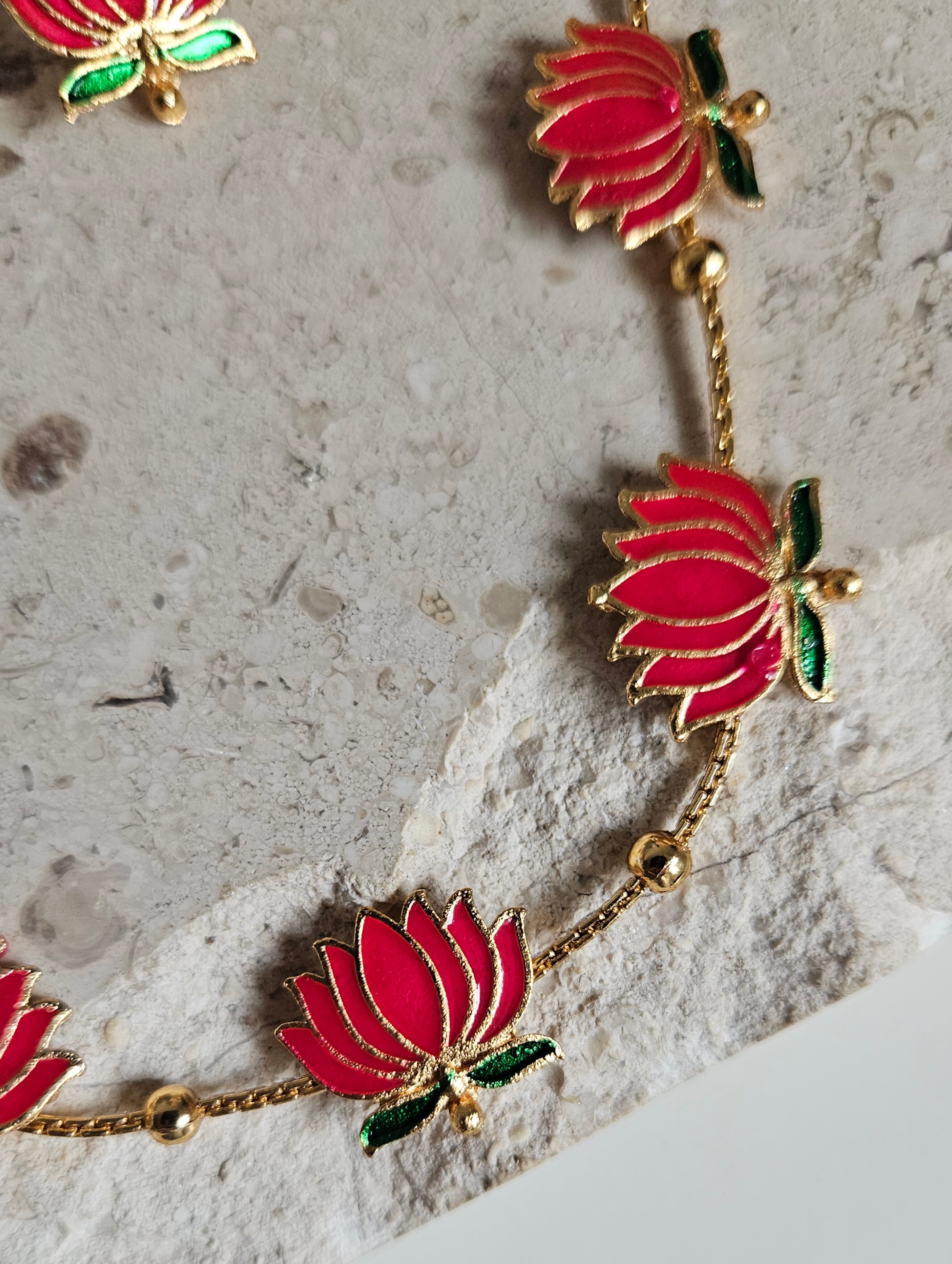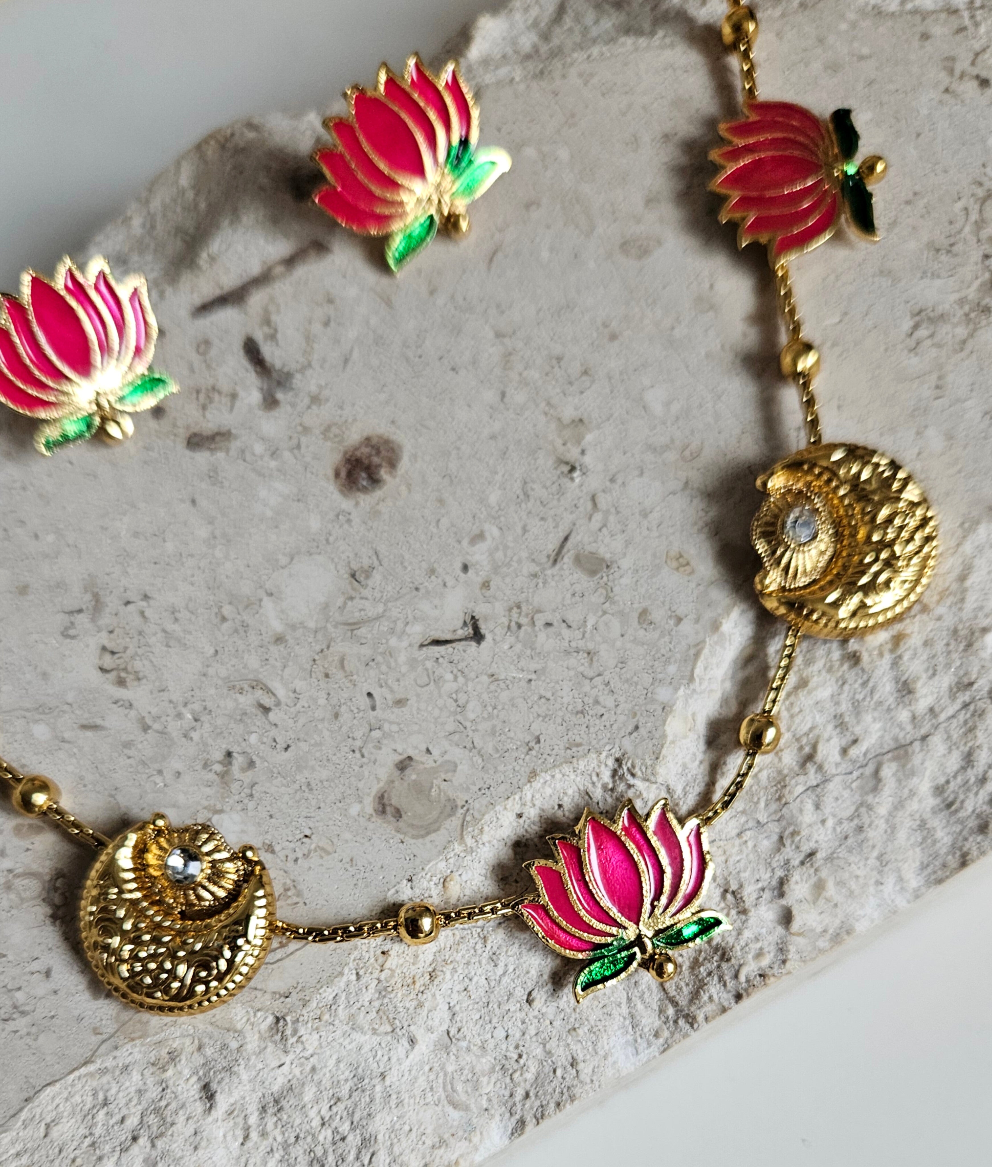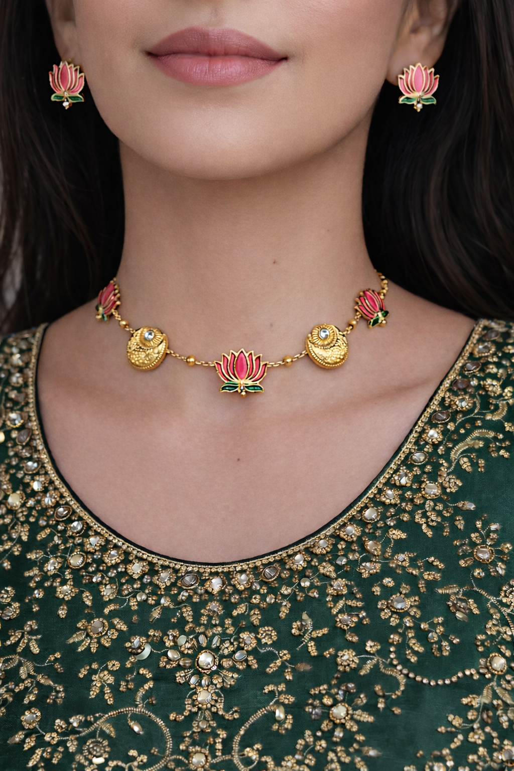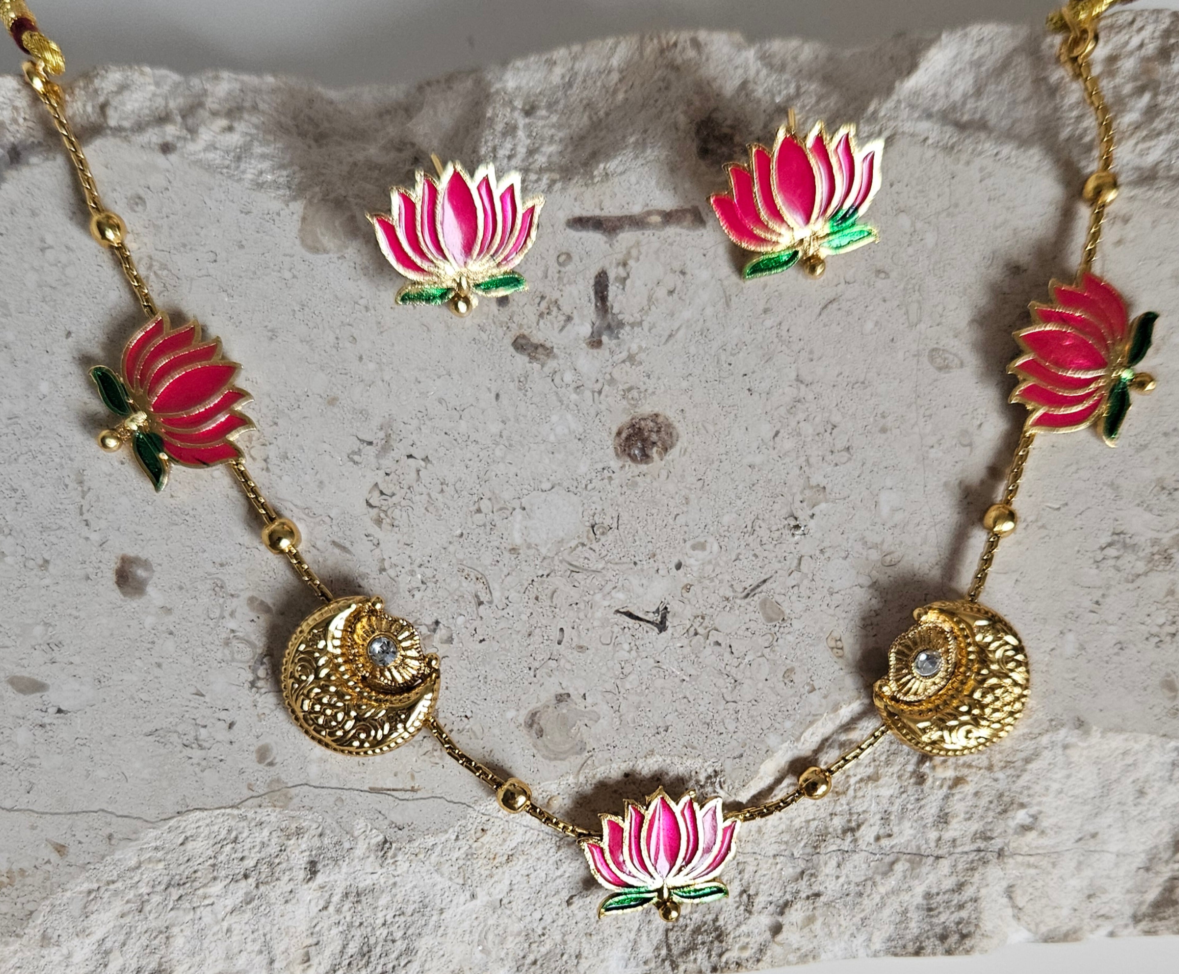 Elegant gold-tone choker featuring pink enamel lotus motifs. Lightweight and perfect for festive or wedding wear. Comes with matching 2 cm lotus stud earrings.