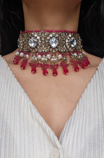 Gold Plated Choker/Necklace set Studded With Unique Hand Crafted Meena kundan, coloured Stones and premium quality Beads and Pearls.