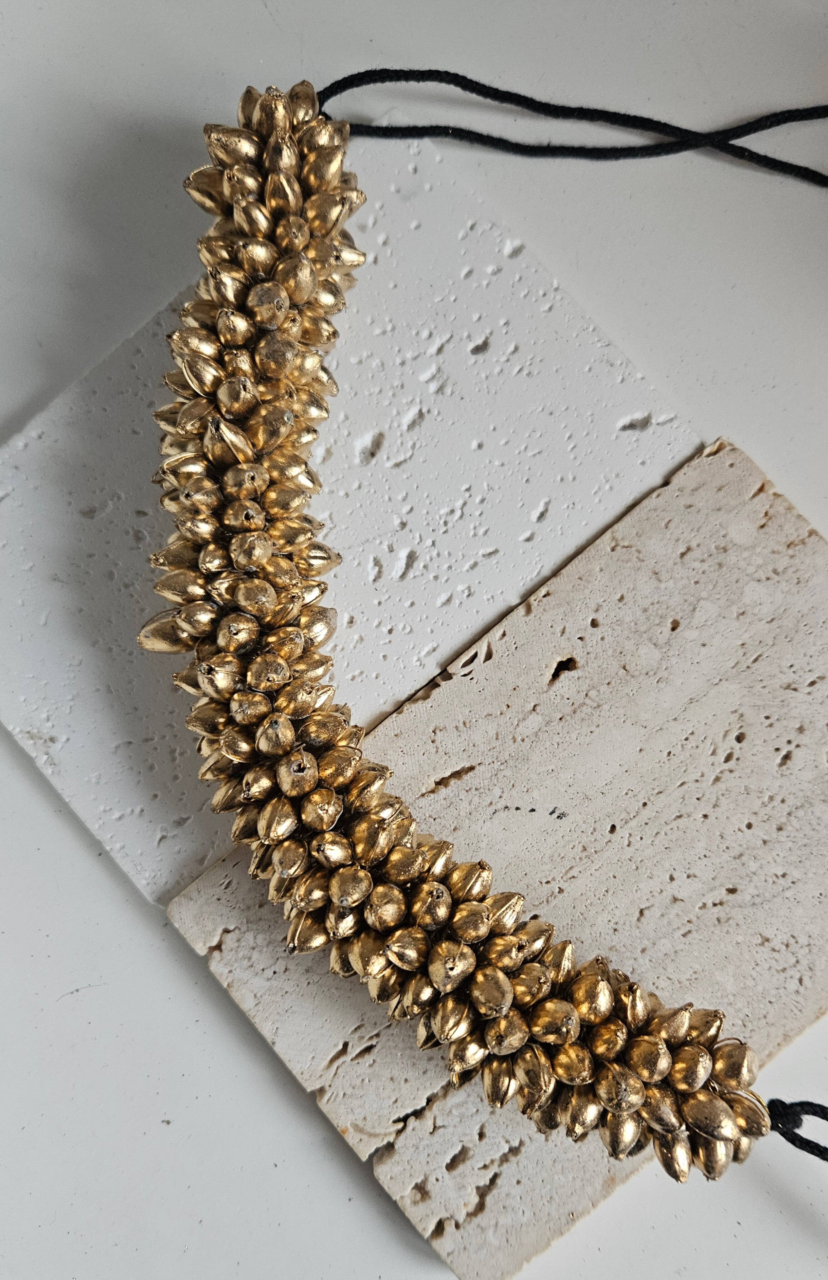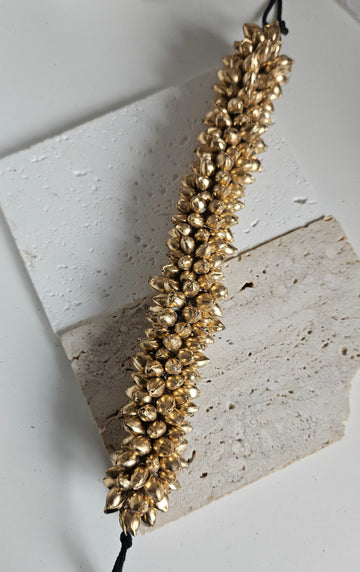 A flexible gold gajra that comfortably wraps around the bun for a secure, elegant finish.