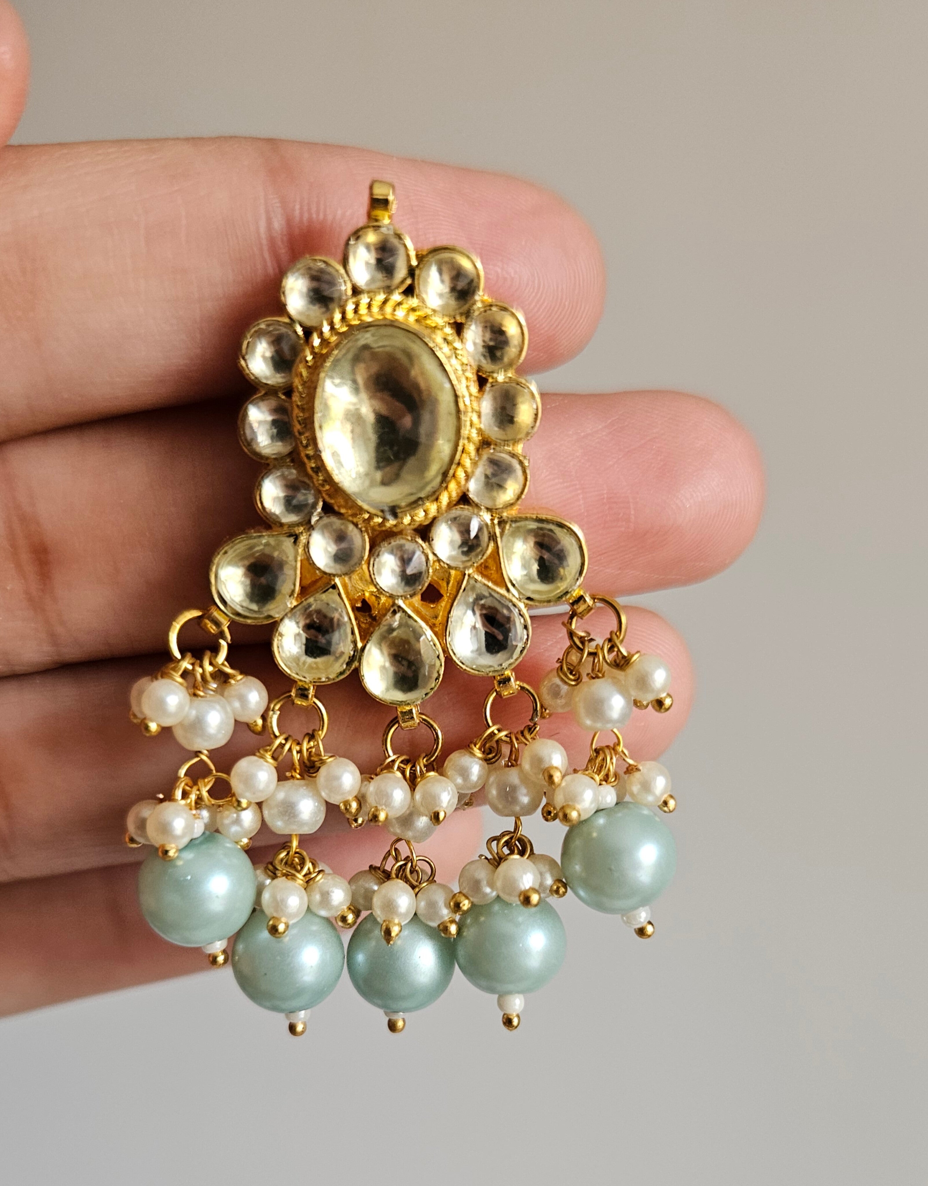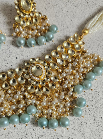 Featuring Handcrafted Pachi Kundan stones and pearls, this necklace set is sure to make a statement.