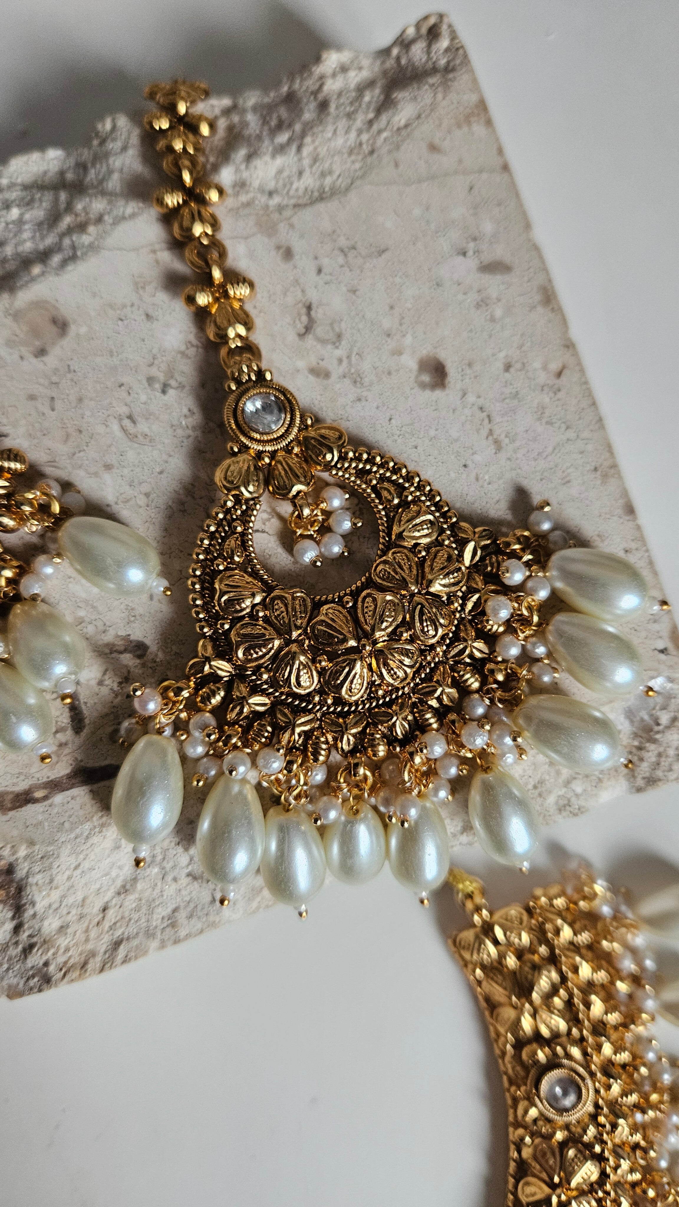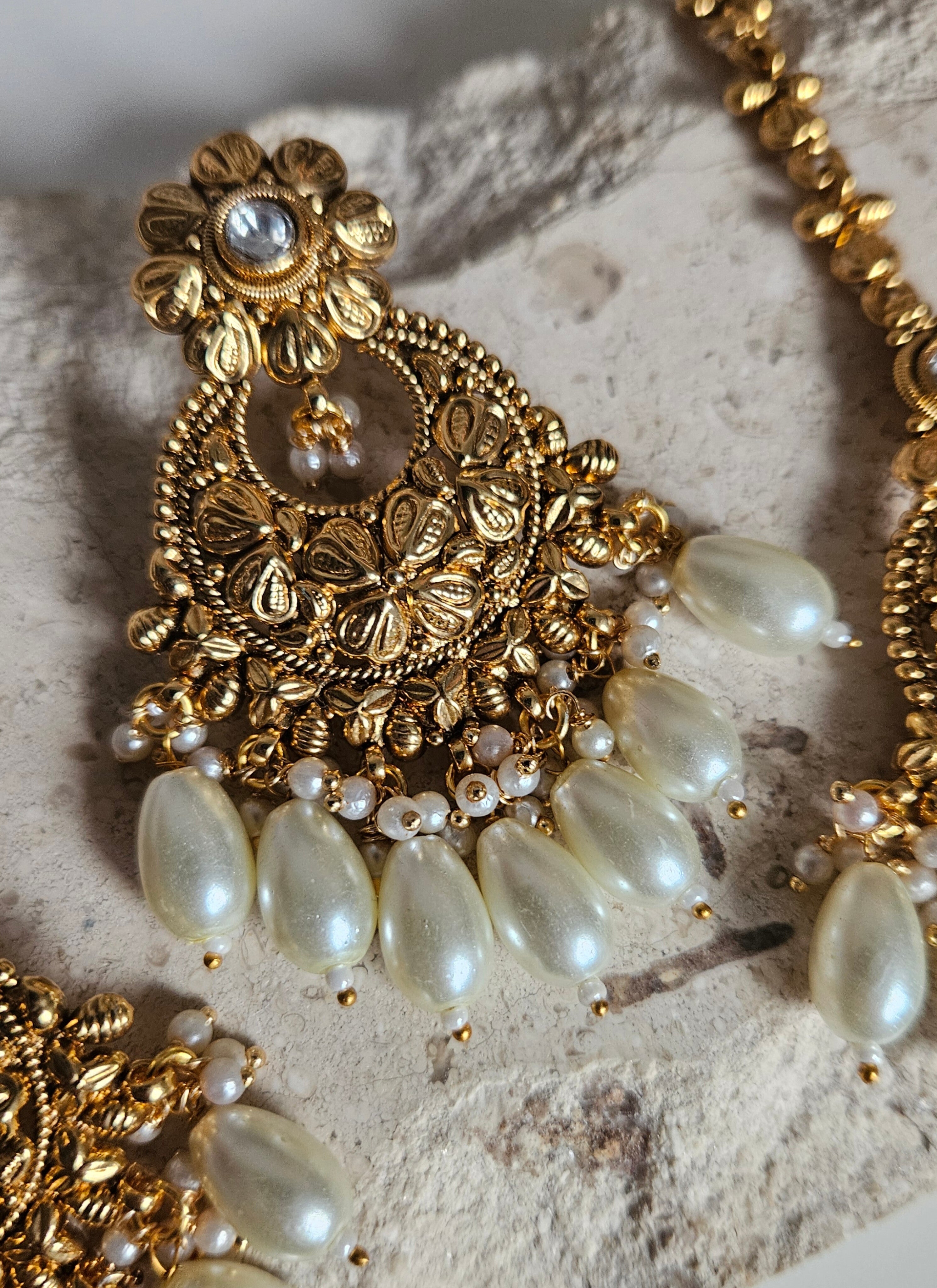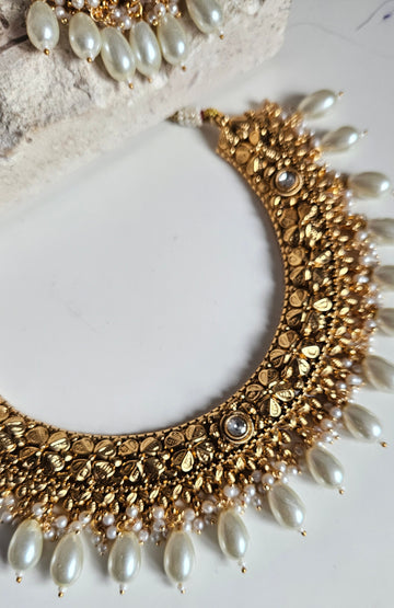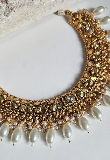 Gold Plated rajwadi polish Necklace set Studded With Pearls.