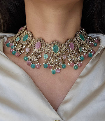 Gold tone necklace set studded with white polki stones, faux pearls and gold beads.