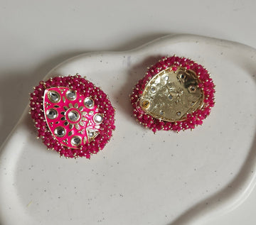 Elegant round Meenakari studs in vibrant hot pink, adorned with intricate Kundan work and delicate gold detailing. Surrounded by fine bead edging for a royal finish.