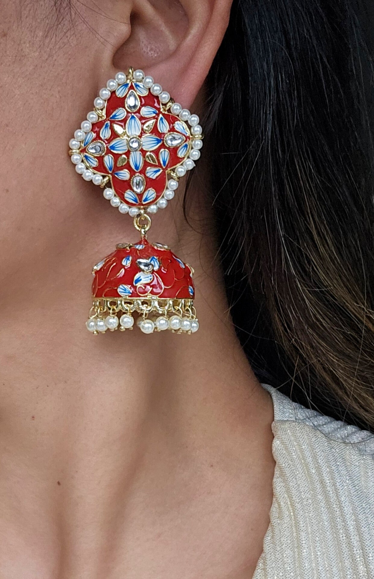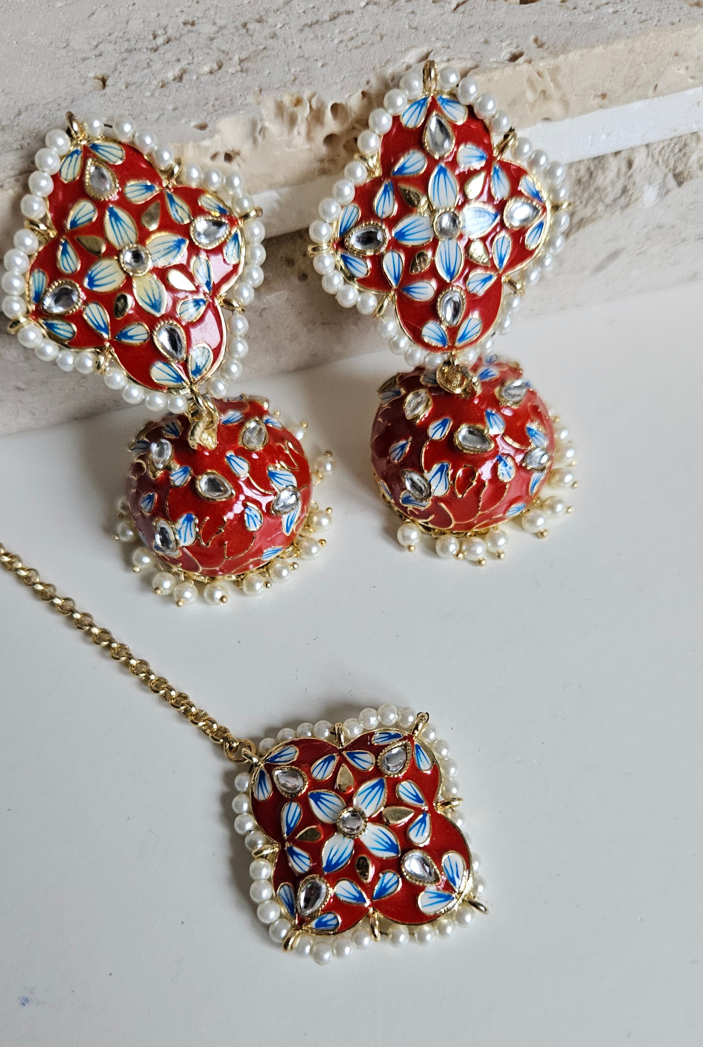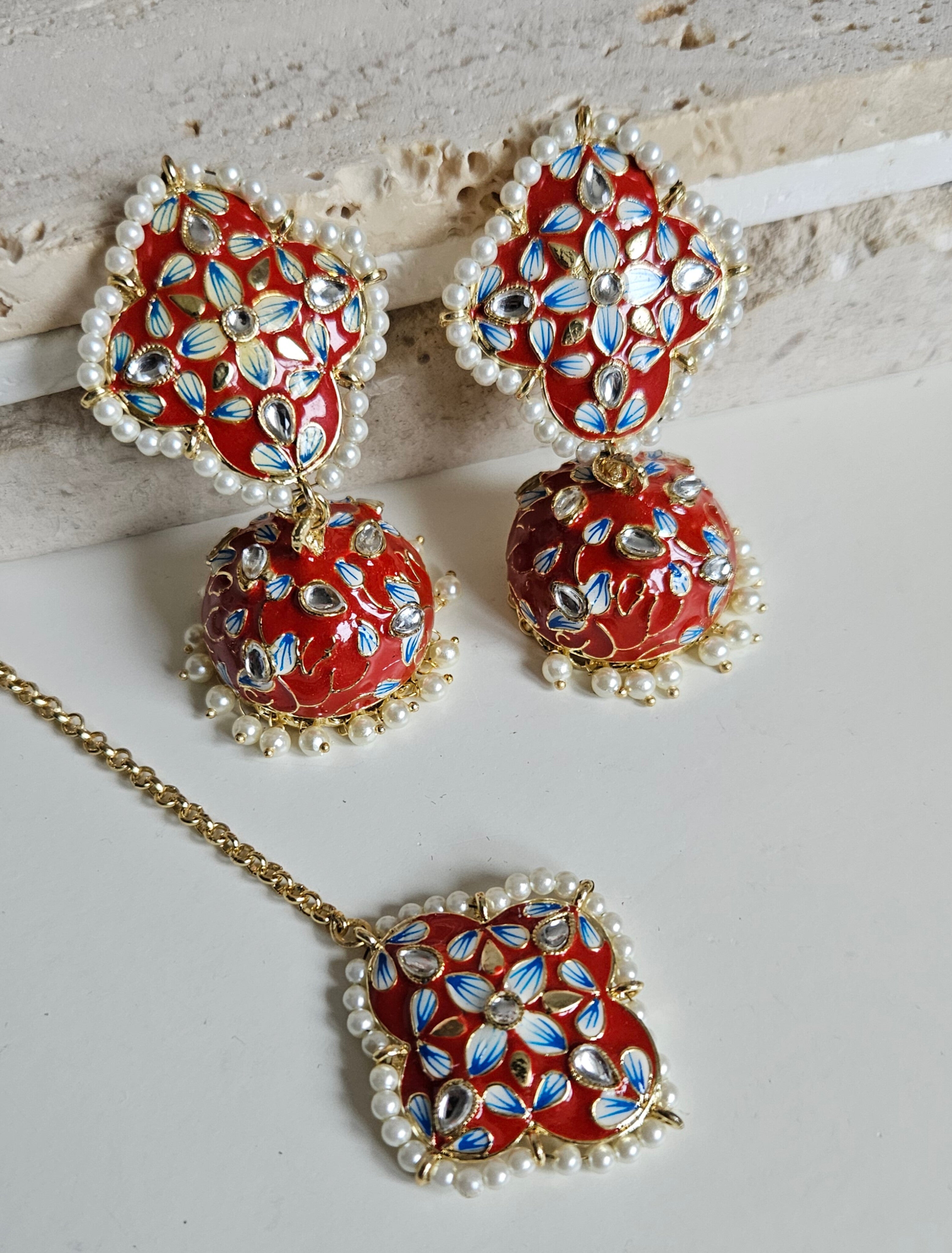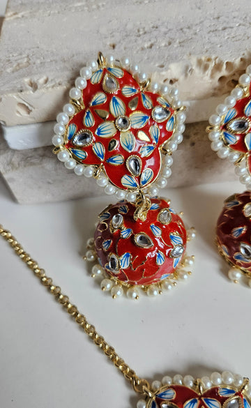 An elegant Meenakari Kundan Tikka Set crafted in a rich coral-orange enamel tone with intricate blue, white, and gold floral motifs. Each piece is bordered with delicate pearls and embellished with fine kundan stones, reflecting timeless craftsmanship. The lightweight design ensures comfort while adding a regal charm, making it an ideal choice for weddings, festive occasions, and traditional celebrations.