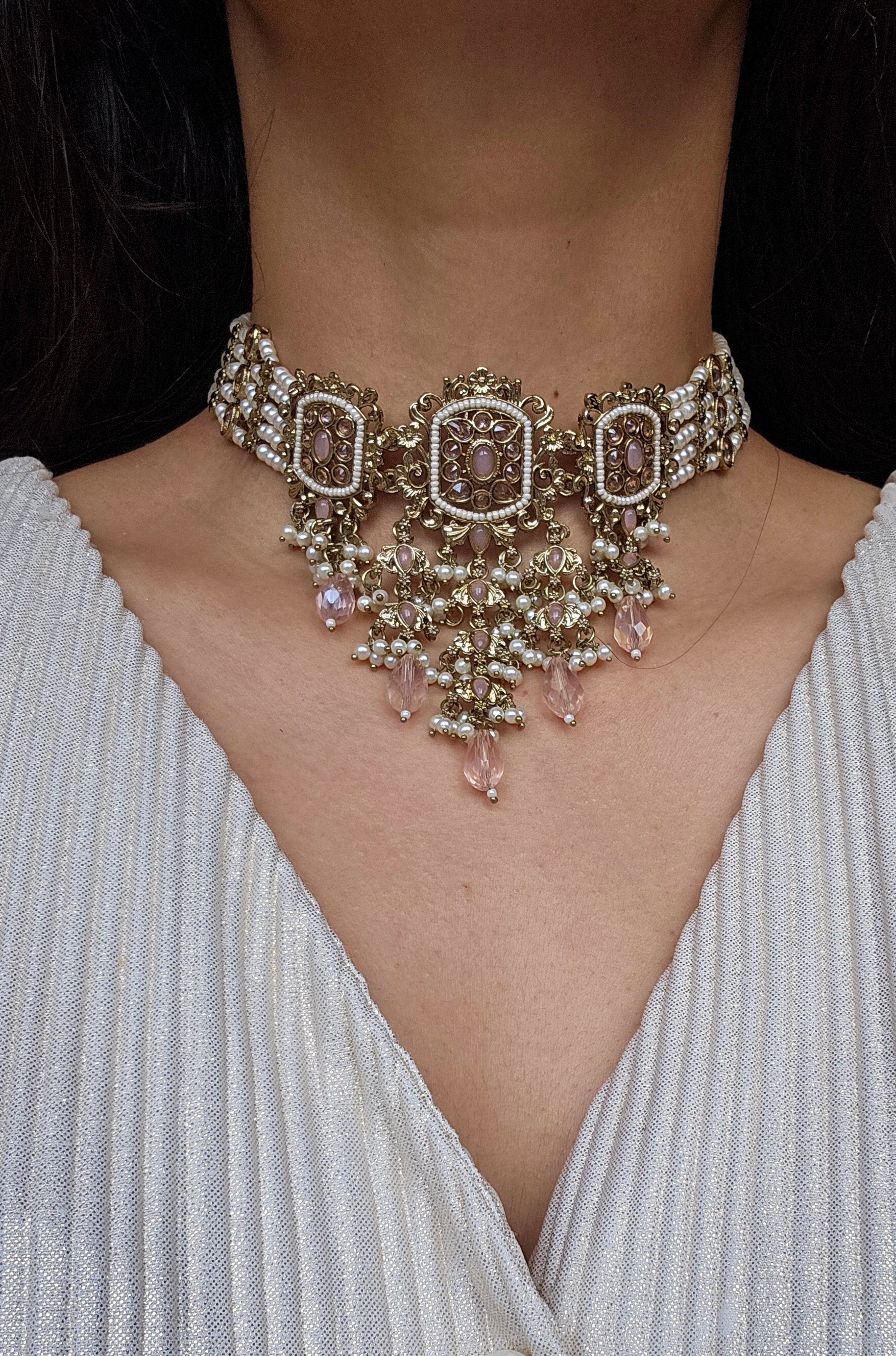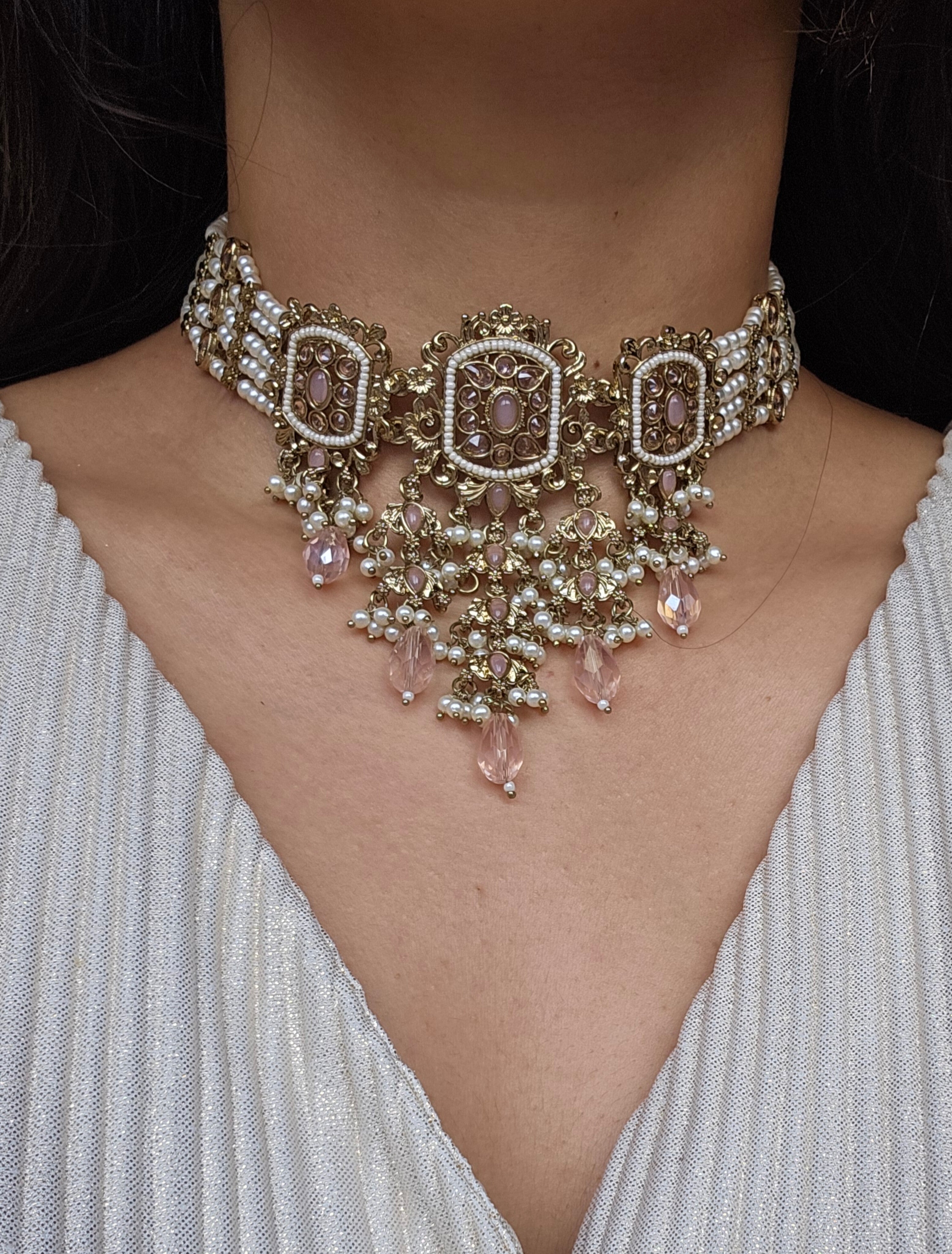 Gold tone necklace set studded with polkis, faux pearls.